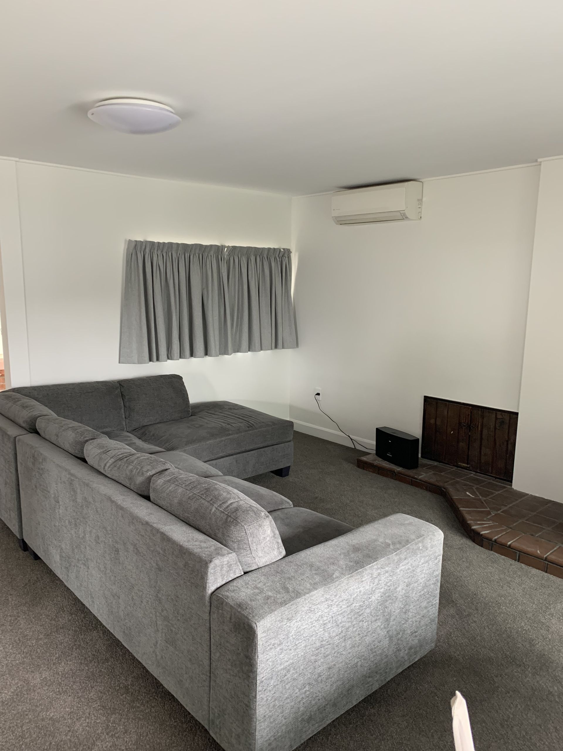 Spacious lounge with free standing fire, there is also a heat pump