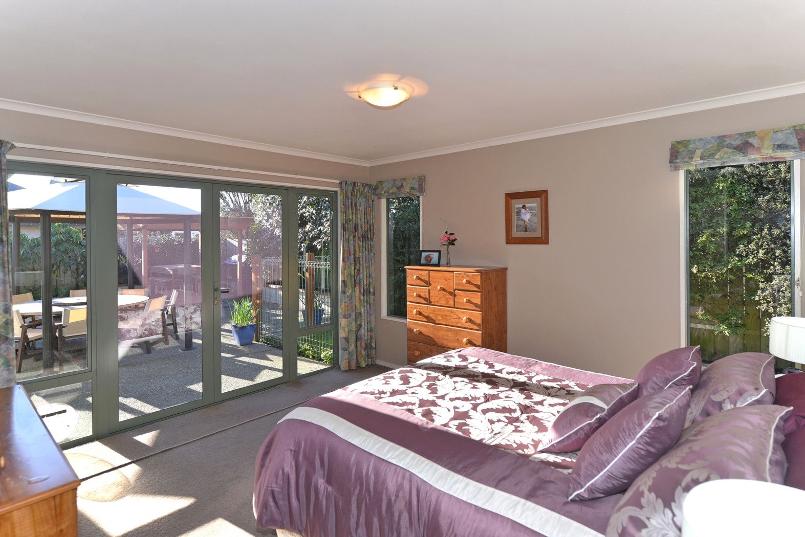 with en-suite & french doors to the private patio & gardens. Open plan living areas stream with all day sun and the