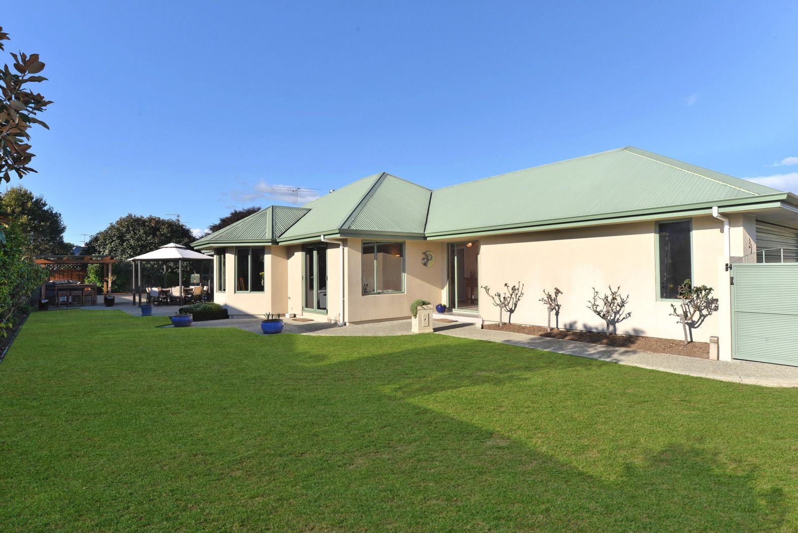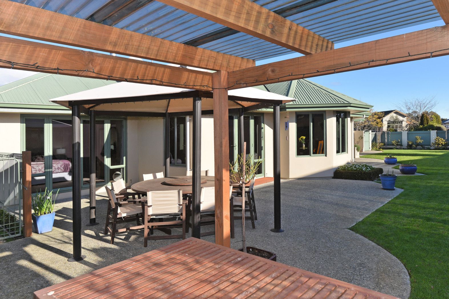 fully fenced garden with neat borders & easy care raised vegetable beds leaves time for you to entertain friends or play