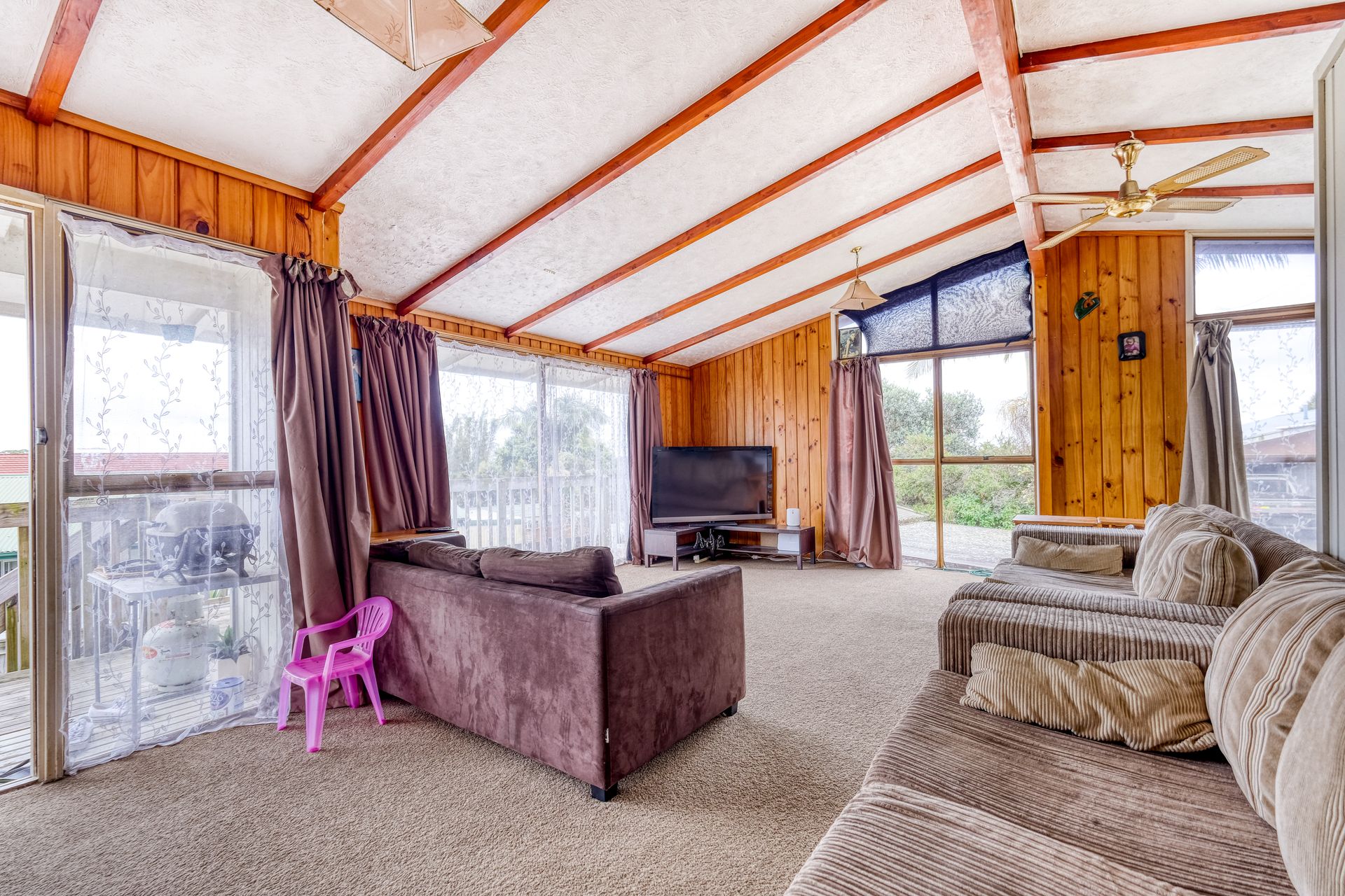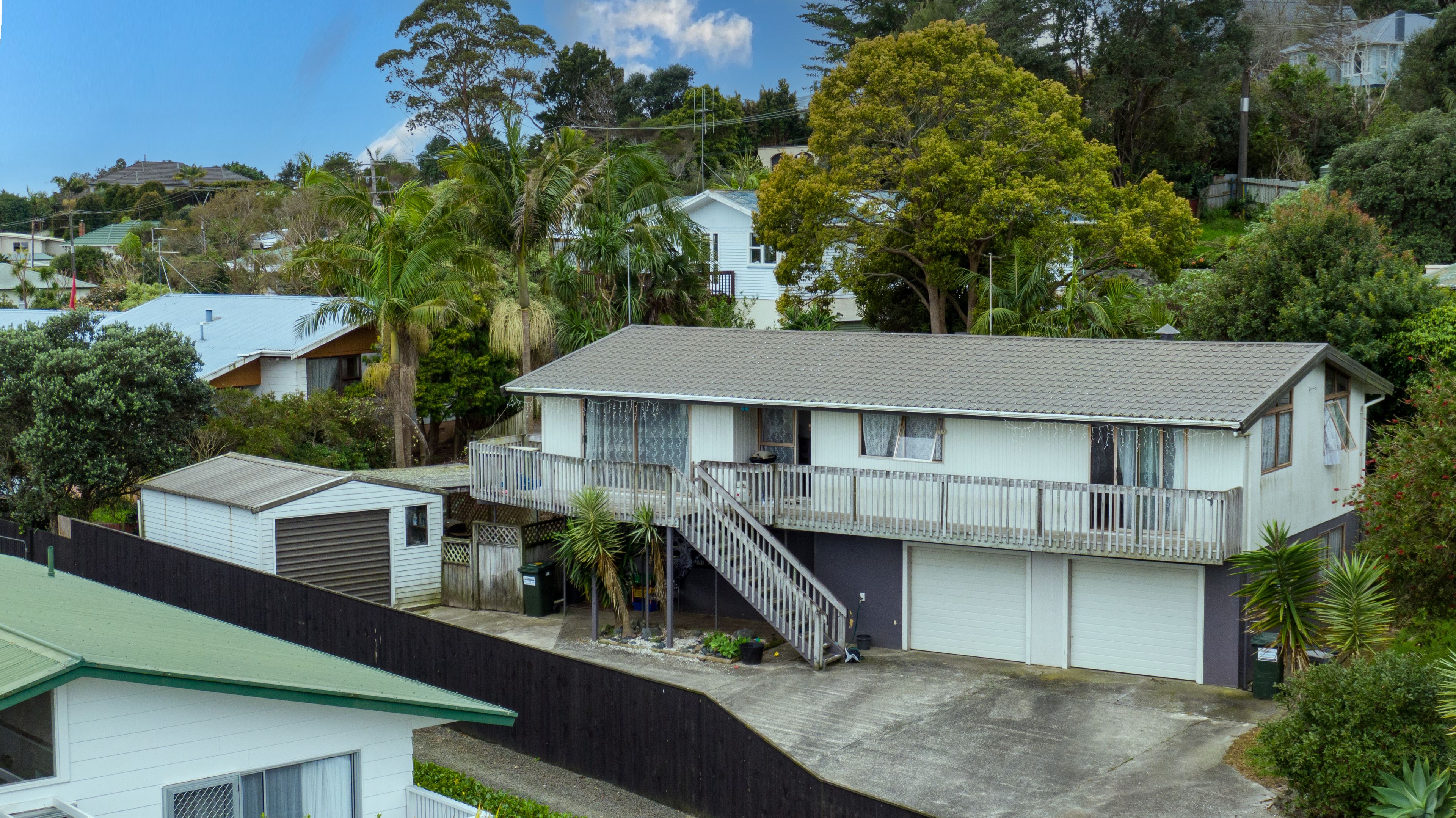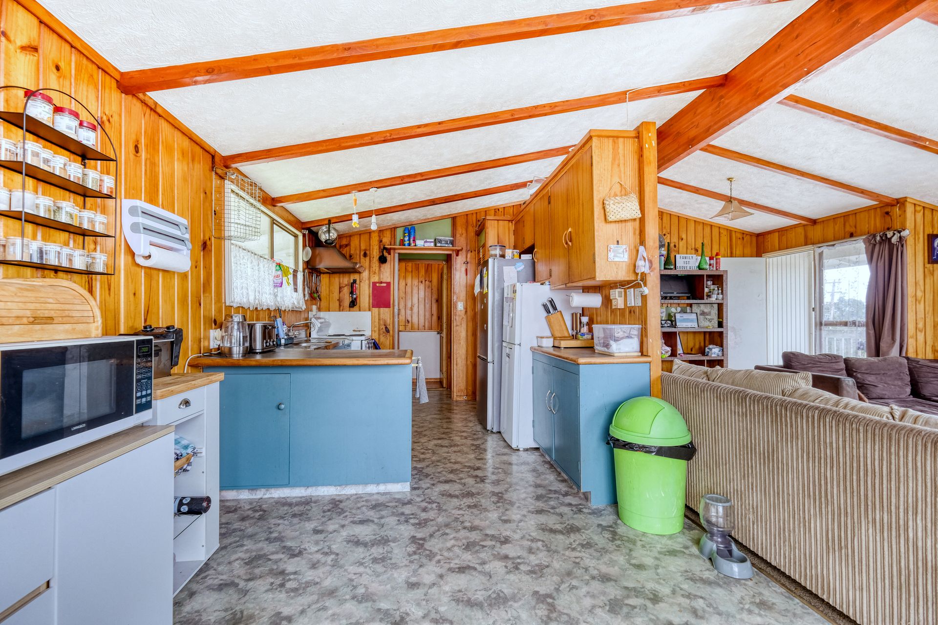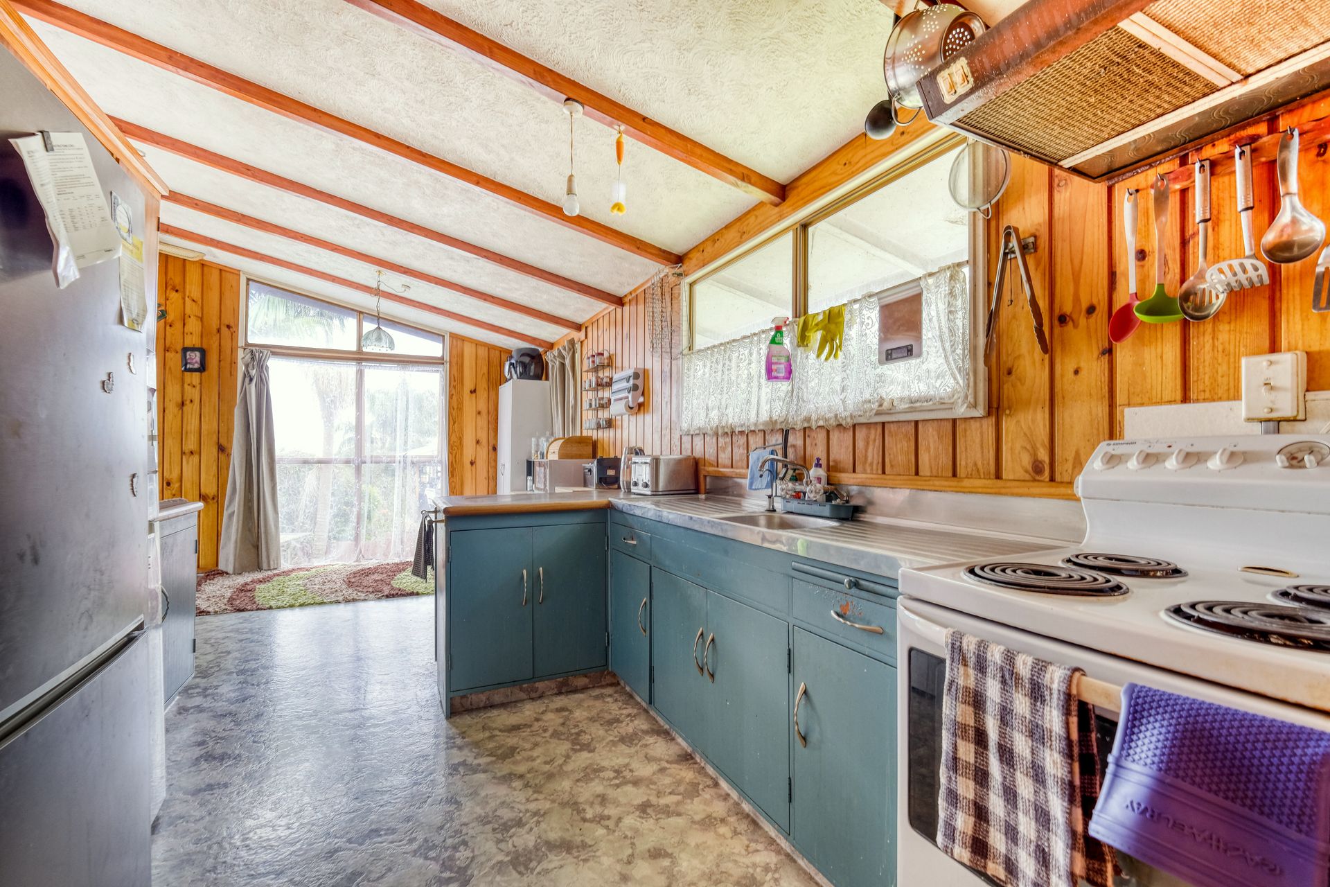 This home is situated in a very good location handy to many local amenities. The upper level features the kitchen, open plan dining/lounge area, three bedrooms with timber wall panelling on the interior walls similar to a Lockwood home, and bathroom. The long running deck accessed by the front door and living area has fantastic views overlooking Kaitaia and the coast towards 90 Mile Beach.