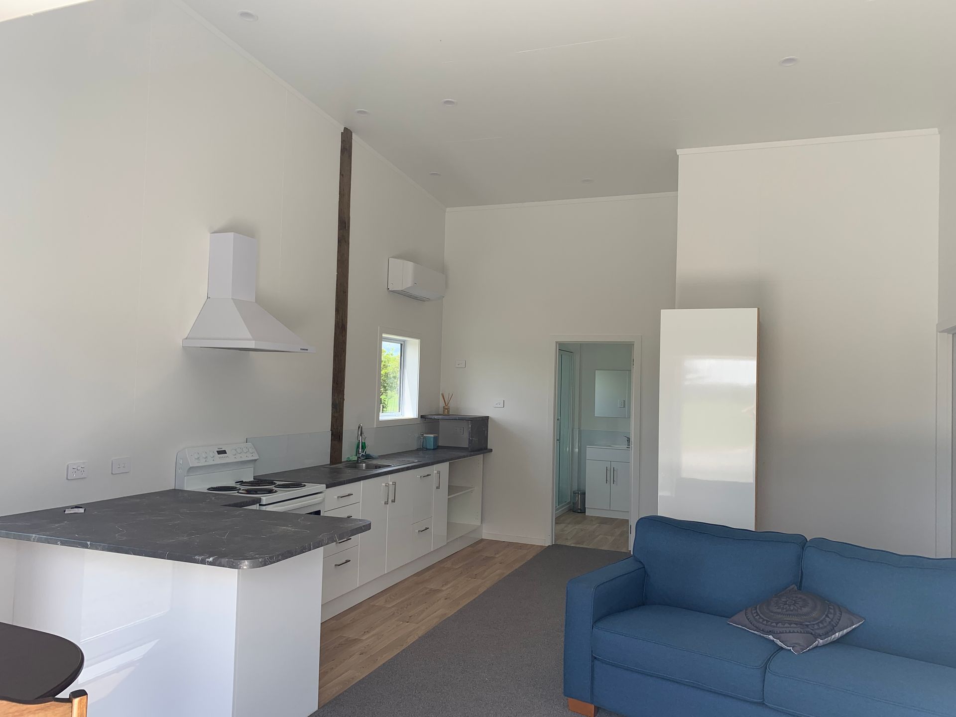 This will be nice and warm during winters, as the open plan kitchen and living area has a heat pump, windows and ranch slider are double glazed, and ceiling and walls are insulated.