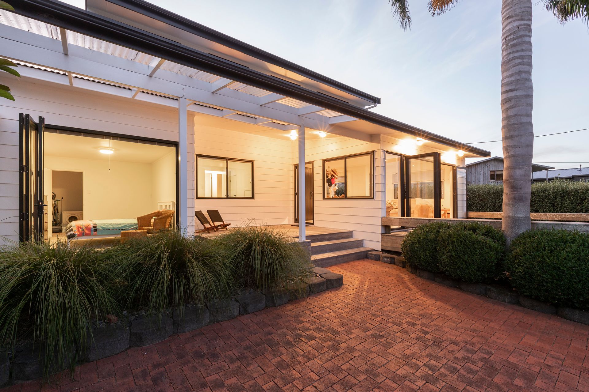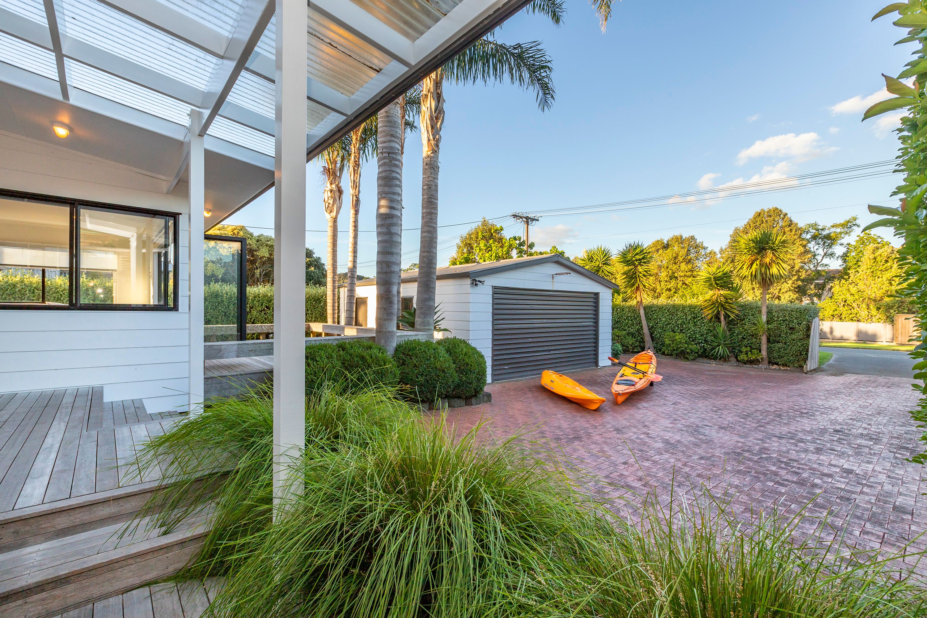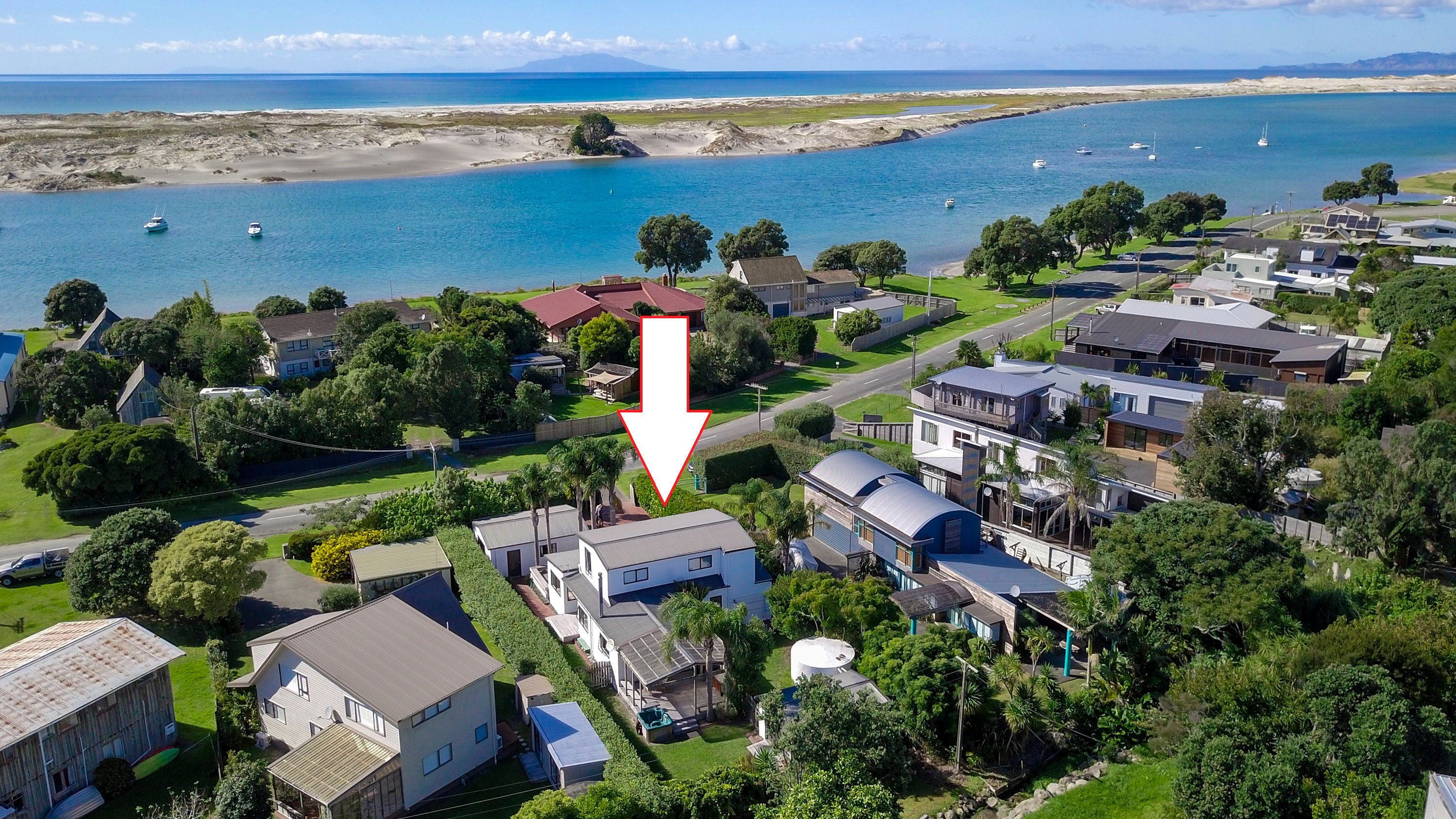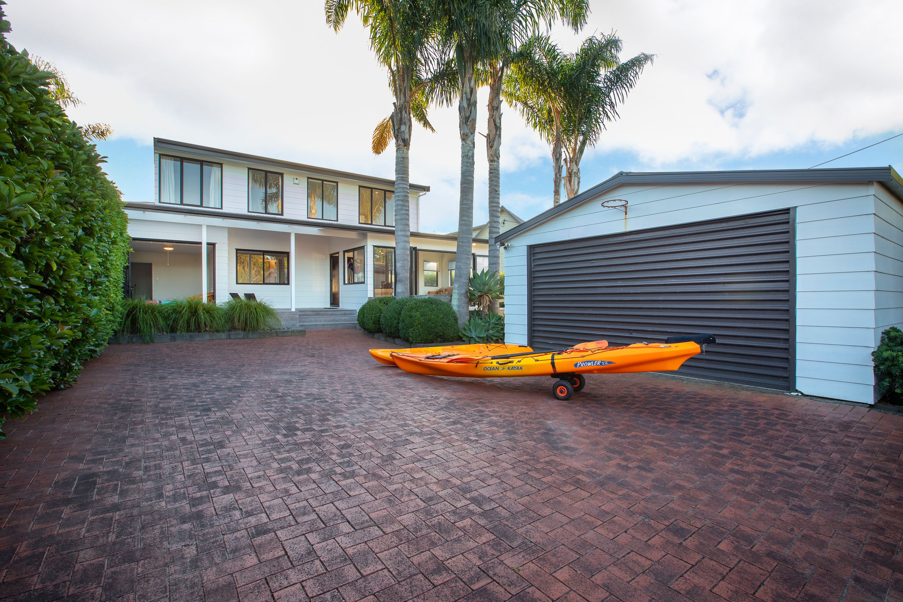 Tall palms grace this white two-storey holiday home partially hidden from passerby's, yet only metres from boat ramp, pontoon and water. This charming 238m² beach house has the coveted Alamar Crescent address, on a harbour shoreline within the golden circle of Mangawhai Heads.