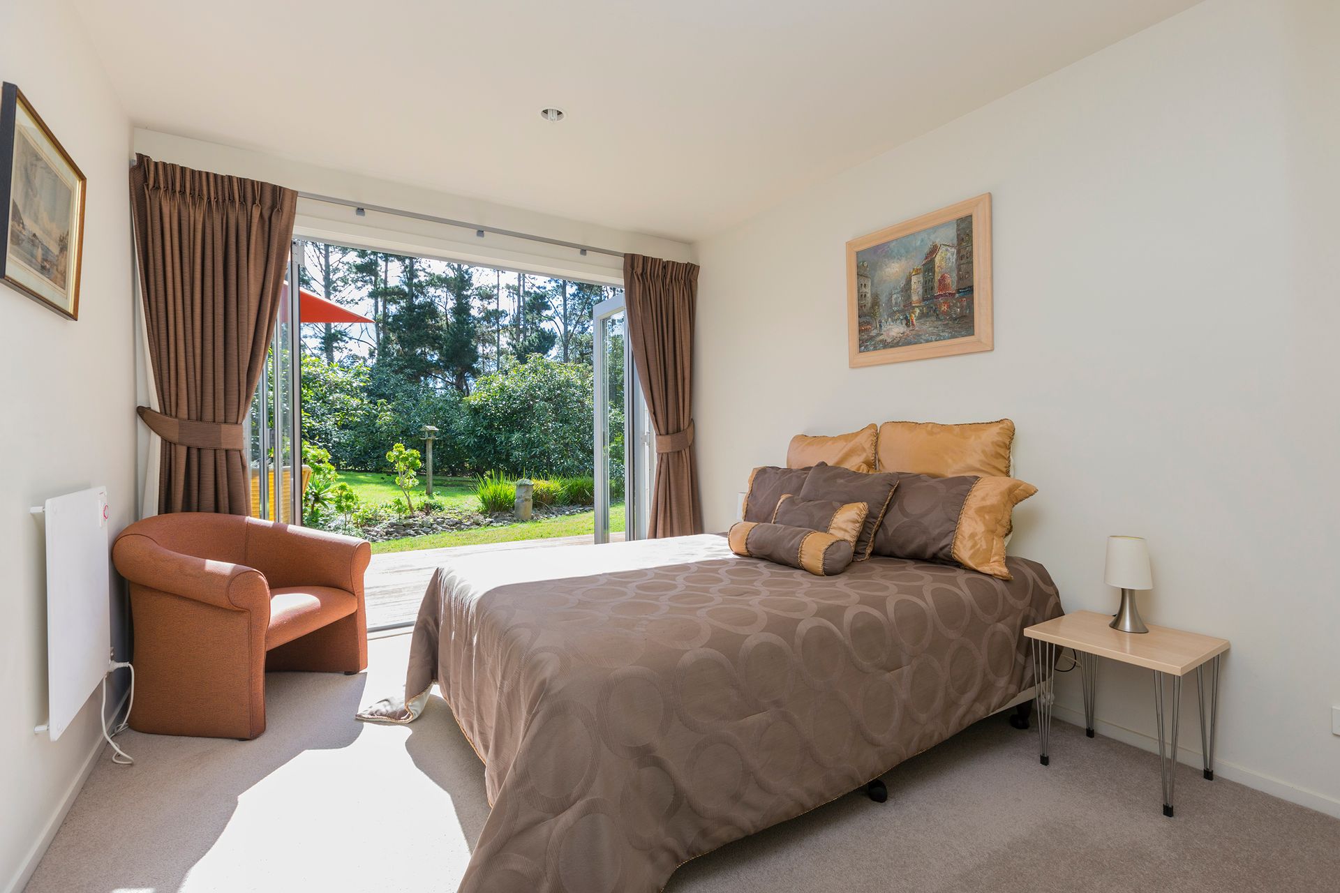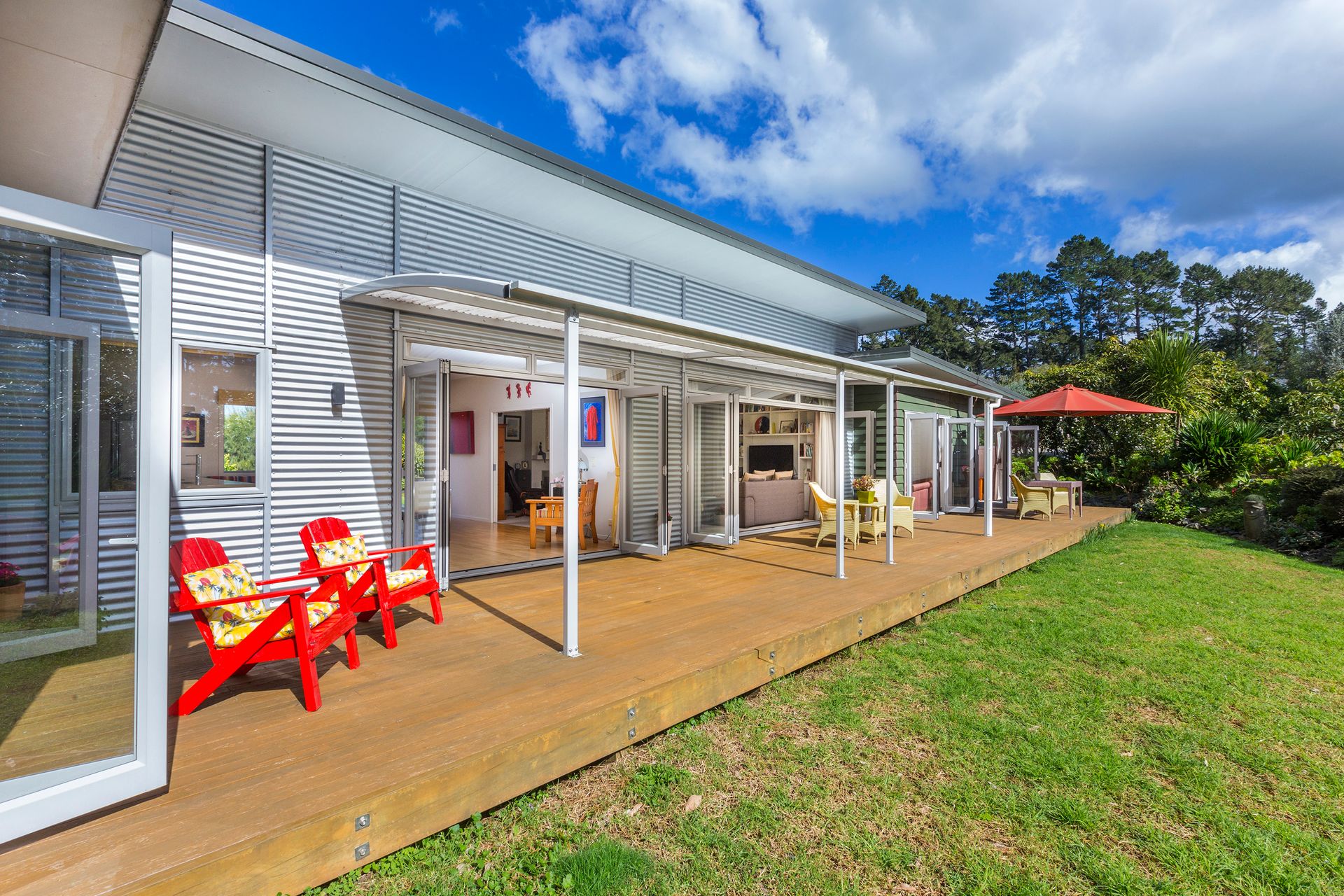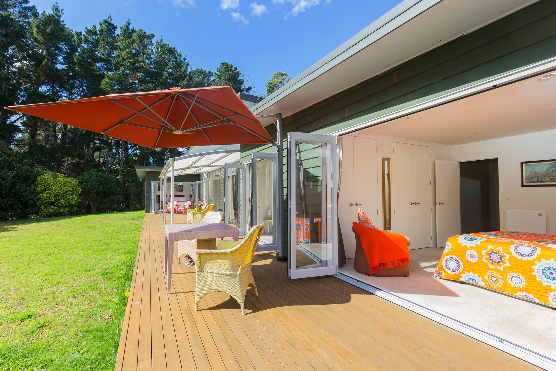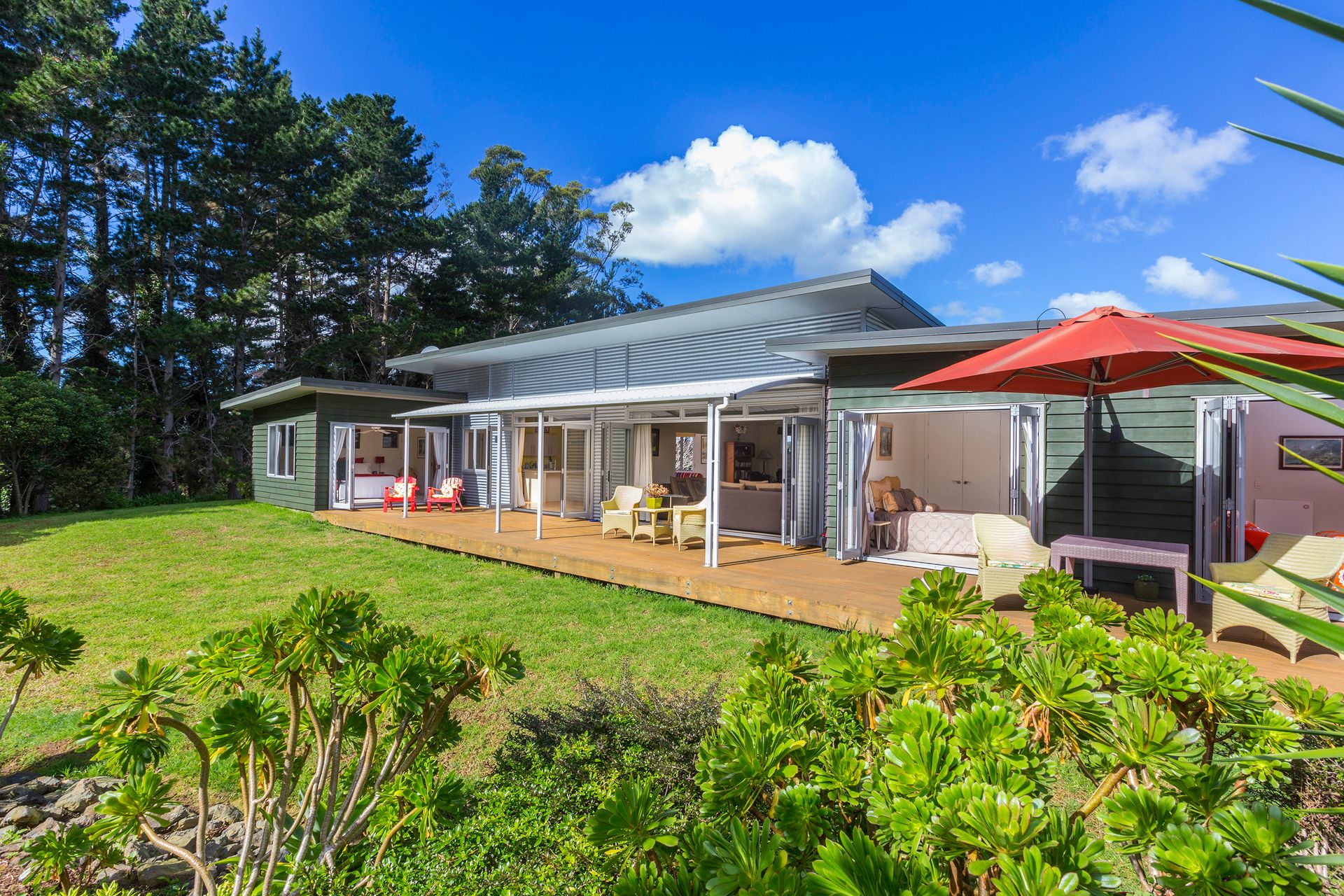 This 9 year old Cedar and Zincalume home of 224sqm is thoughtfully designed with separation of the master bedroom wing from the guest accommodation lending ideally to the bed and breakfast setup that the owners utilise. All manner of comfort is catered for with: open fireplace with wetback in the lounge; solar panels for water heating; under floor heating in the ensuite bathroom; heat pump in the open plan family, dining and kitchen area; internal access from the double garage; and an Archgola over part of the north-facing timber deck that is accessed by not only via the living areas but all bedrooms.