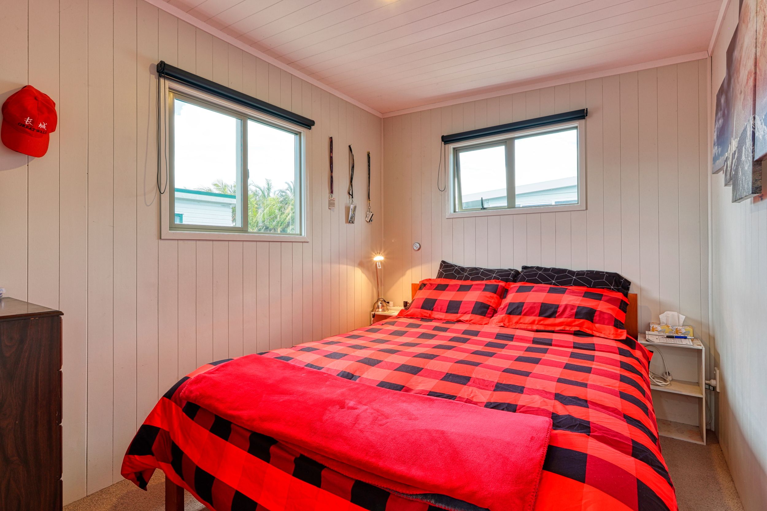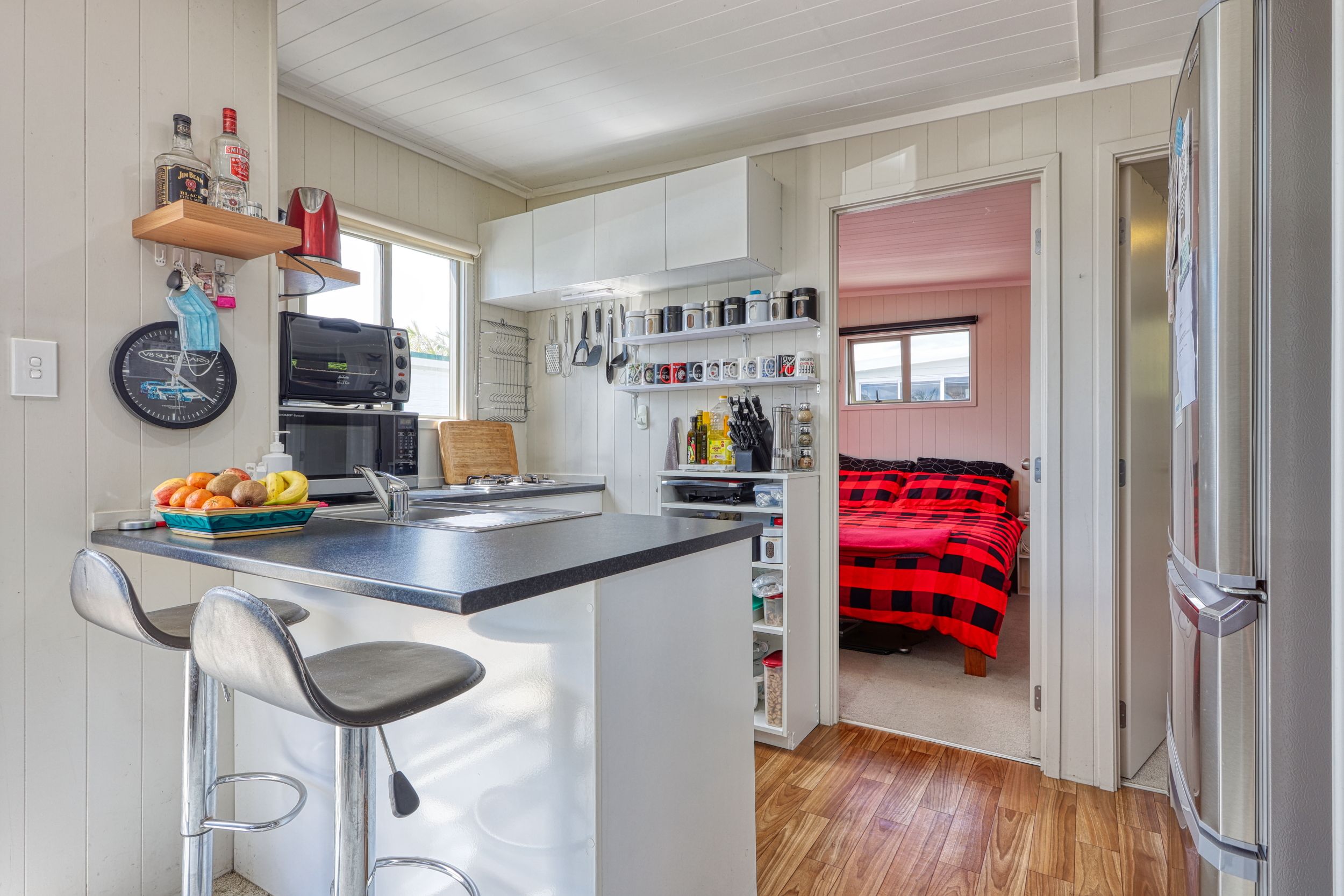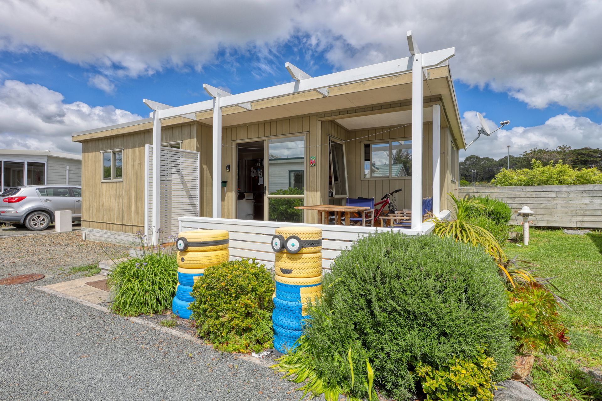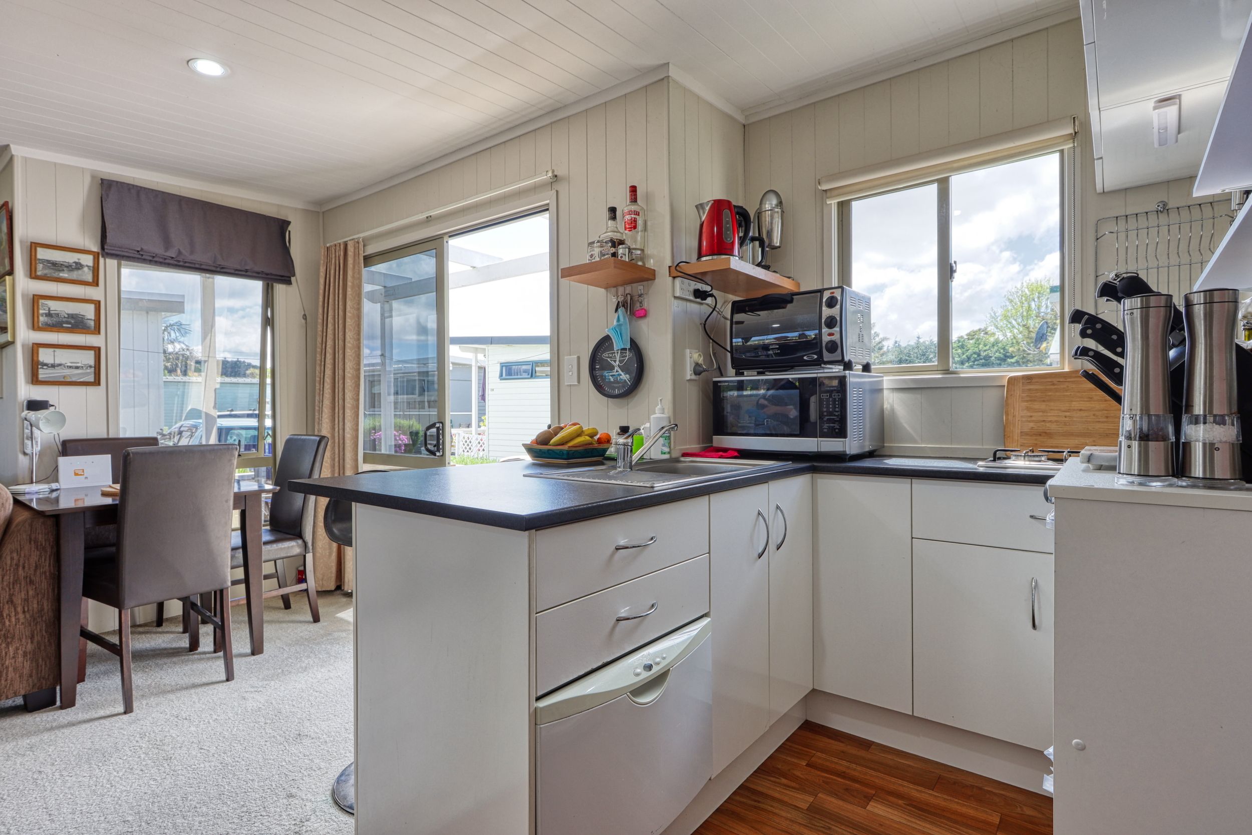 A must see is this two bedroom cabin with a sunny aspect as it faces north and a window view to the south over the playing fields of Mangawhai Domain. Beachy vibe here with the grooved plywood interior walls. With an adjacent car park, and a deck for dining al fresco or watching the world go by all weather with partial roof coverage, what more could you want. Start enjoying this brilliant resort lifestyle with this handy holiday bolt-hole.