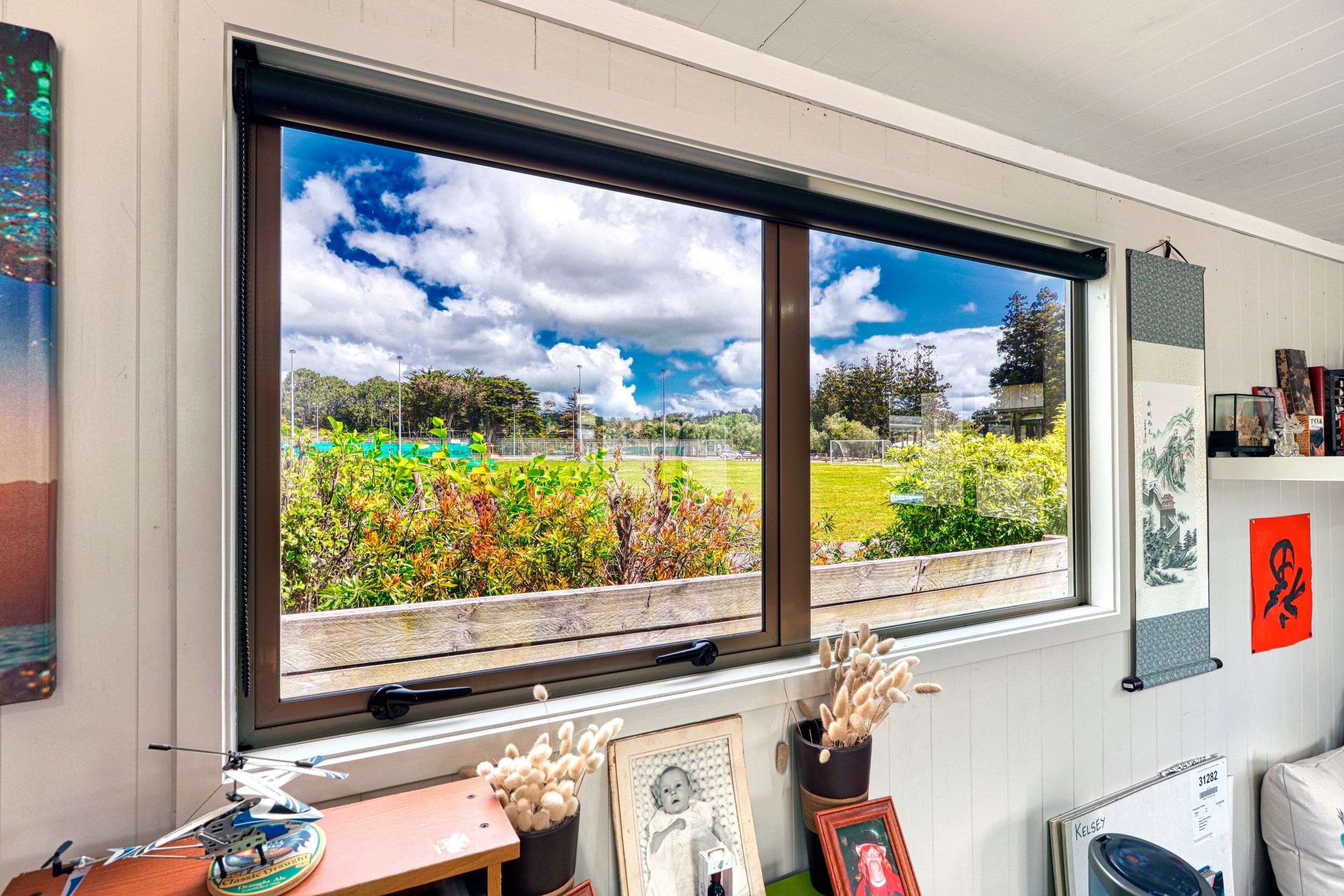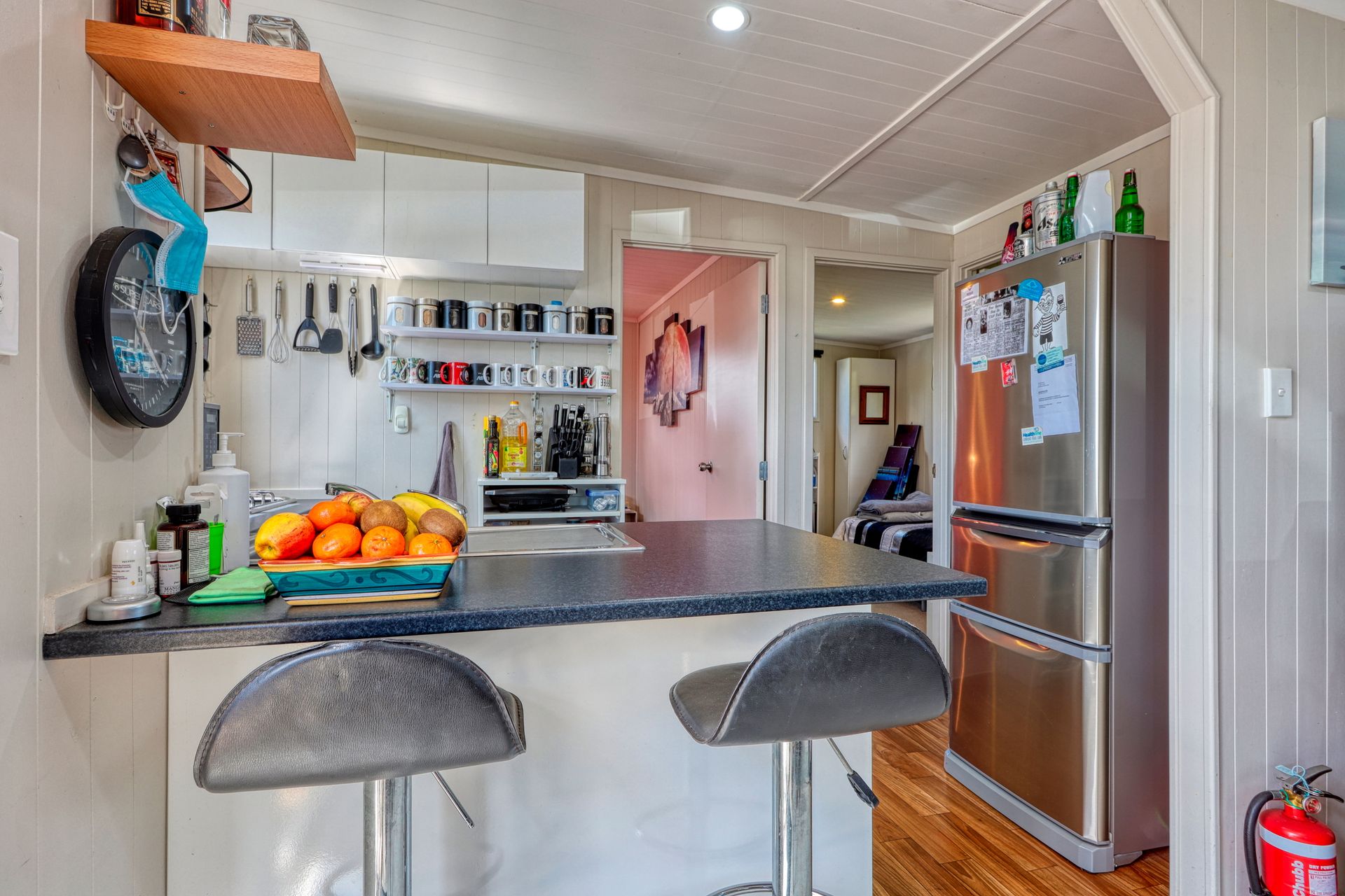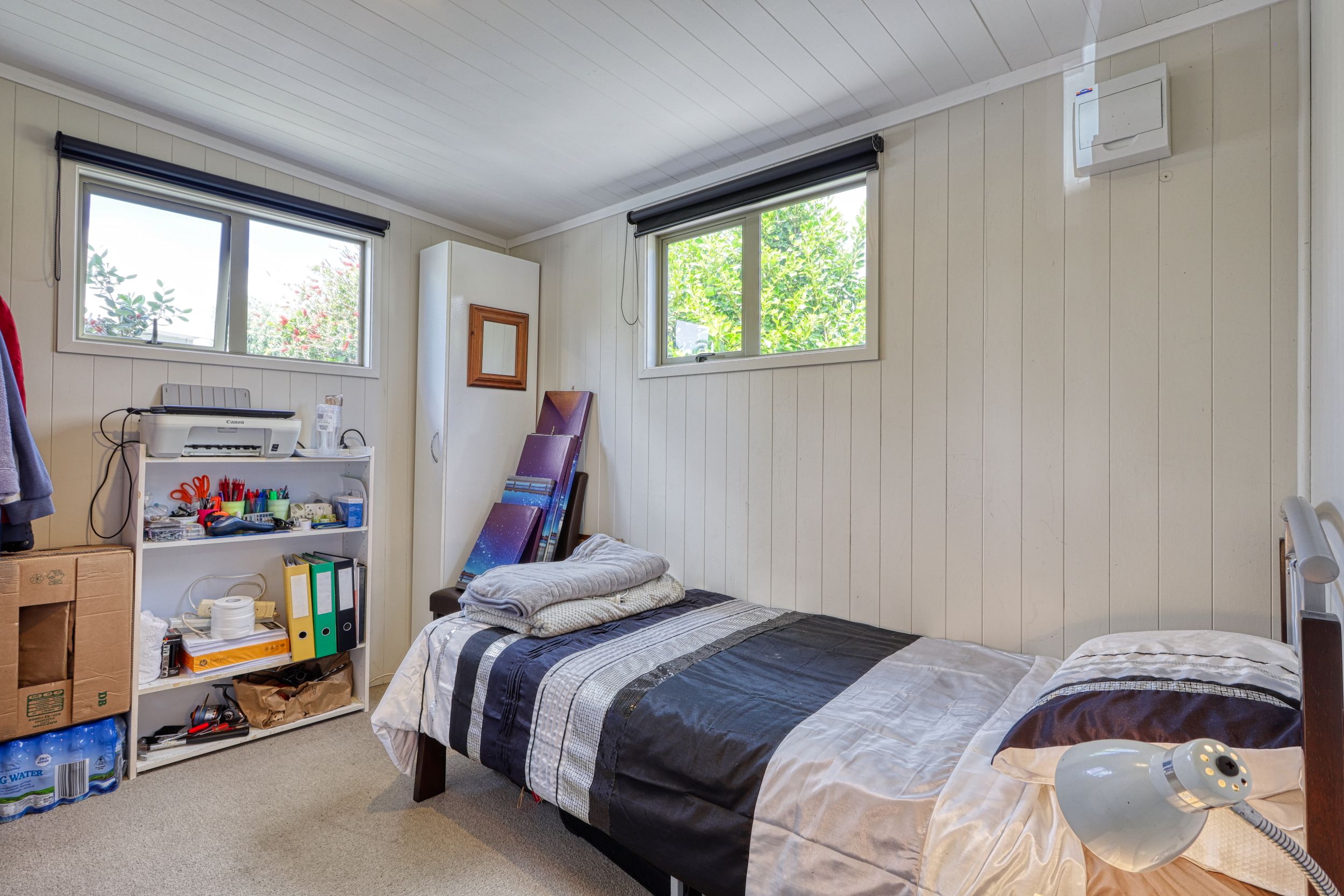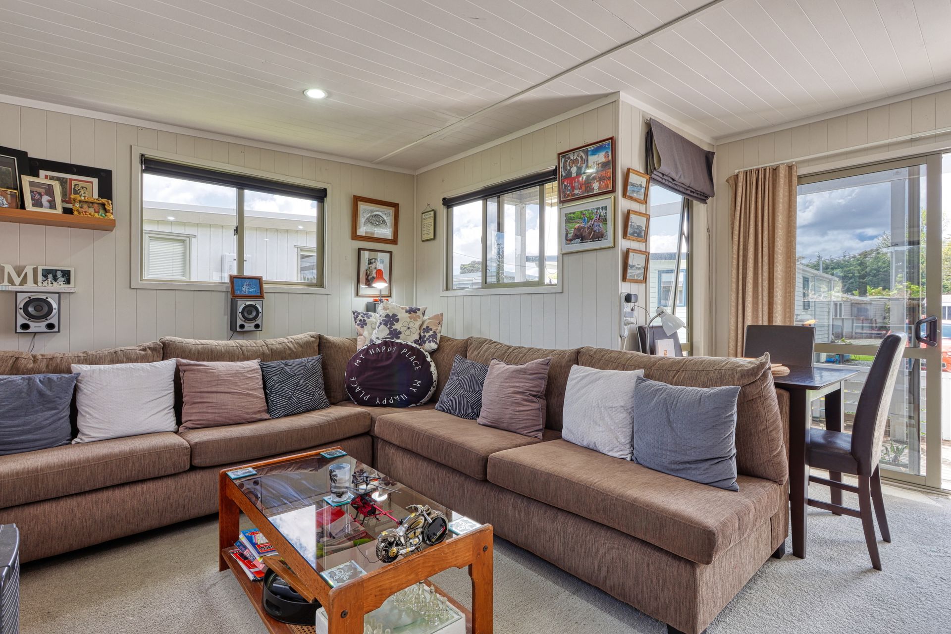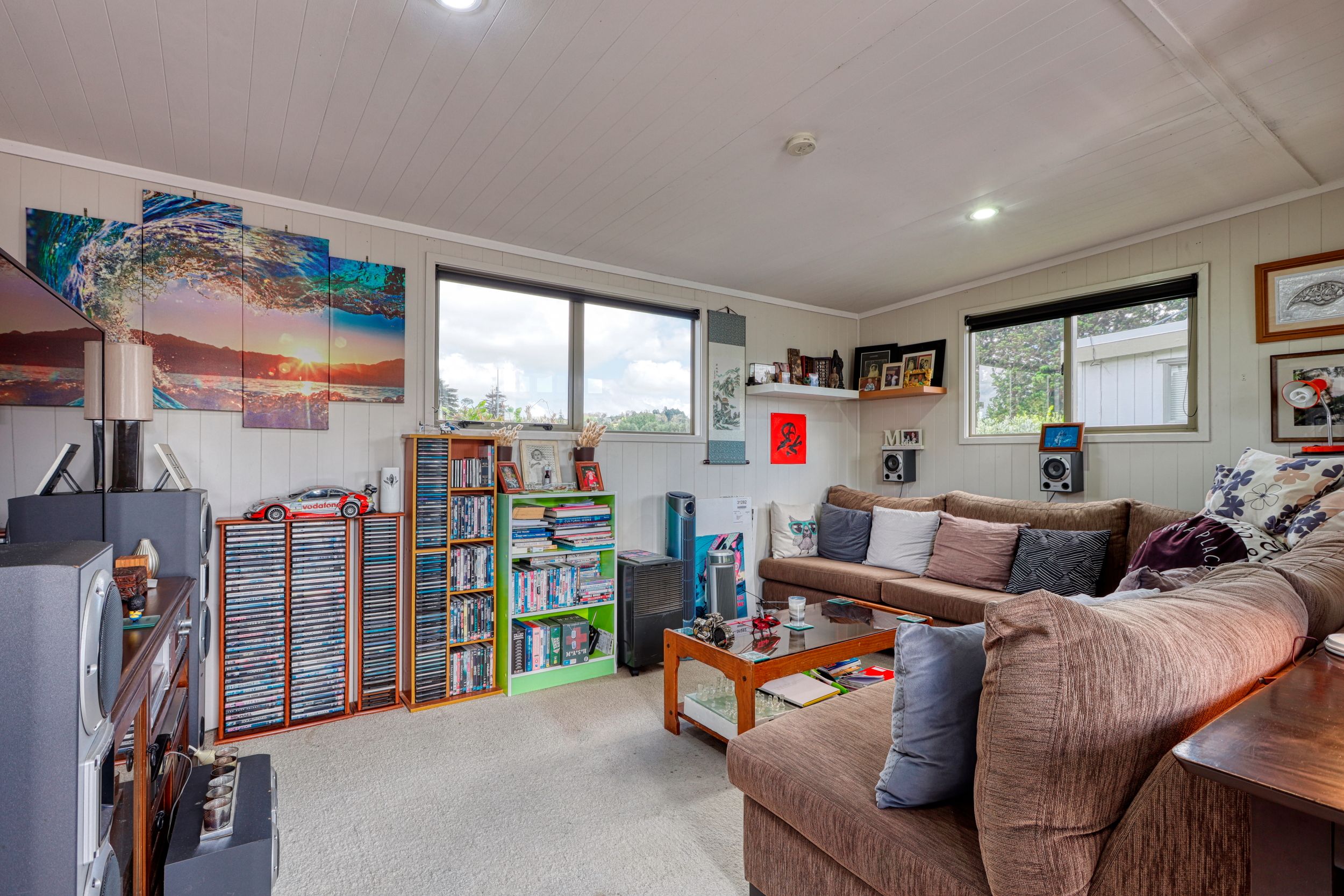 A must see is this two bedroom cabin with a sunny aspect as it faces north and a window view to the south over the playing fields of Mangawhai Domain. Beachy vibe here with the grooved plywood interior walls. With an adjacent car park, and a deck for dining al fresco or watching the world go by all weather with partial roof coverage, what more could you want. Start enjoying this brilliant resort lifestyle with this handy holiday bolt-hole.