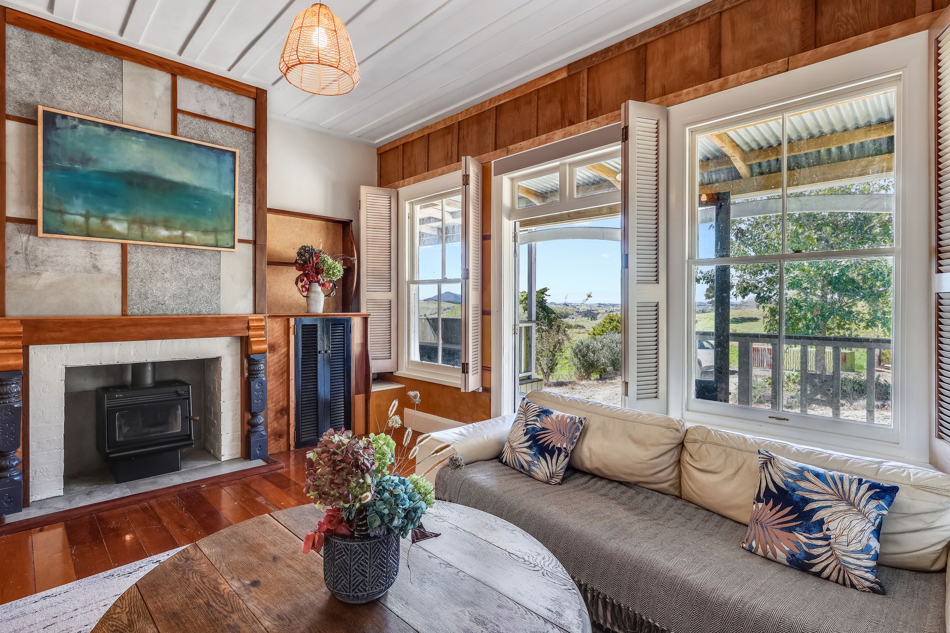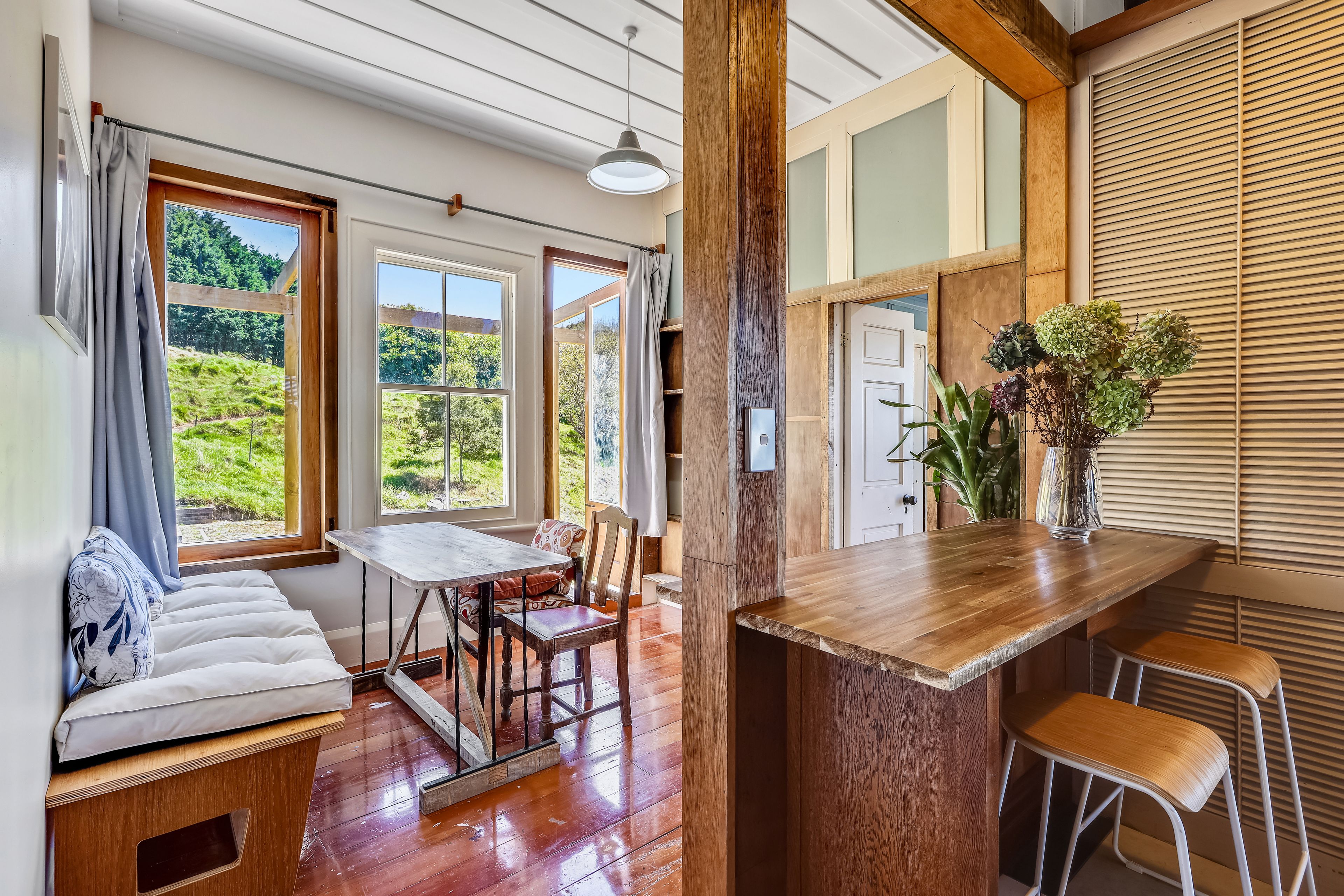 The 1910-1919 Kauri villa has been lovingly renovated, and crafted and enjoys a captivating rural peninsula vista from within and from the verandah decks. Character features include: polished timber floor boards; high battened ceilings; French doors; and timber shutters.