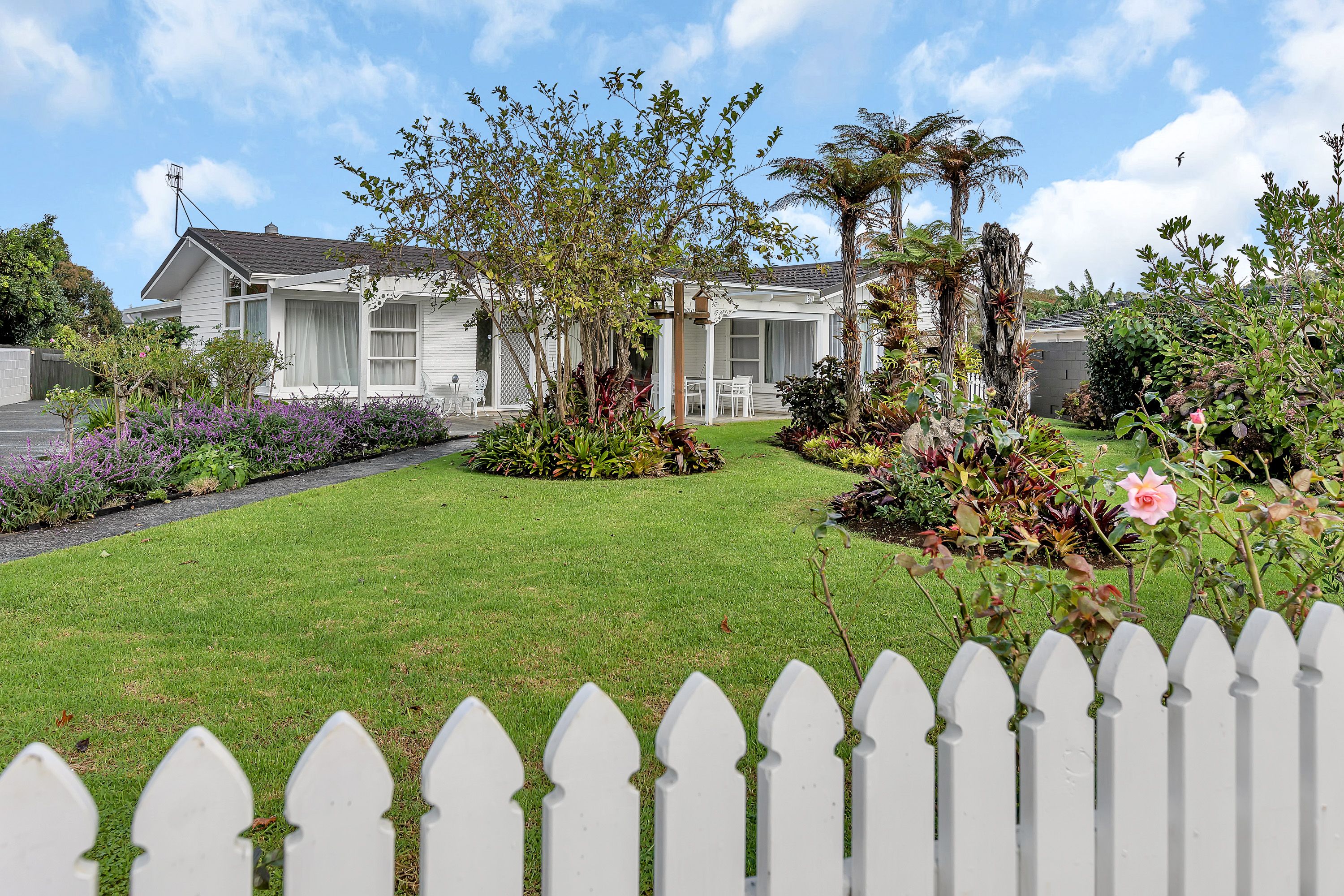 Beautifully presented and nestled behind a white picket fence, the home has a welcoming open plan living area including the kitchen, dining room and family room which opens out to a sunny patio overlooking the gorgeous gardens.