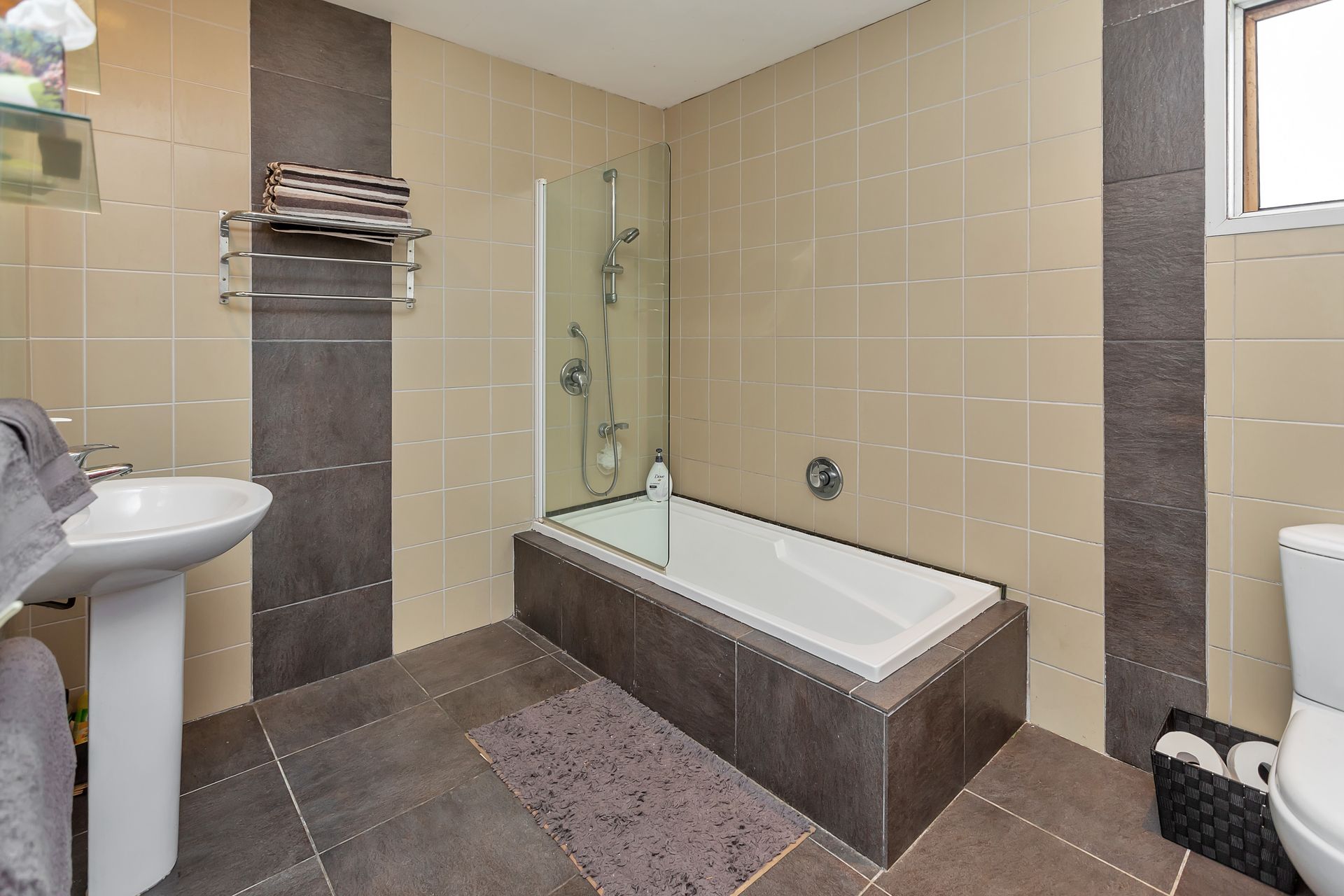 Upstairs is the contemporary bathroom, two double bedrooms and a single. Downstairs, the garage has been converted to a rumpus, an office and laundry.