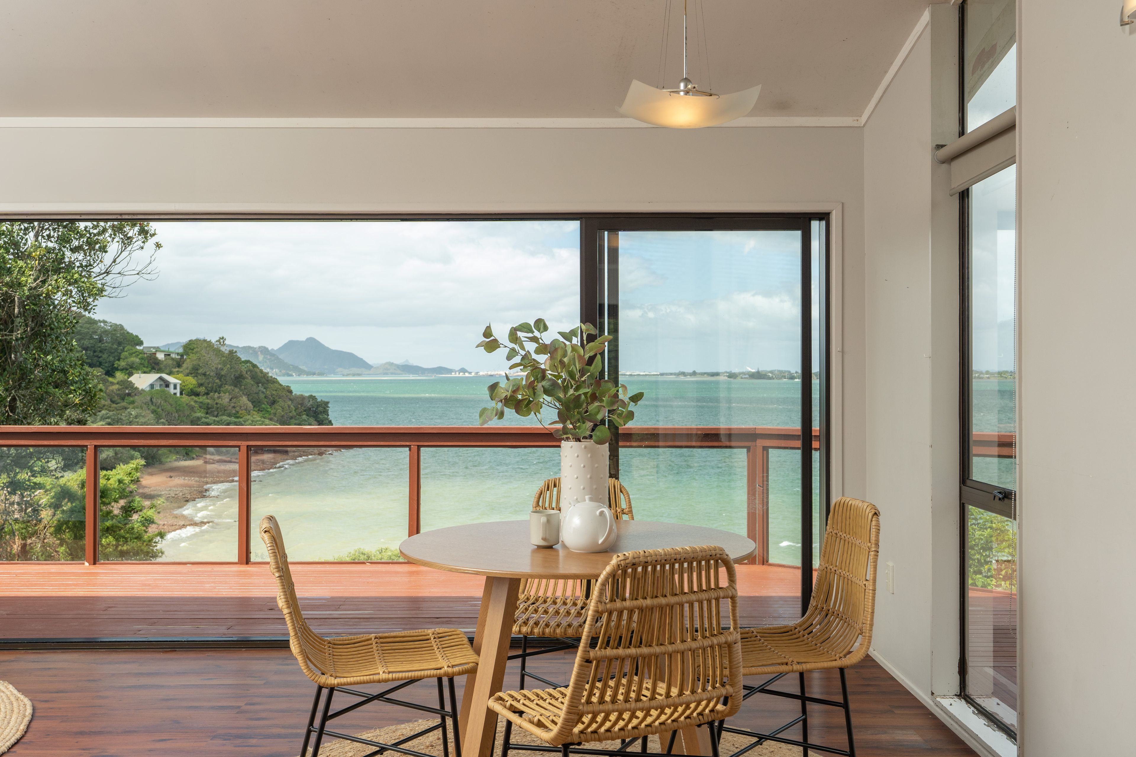 The spacious four-bedroom home is positioned at the top of the sloping section to maximise the sweeping harbour views from almost every room and offers ultimate privacy in a tranquil bush setting. It is spread over two levels with a sheltered, covered patio at the entrance. The open-plan living, dining and kitchen area opens to a good-sized deck. Three bedrooms and the family bathroom are located on the upper level with the master en-suite bedroom and office (with their own deck) on the lower level. The double garage/laundry has internal access.