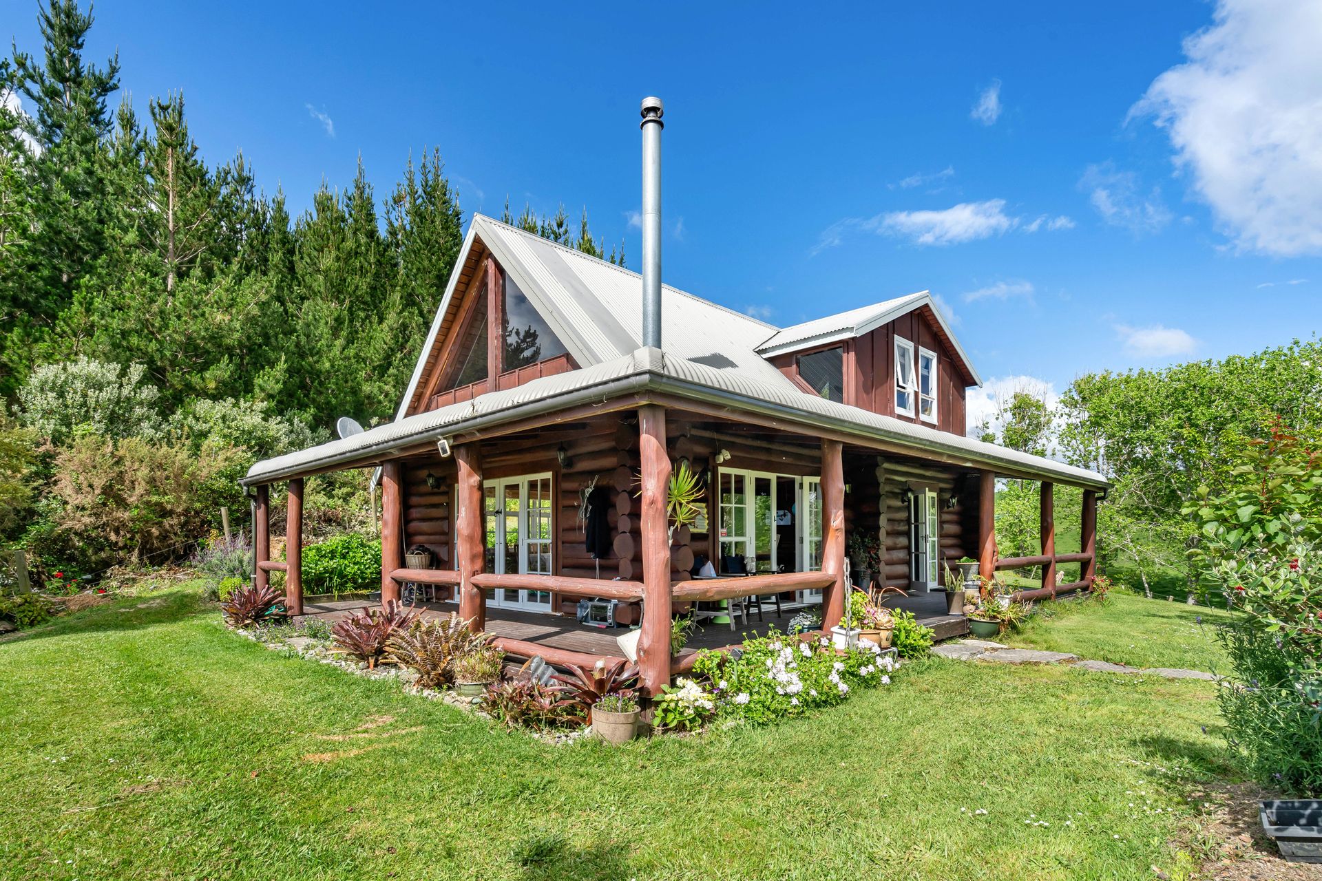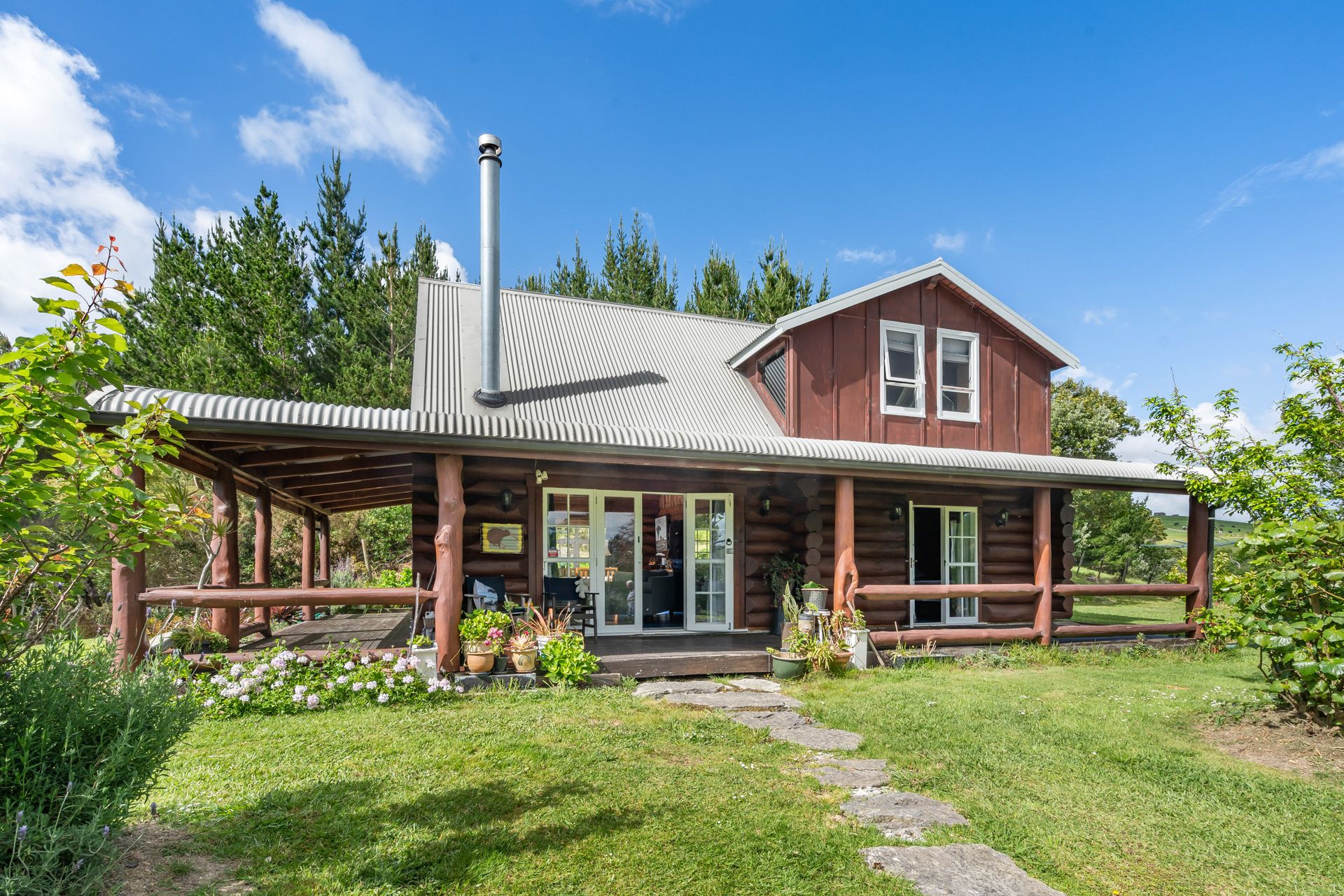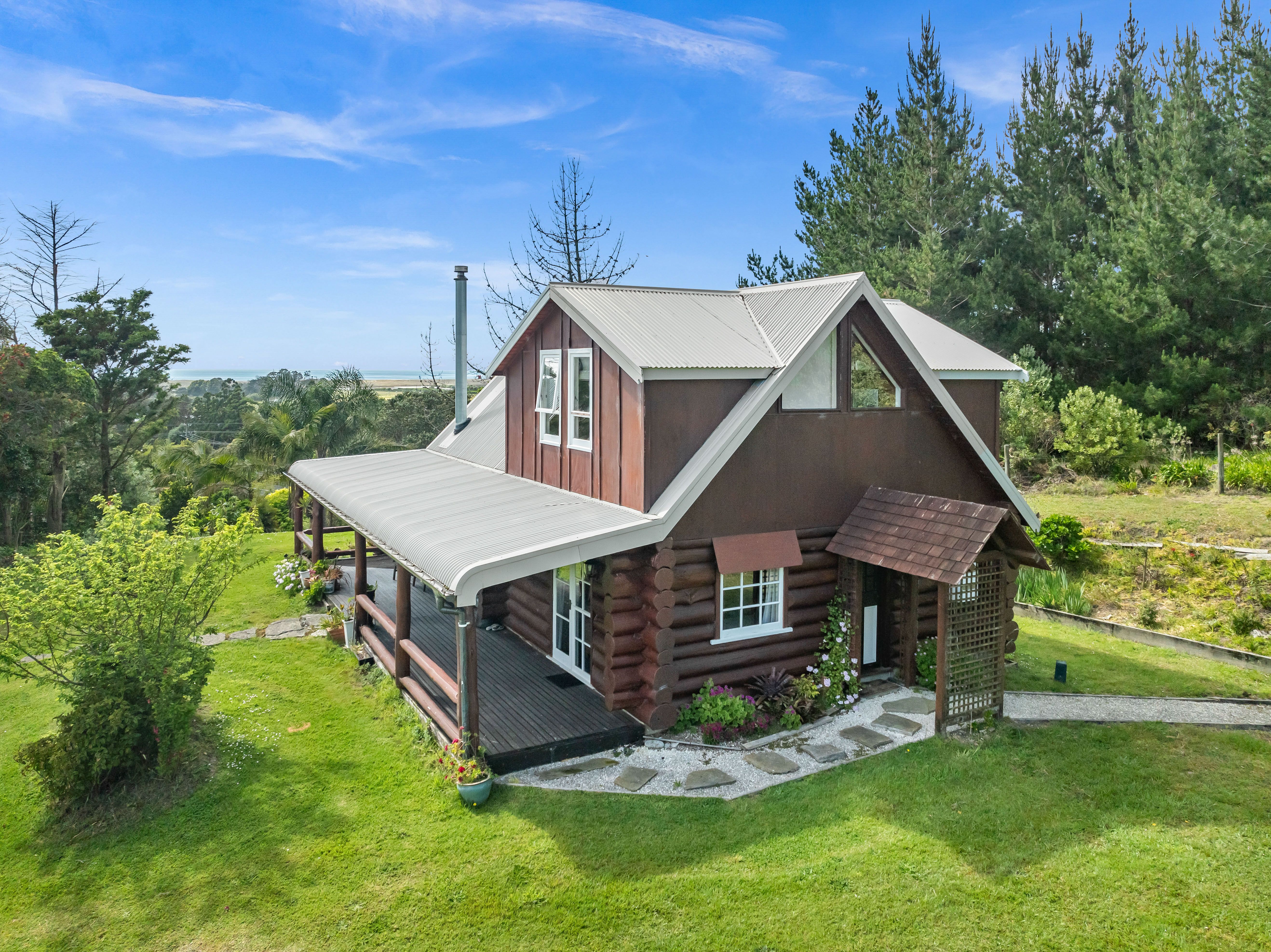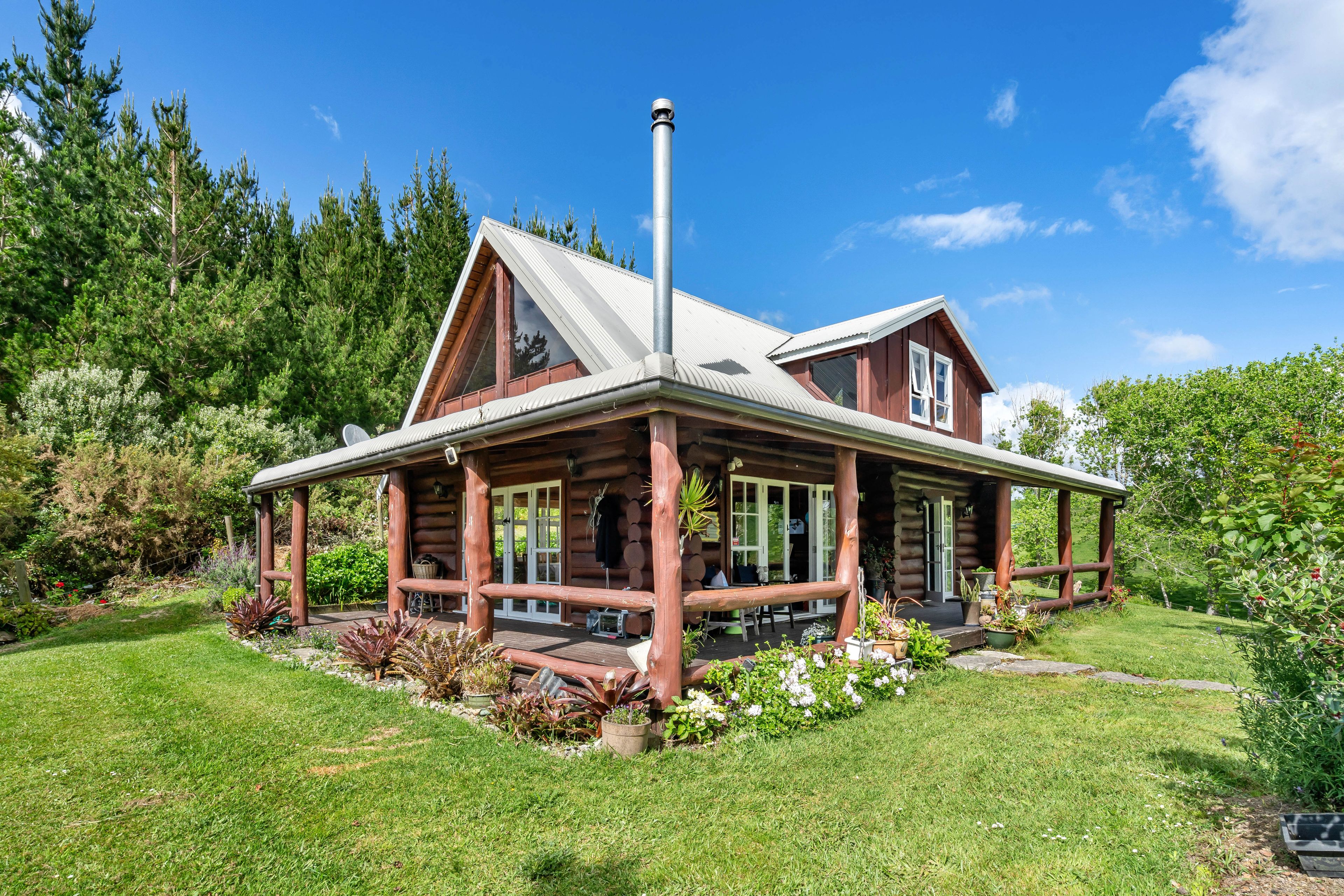 Nestled on a tidy elevated acre this gorgeous log home is quite extraordinary. A real-life story that transports you into a world of your own that's utterly enchanting. It comes with a separate building too, currently used as a one-bedroom sleepout with shower and loo (building consented as a shed, bathroom unconsented).
