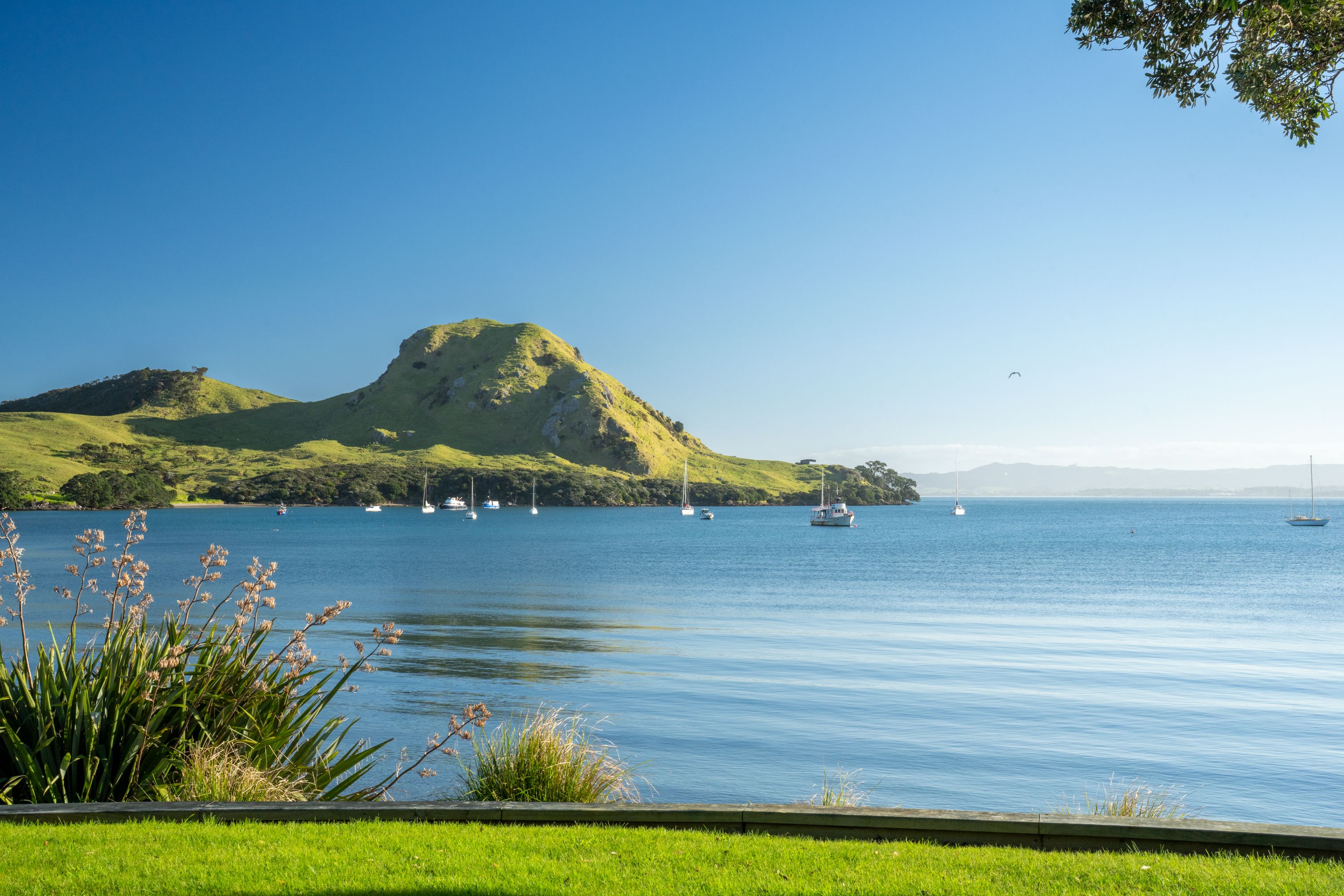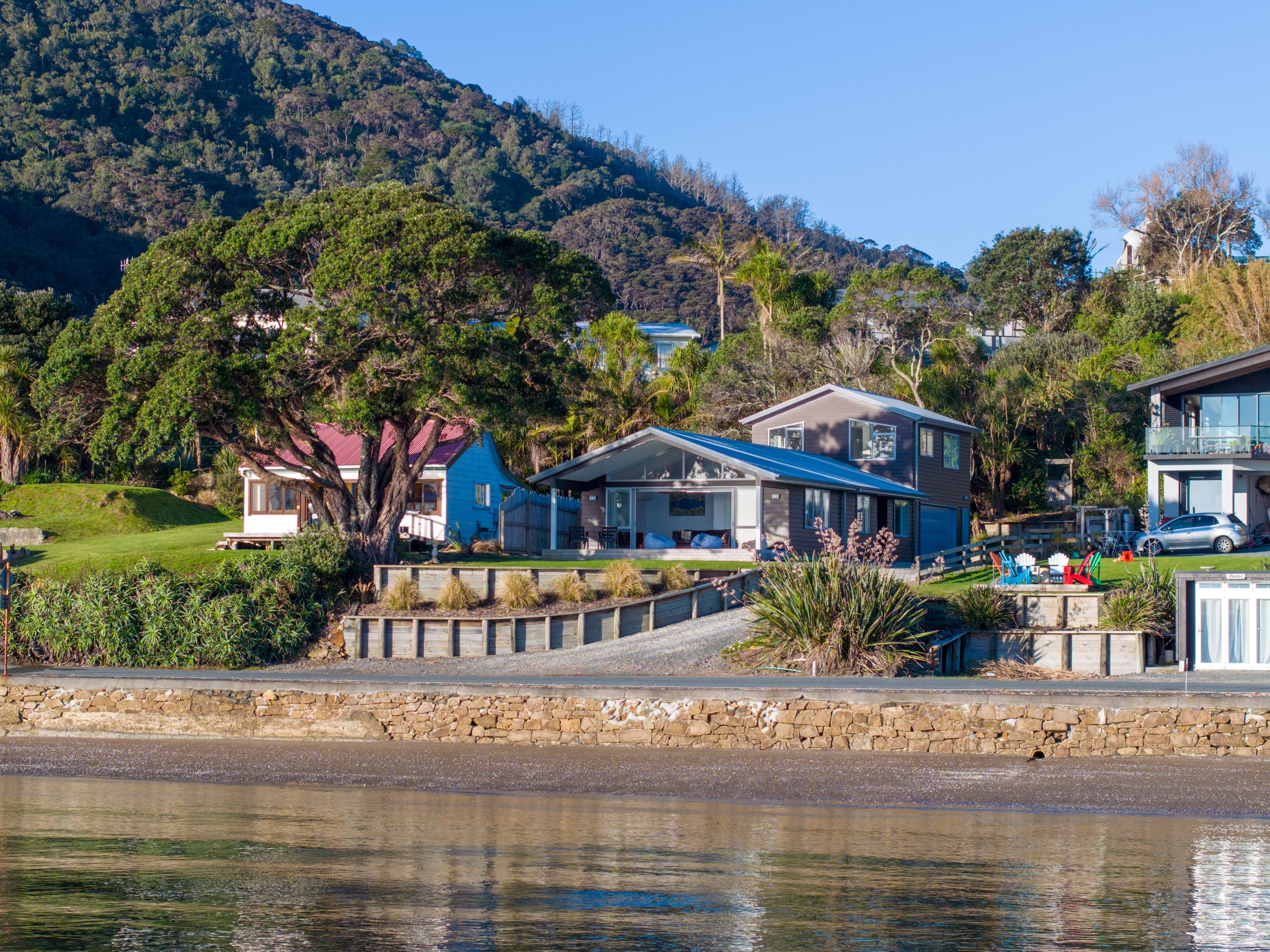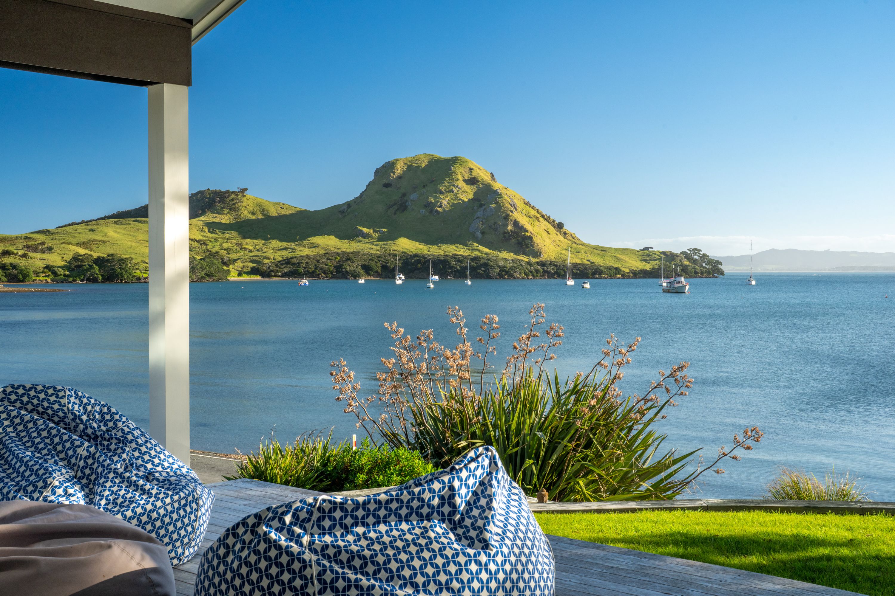 On the shore front of Urquharts Bay, renowned for its easy access to deep blue fishing grounds and awe-inspiring mountainous vistas, lies a striking modern coastal home that offers breathtaking views of glistening waters and the iconic Bream Head scenic reserve.