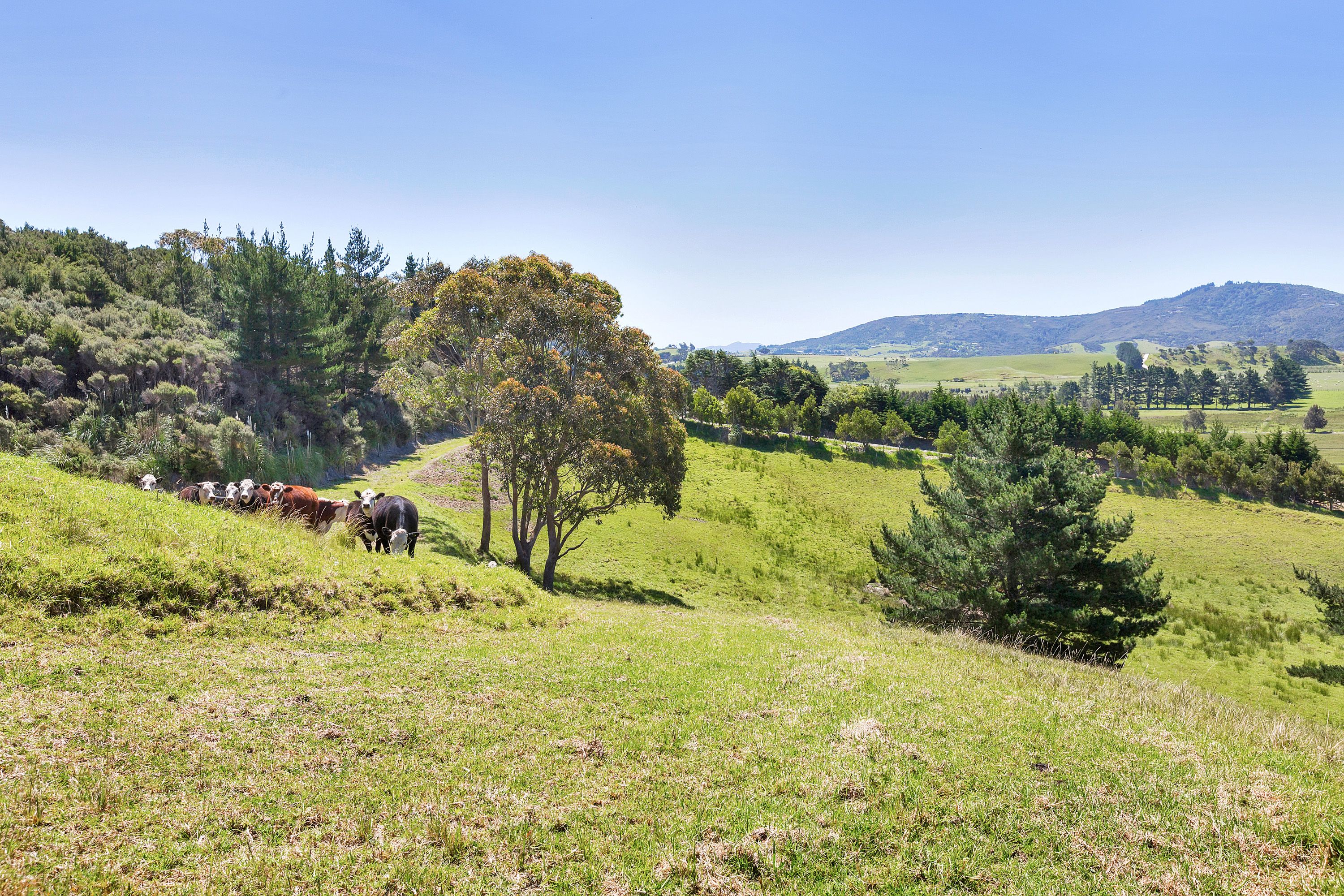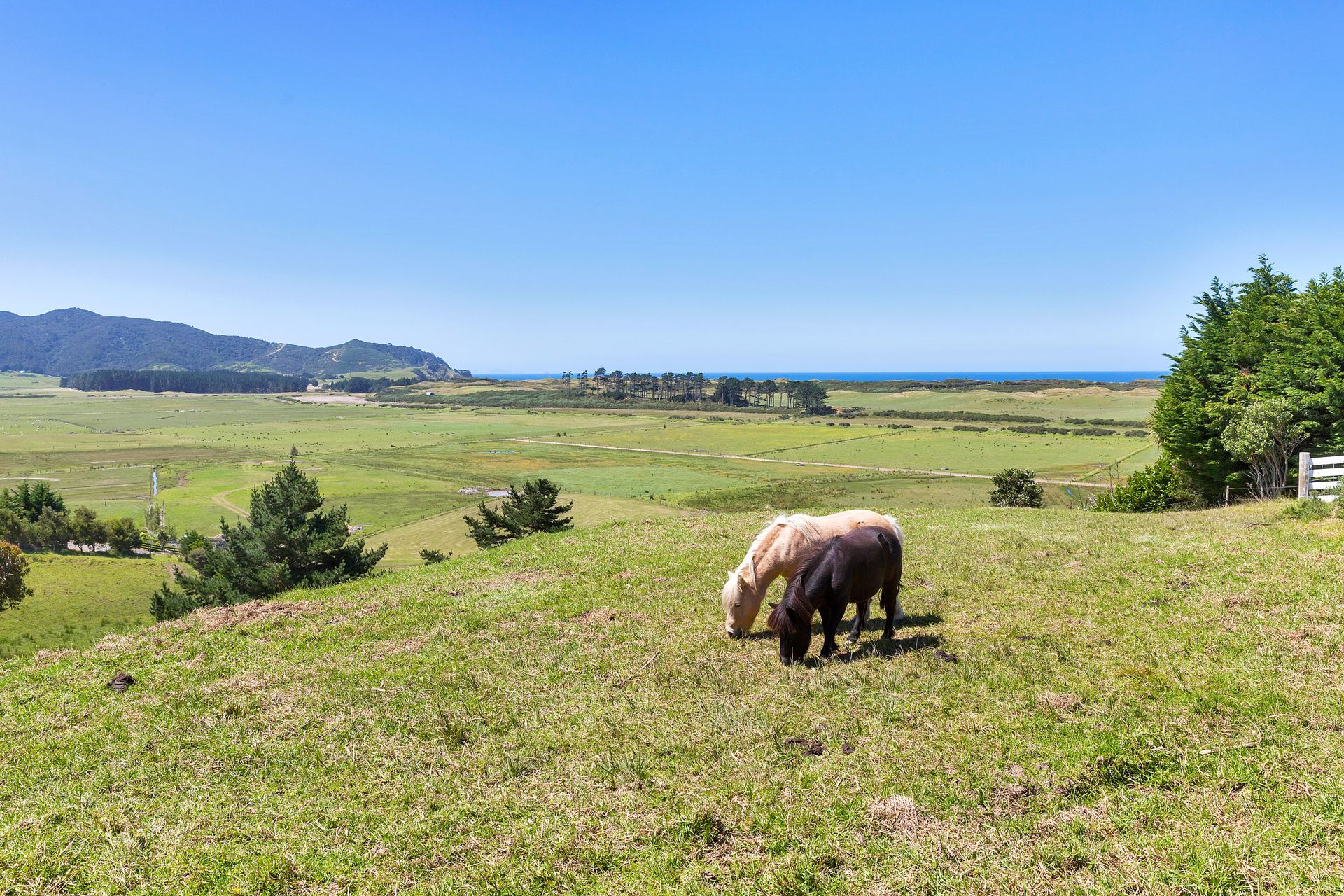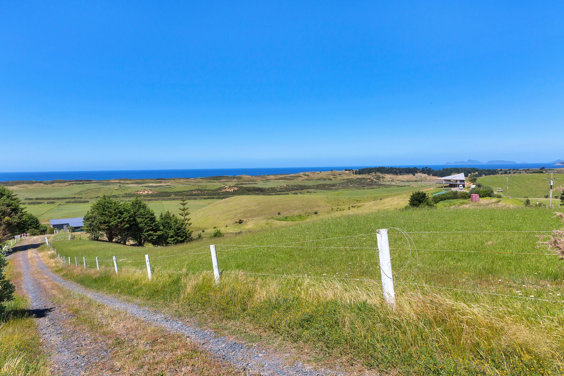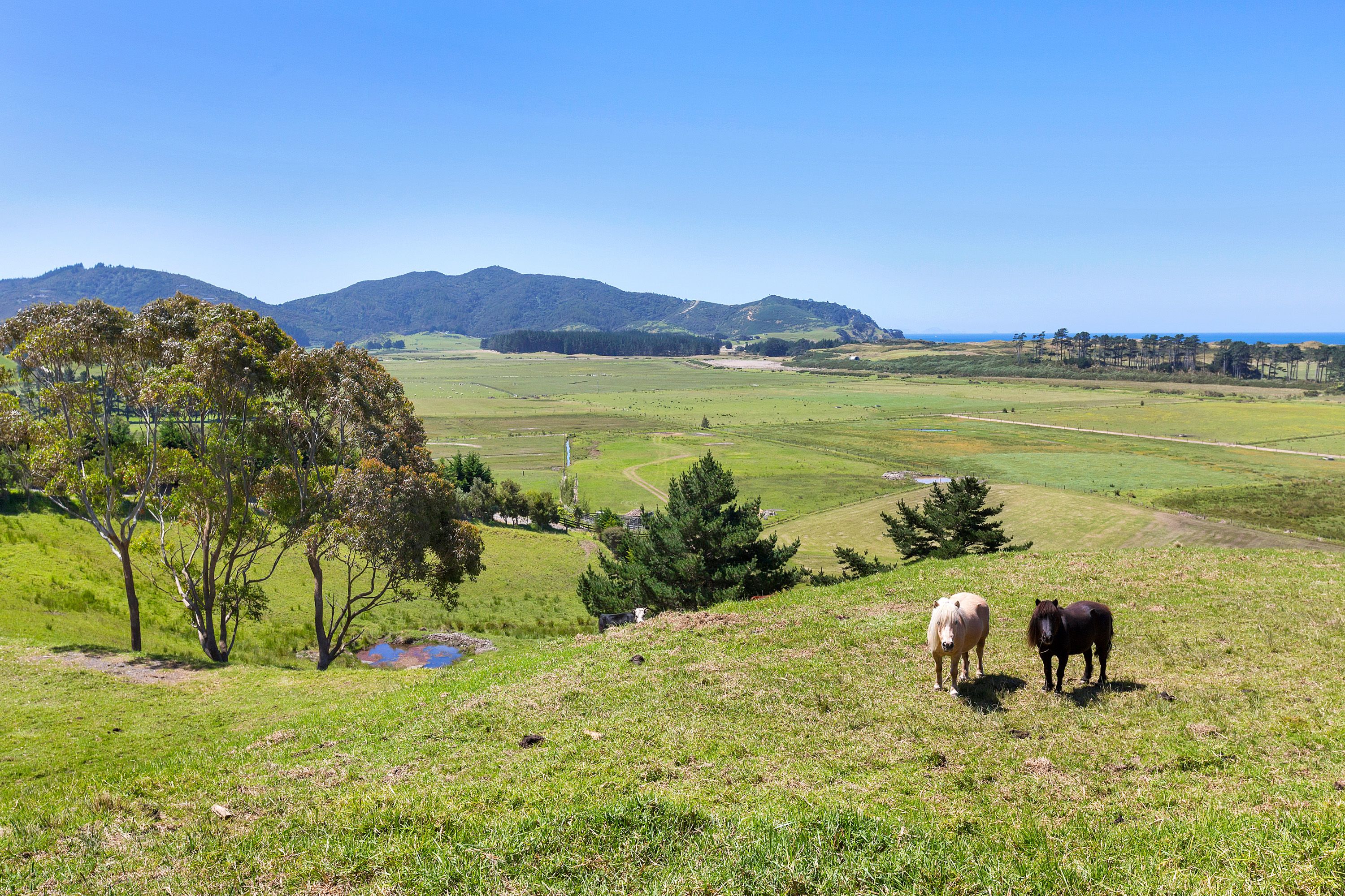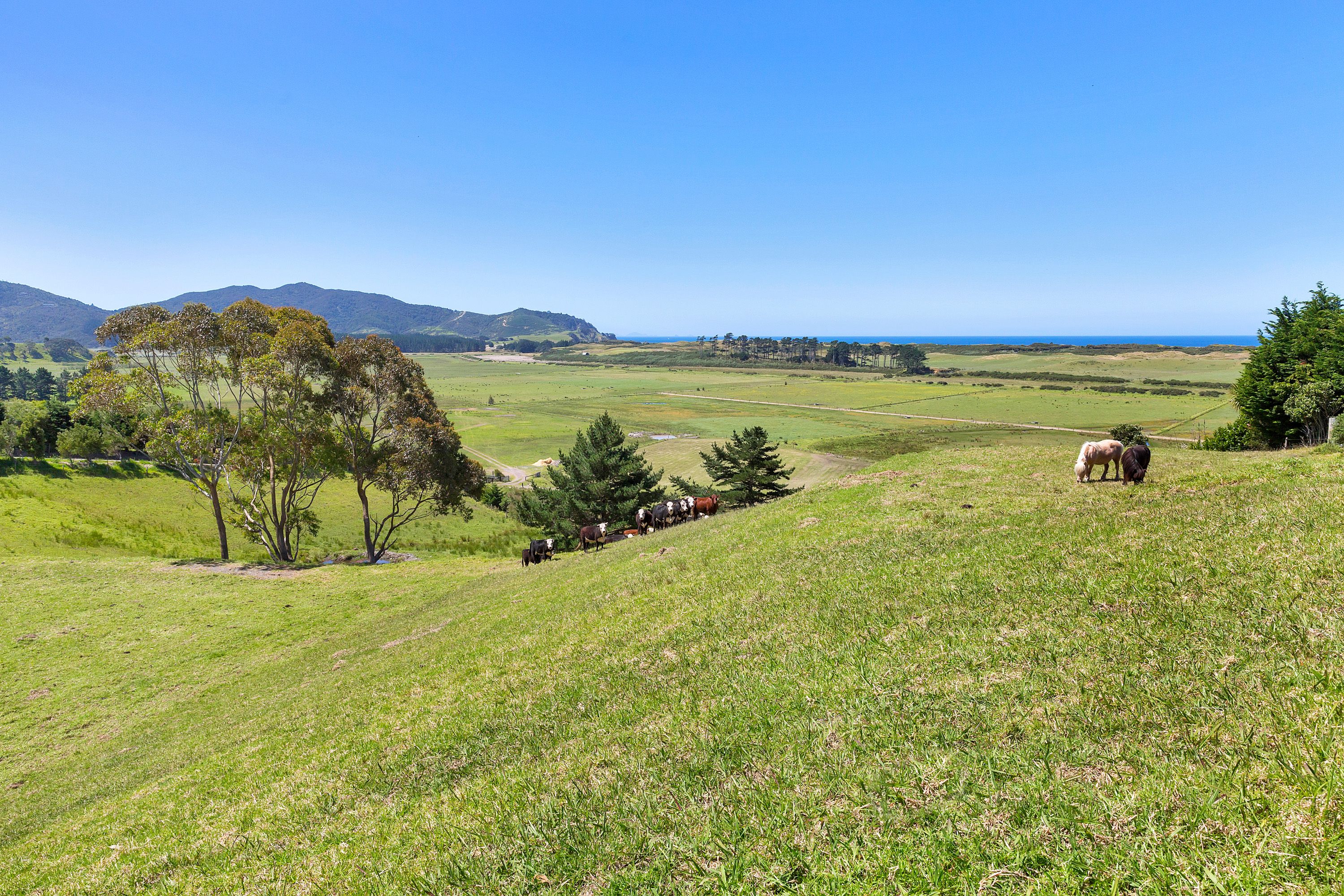 Elevated coastal lifestyle block of 1.3 hectares, stunning open views over green pastures and out to Kauri Mountain and along Ocean Beach. Levelled building site, power to the boundary, ROW access established, beautiful north to north easterly aspect, with a pond and mature trees for the livestock.
