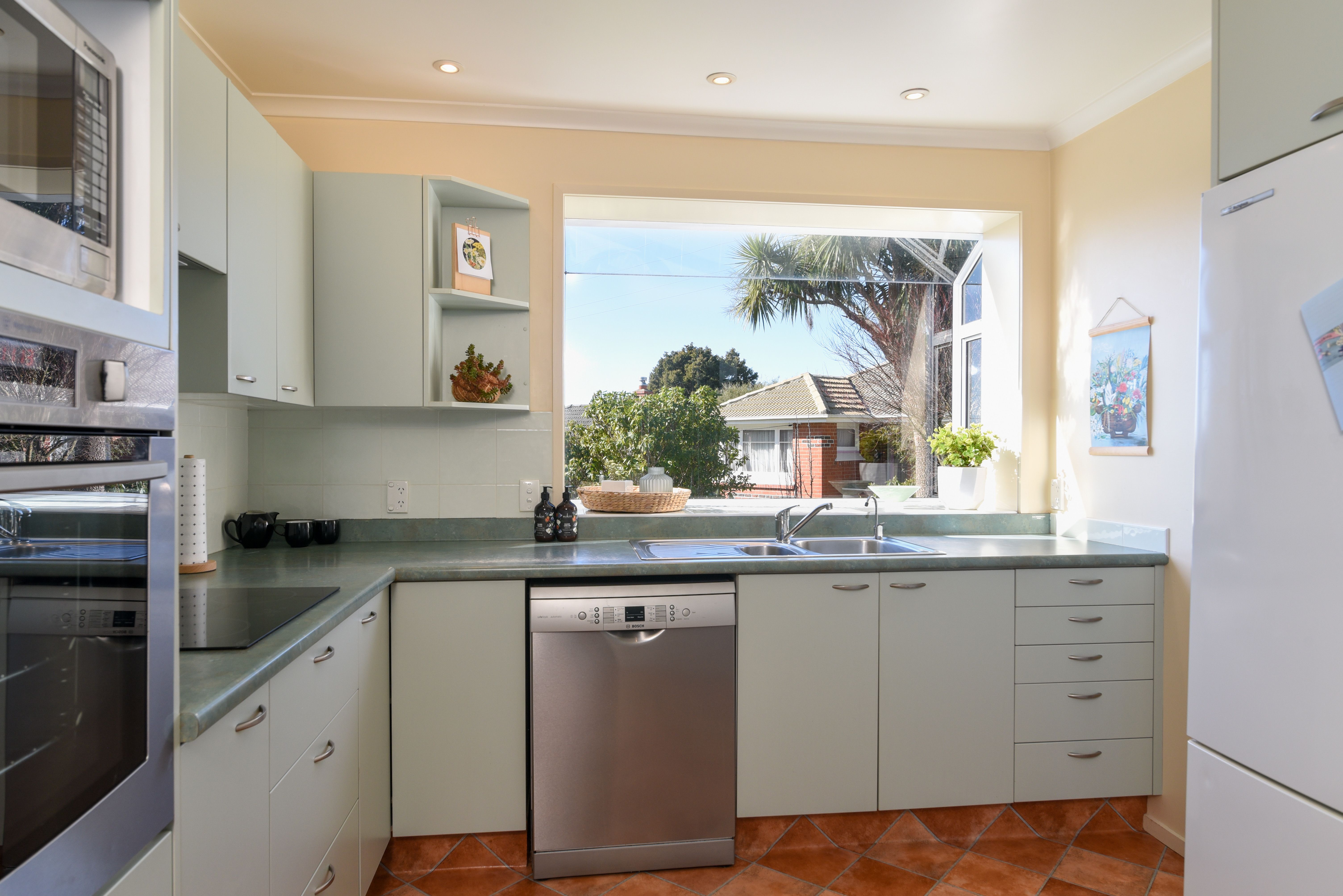 A sliding door provides access to the well-appointed kitchen with quality appliances, ample storage, and a large box window.