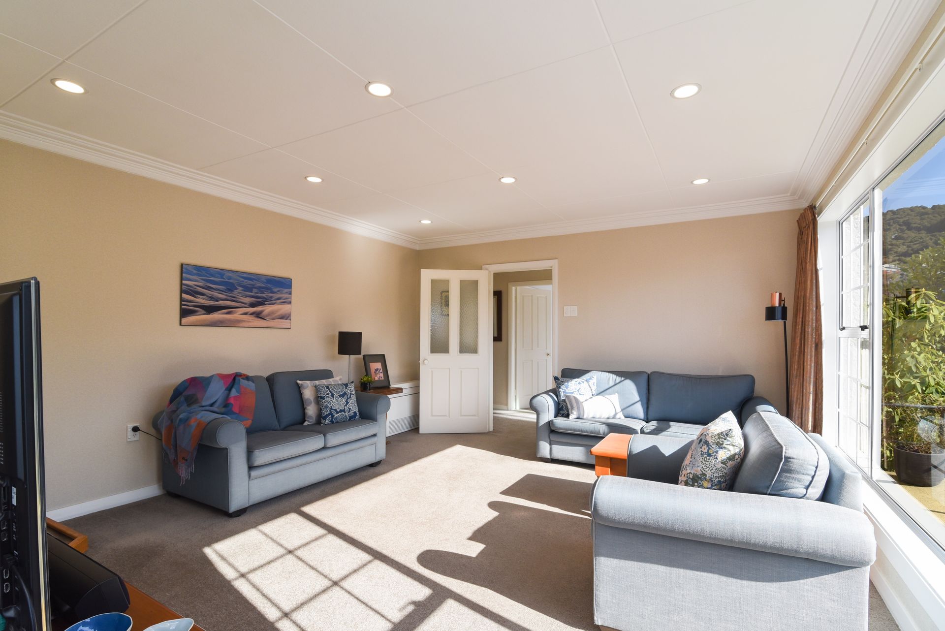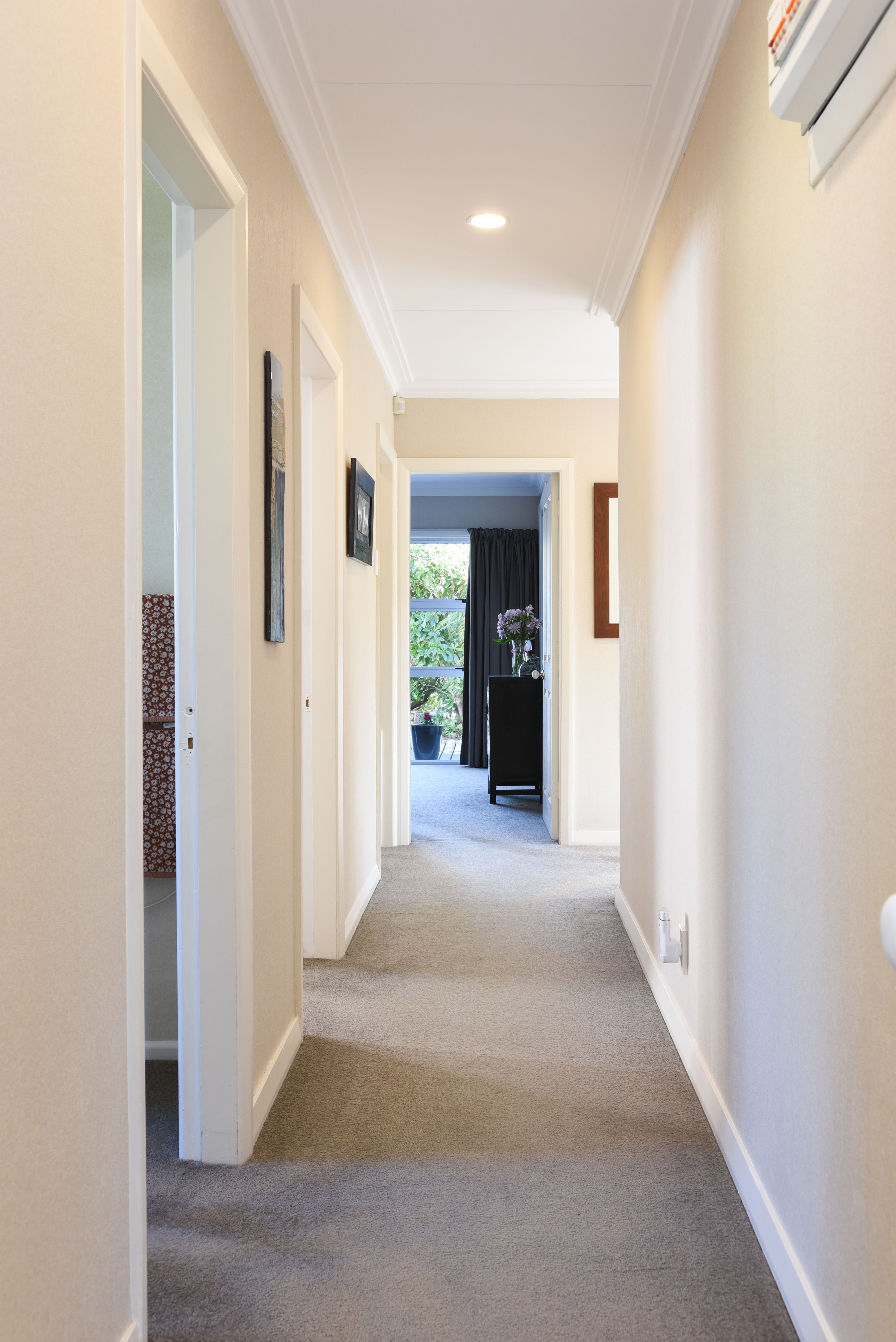 The three double bedrooms - two with built-in-wardrobes. A second heat pump nearby in the hall keeps this area of the house cosy in winter. The master bedroom has the added bonus of opening out to your own private sheltered deck, surrounded by flowering shrubs.