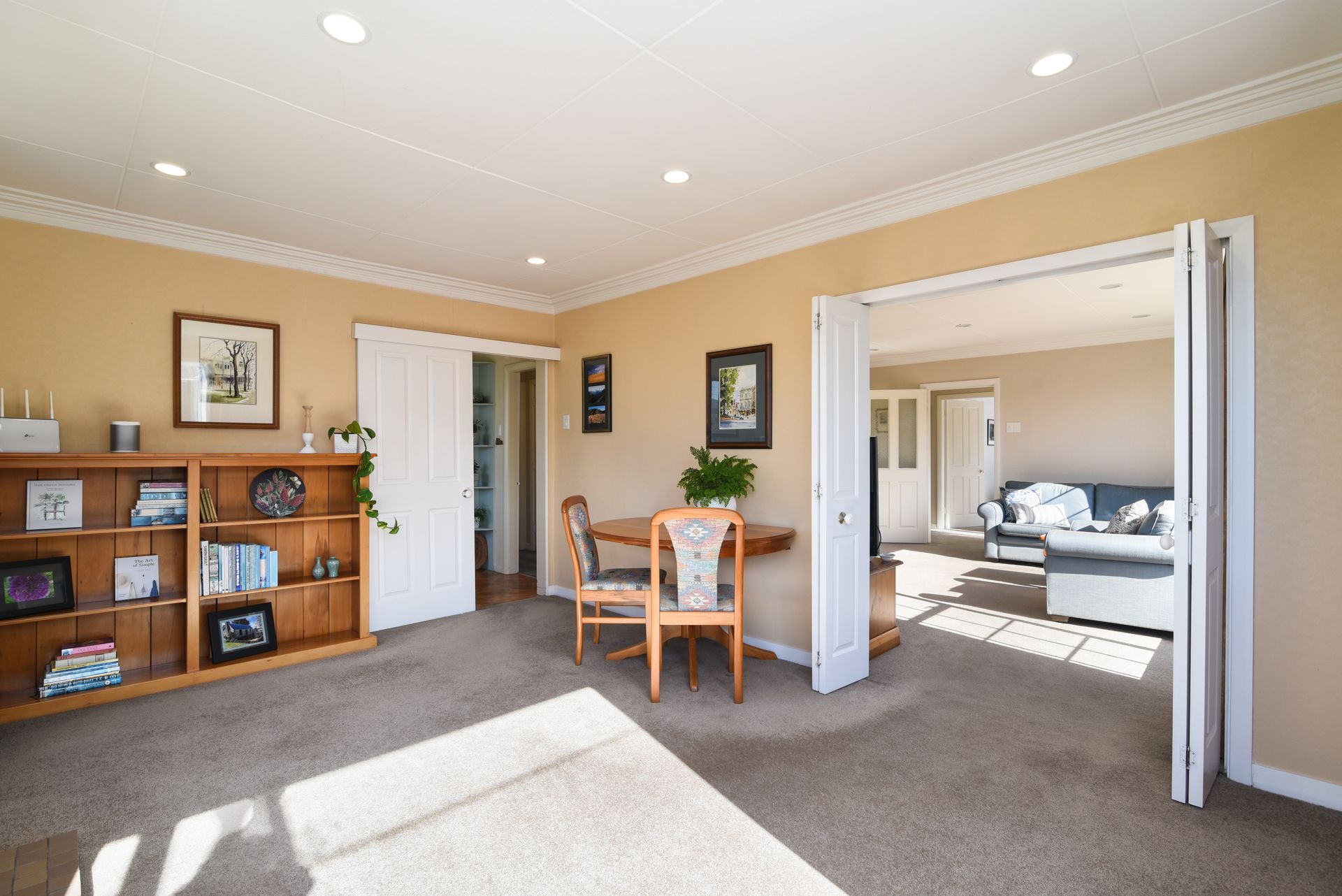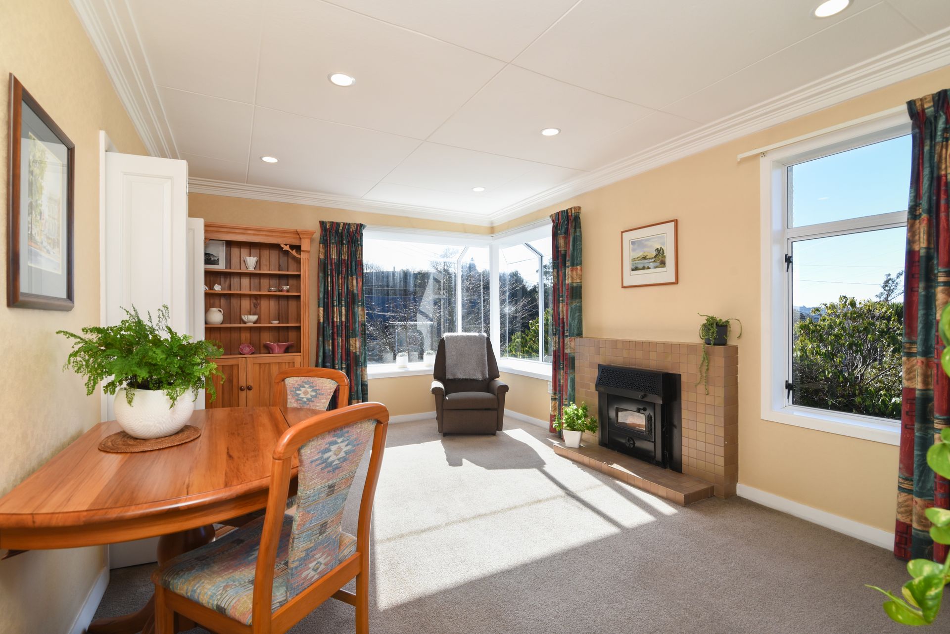 Double doors open to the spacious living-dining area - with a built-in wood burner.