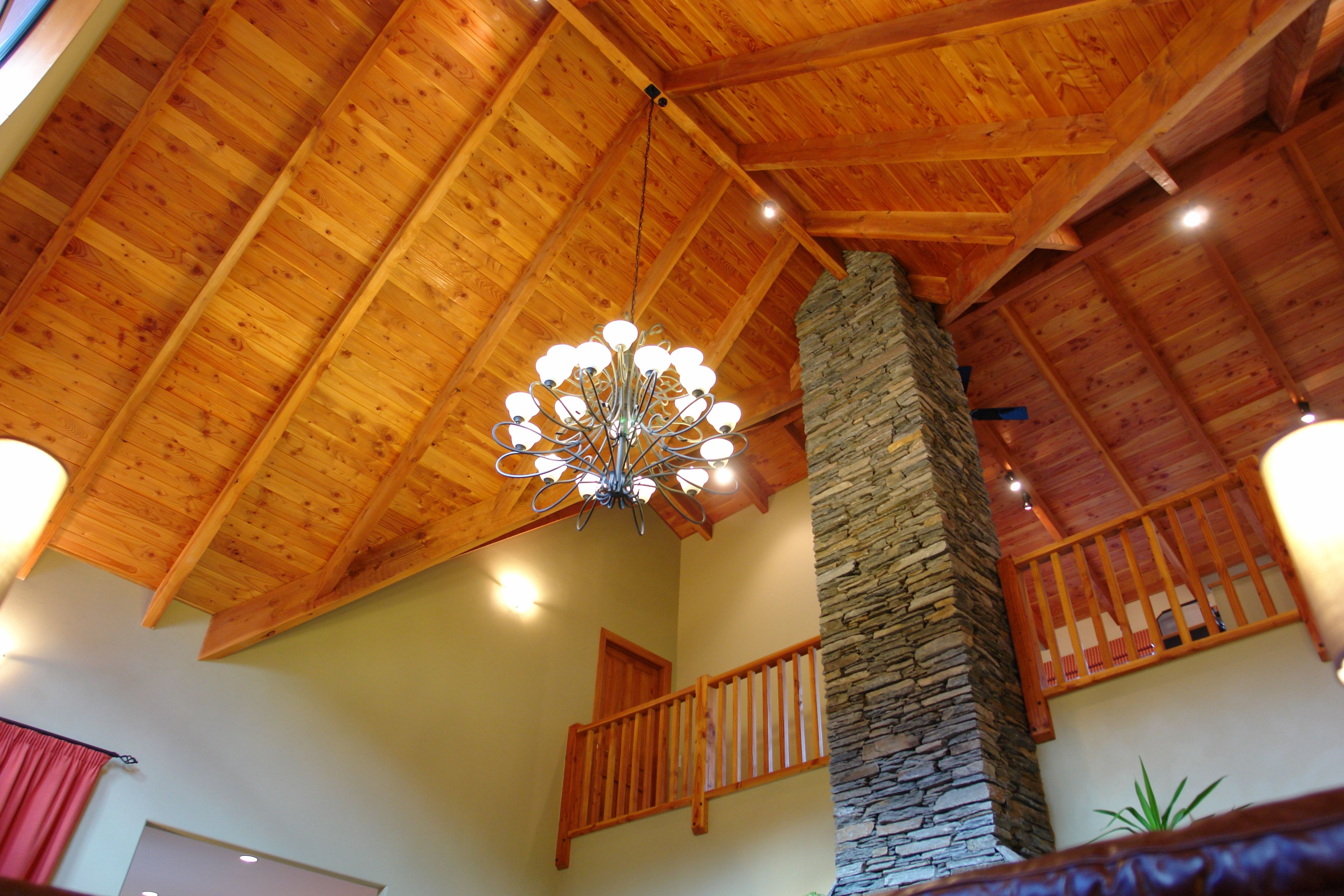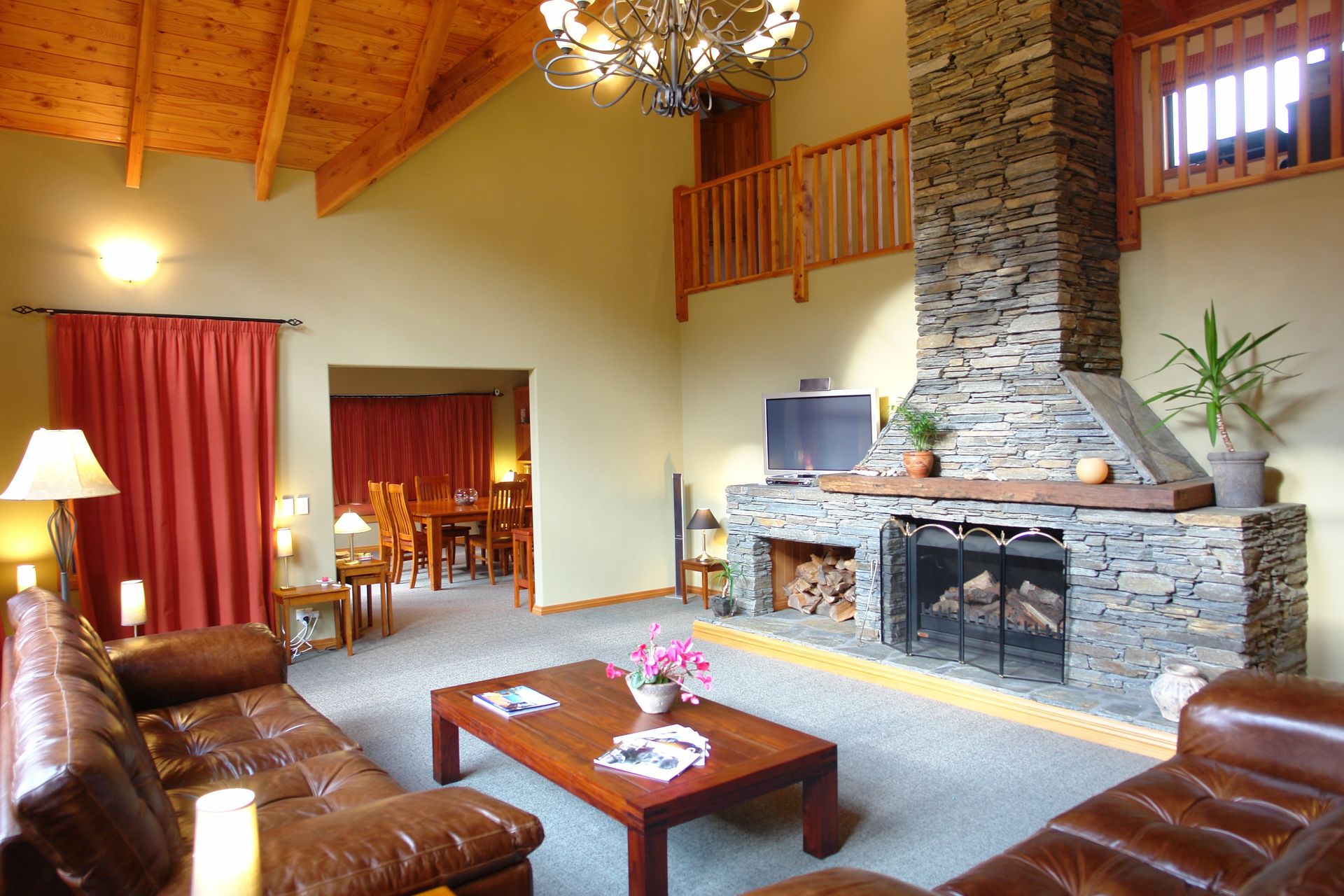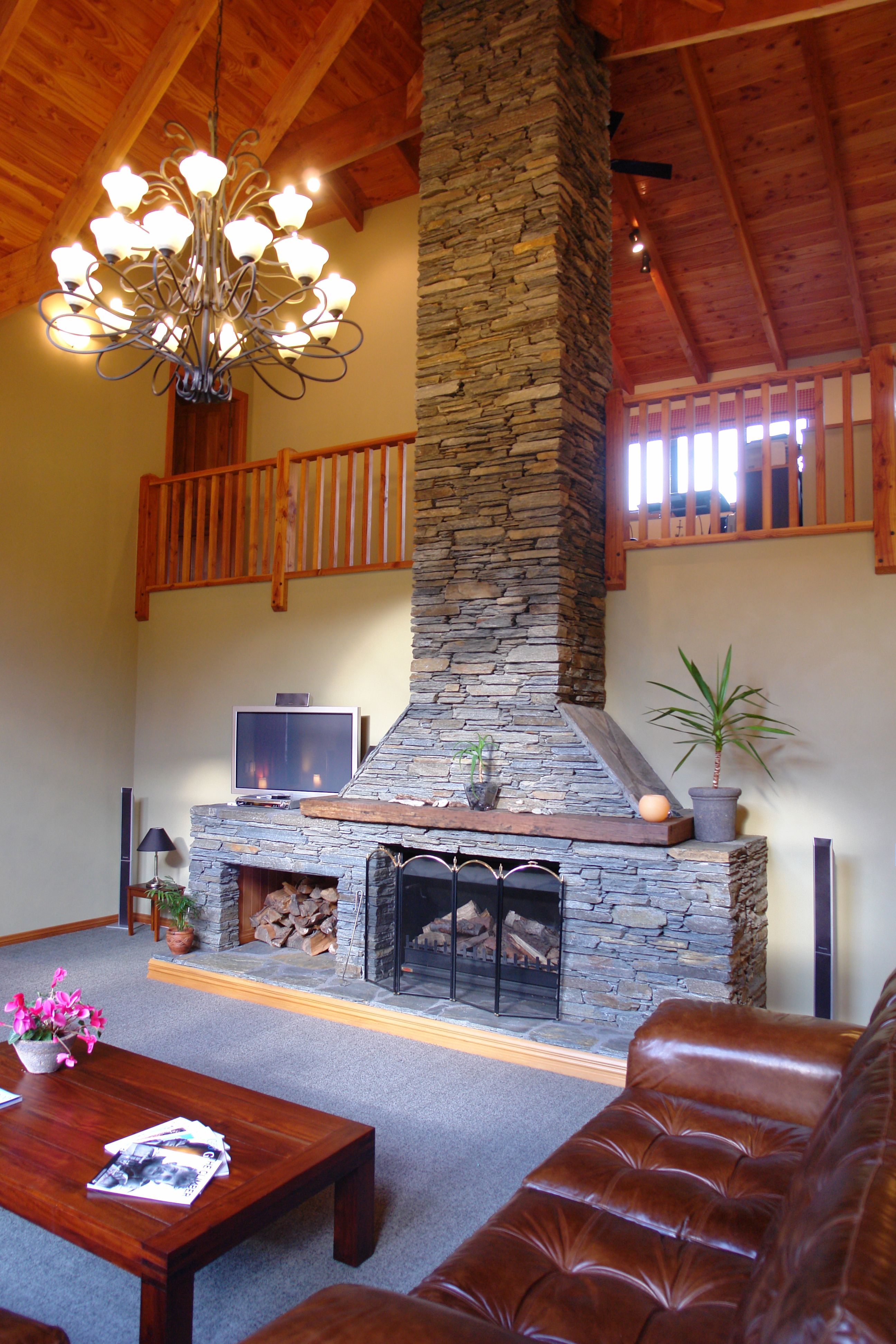 The stunning north facing lounge with its magnificent timber ceiling and large windows features a jetmaster open fire set within a stacked schist chimney which leads up to the mezzanine floor.