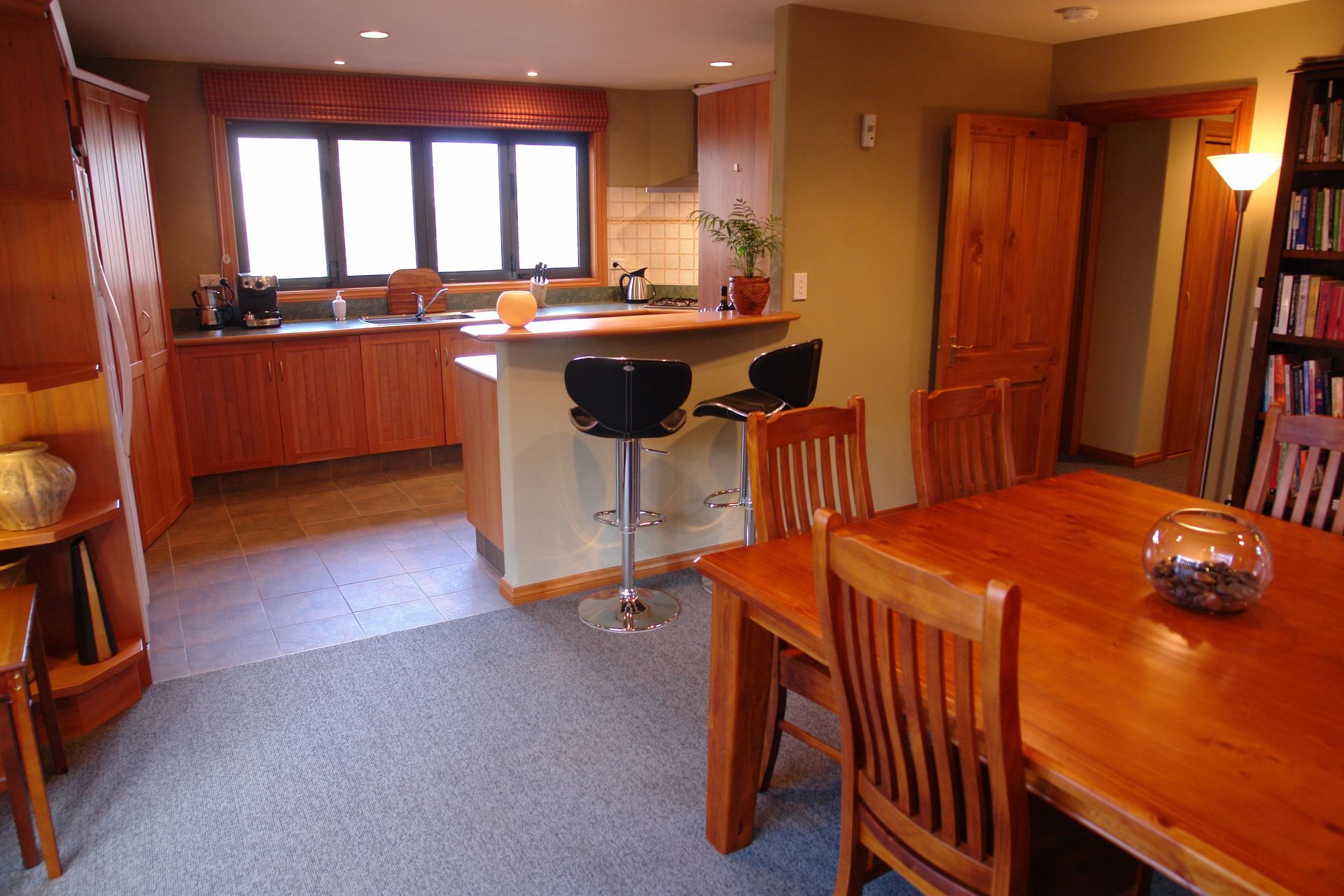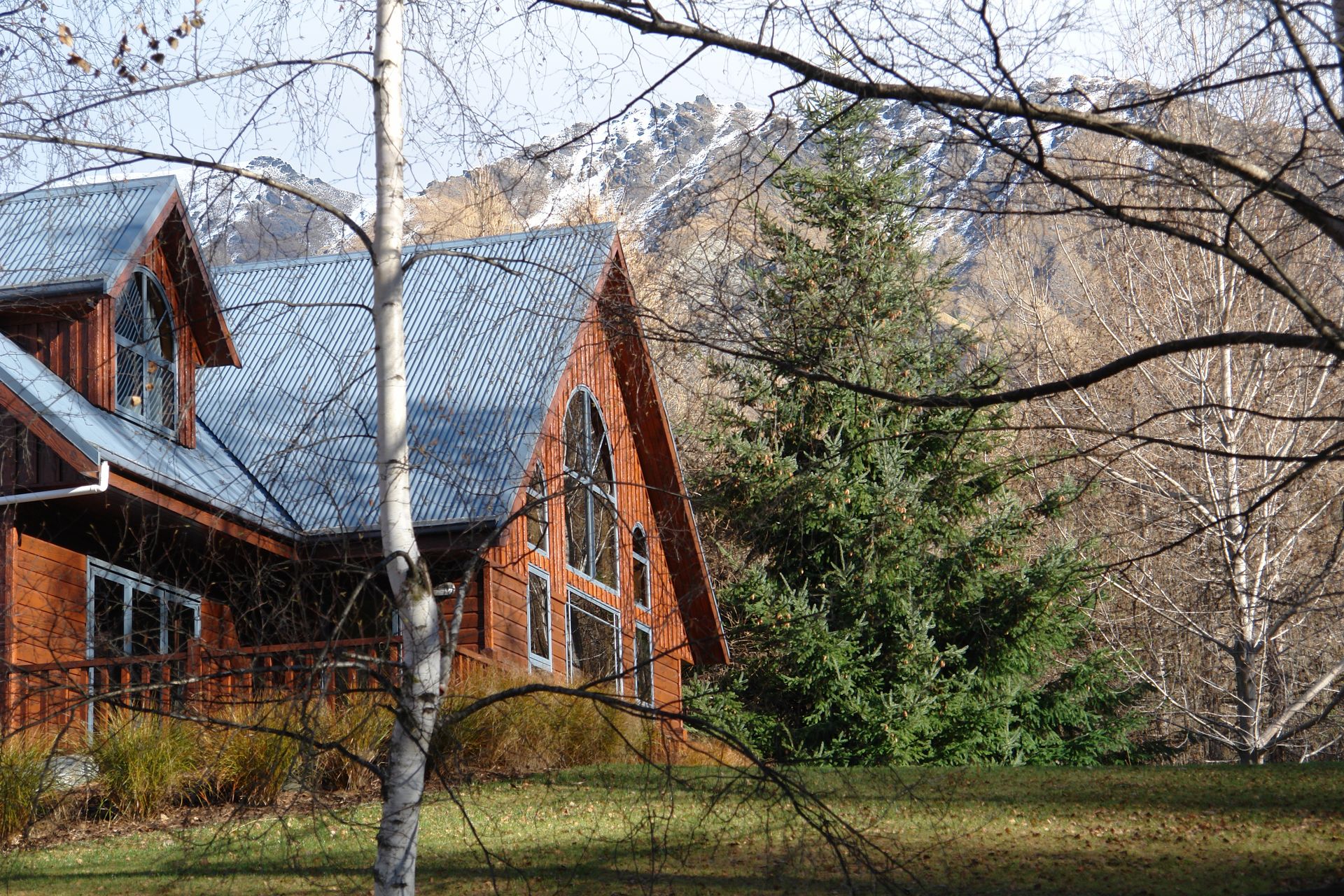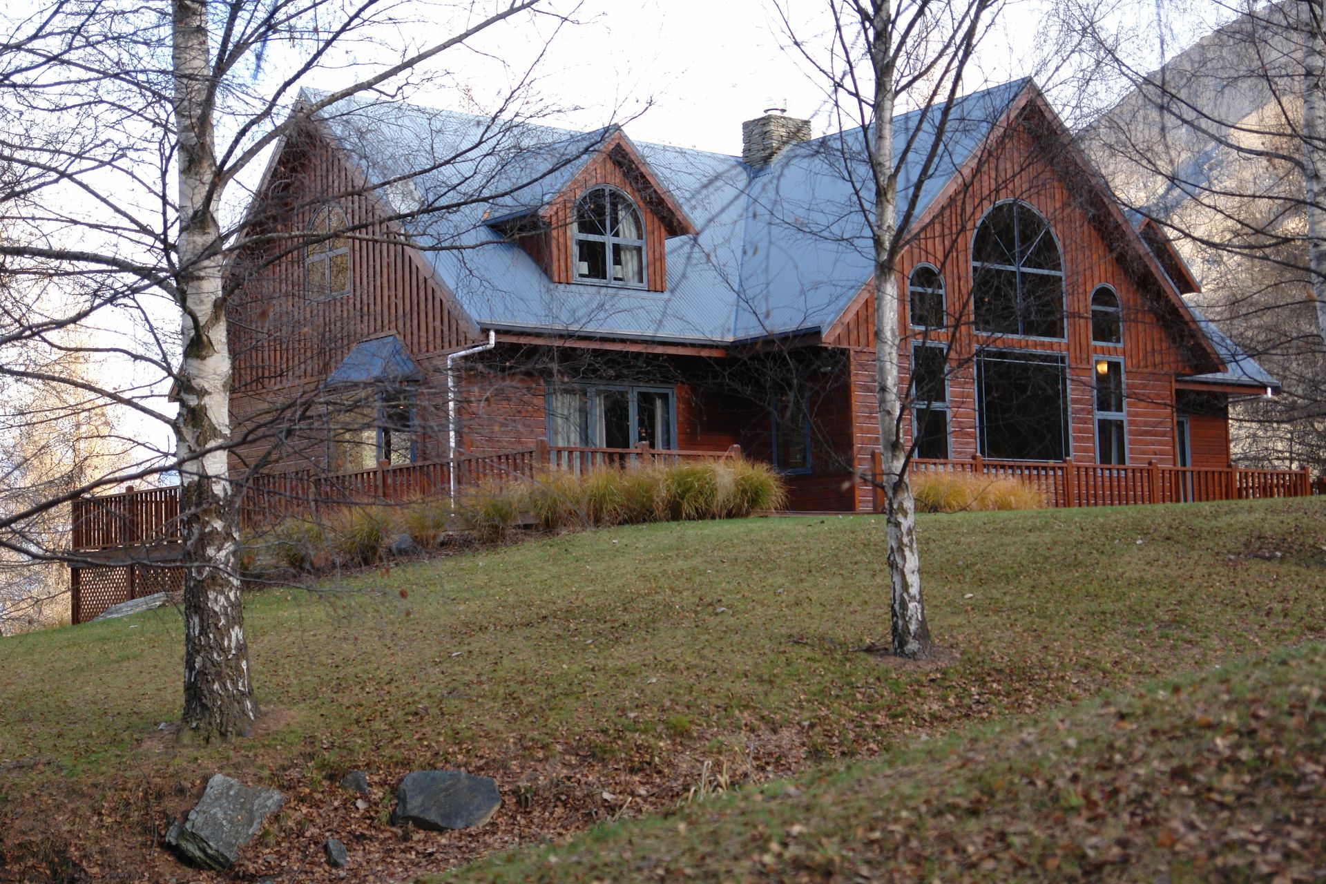 The stunning north facing lounge with its magnificent timber ceiling and large windows features a jetmaster open fire set within a stacked schist chimney which leads up to the mezzanine floor.