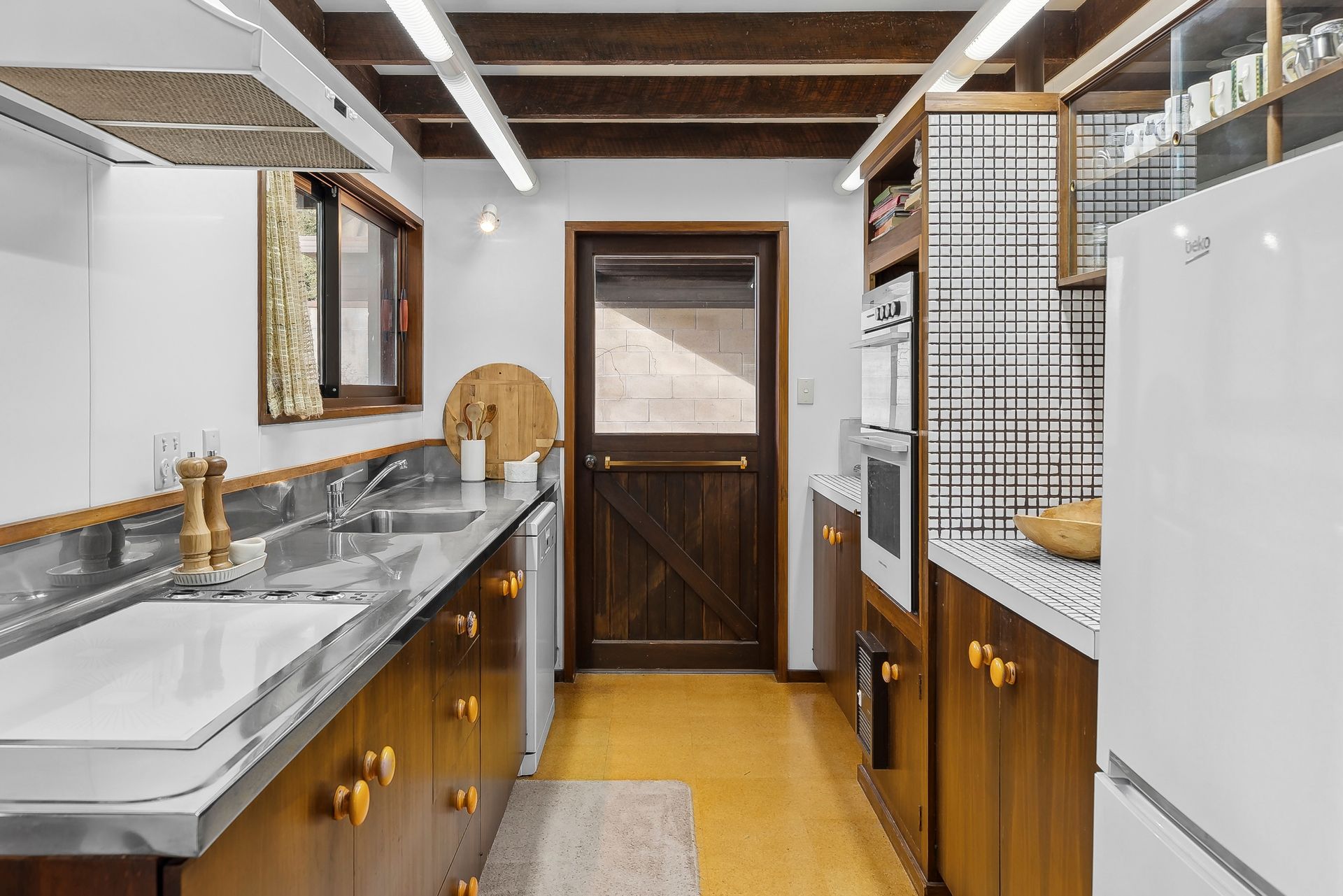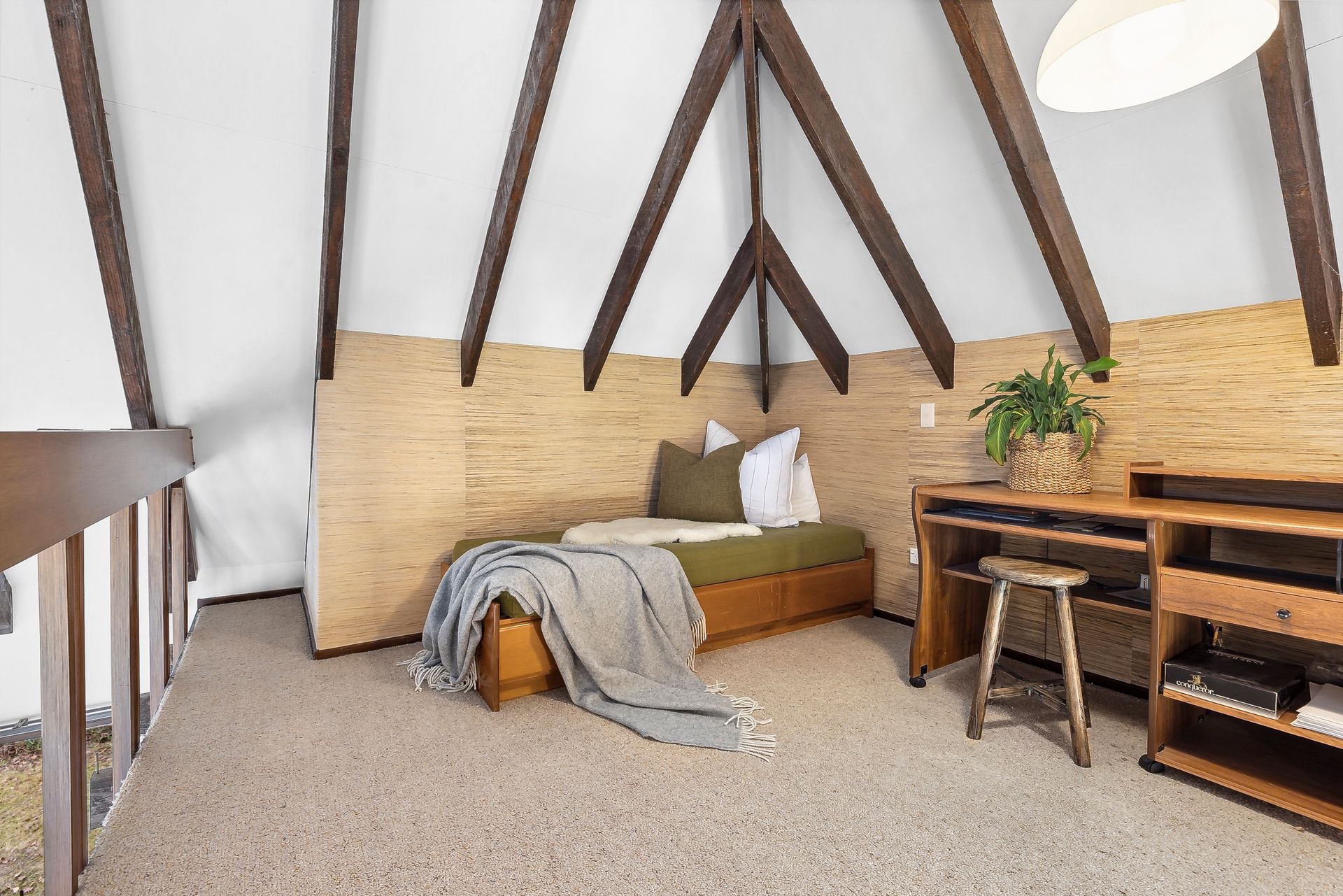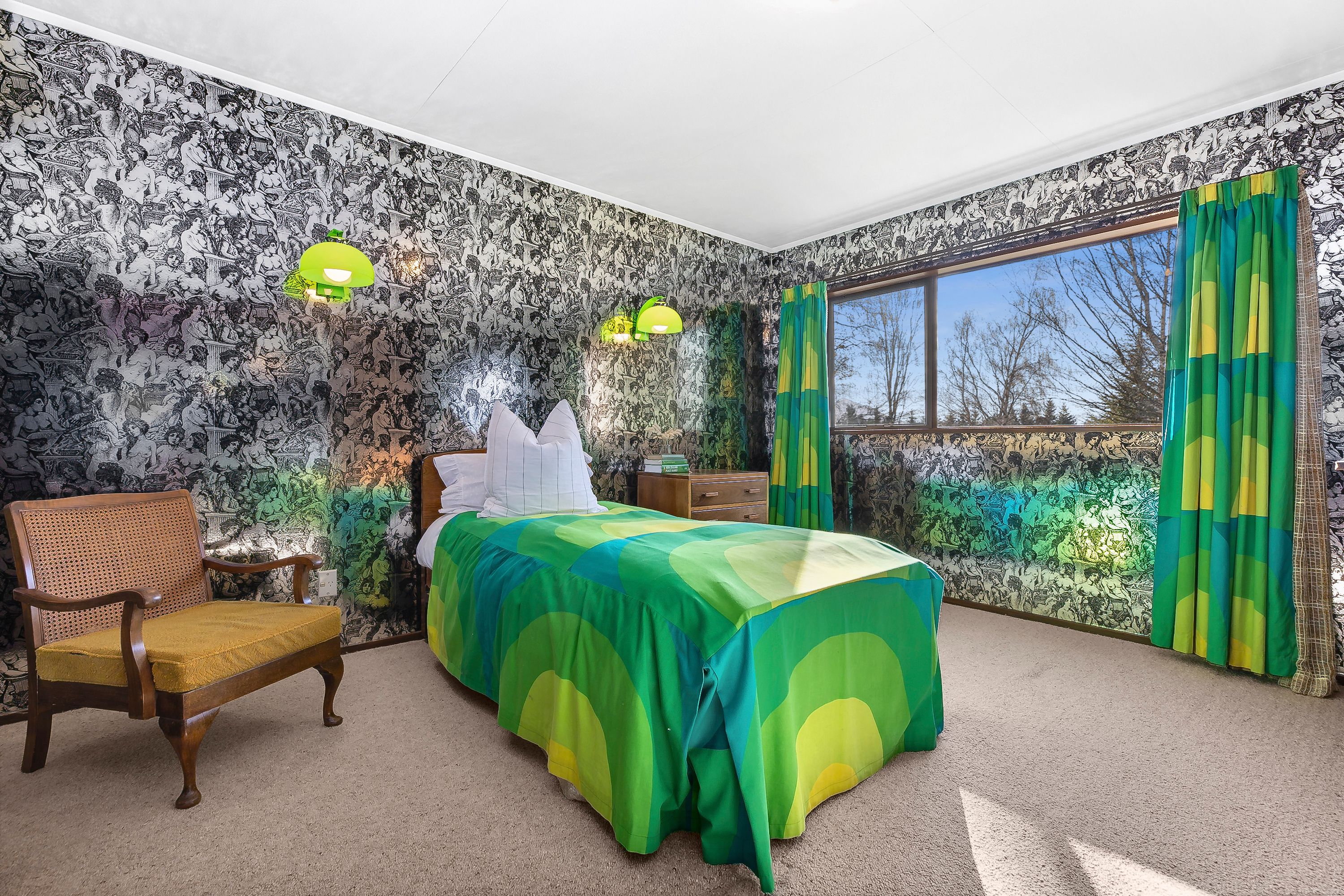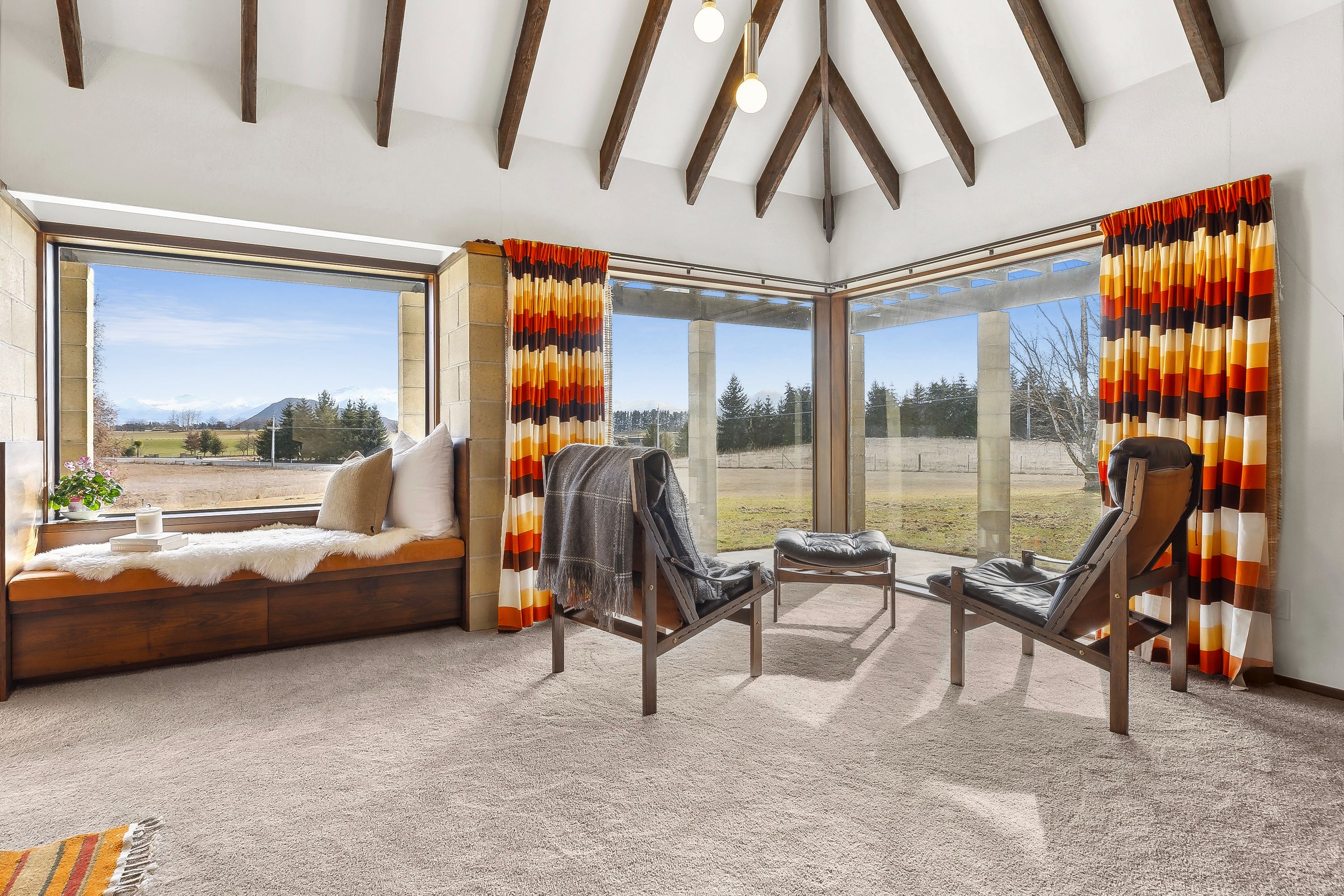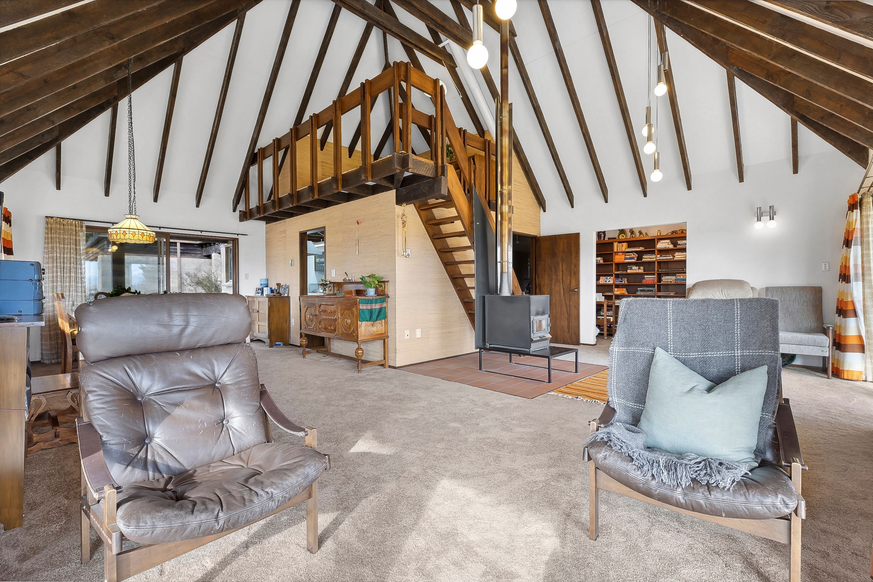 The living room is the heart of this home, boasting a wood burner and a North-facing aspect that bathes the space in sunlight while offering breathtaking views of the snow-capped mountains. Relax on the cozy window seat with a book from the library nook, or work from home in the convenient mezzanine office. The high ceilings and exposed beams add a touch of elegance that are a classic nod to the era, while the wallpaper and decor are simply groovy, baby.