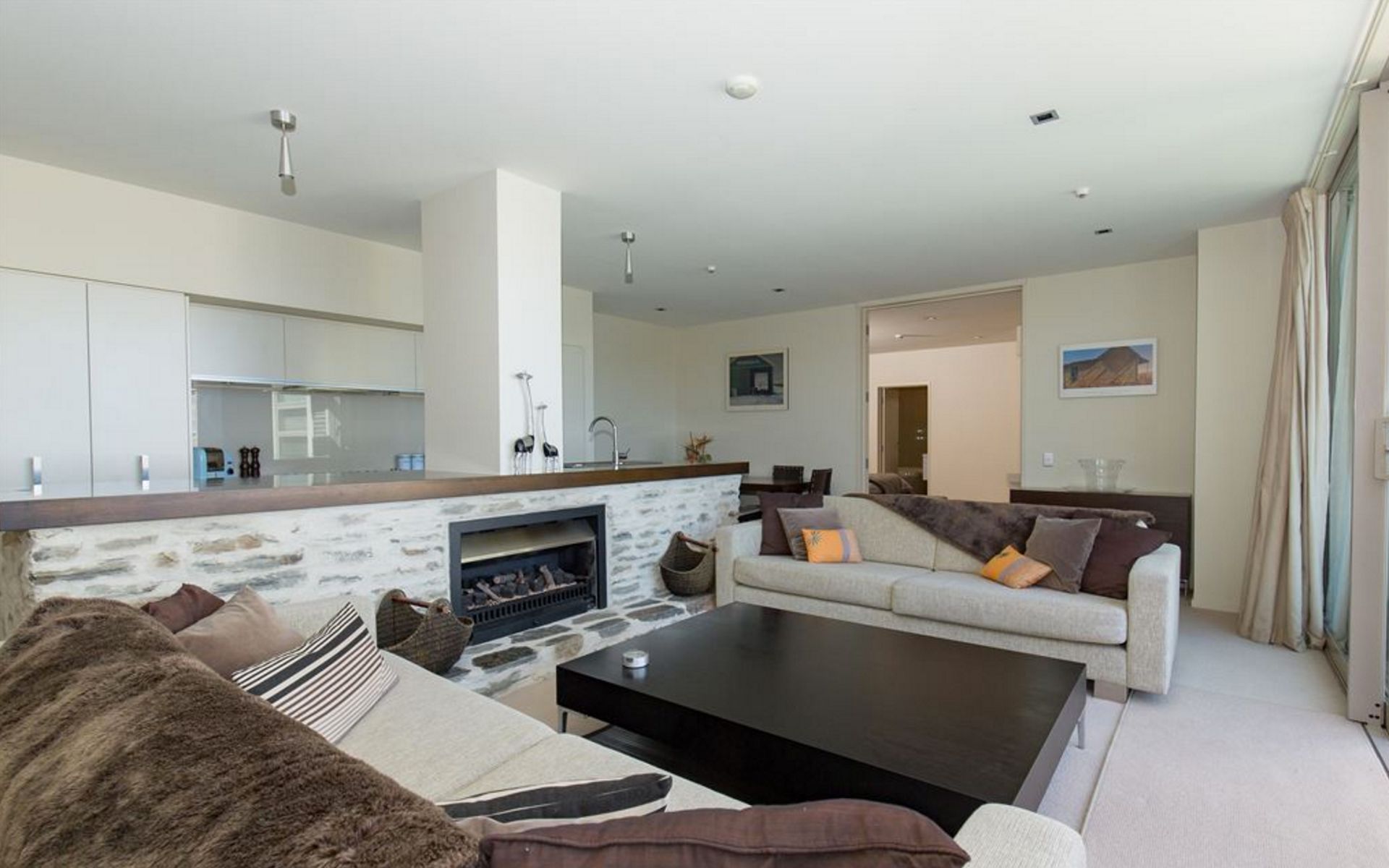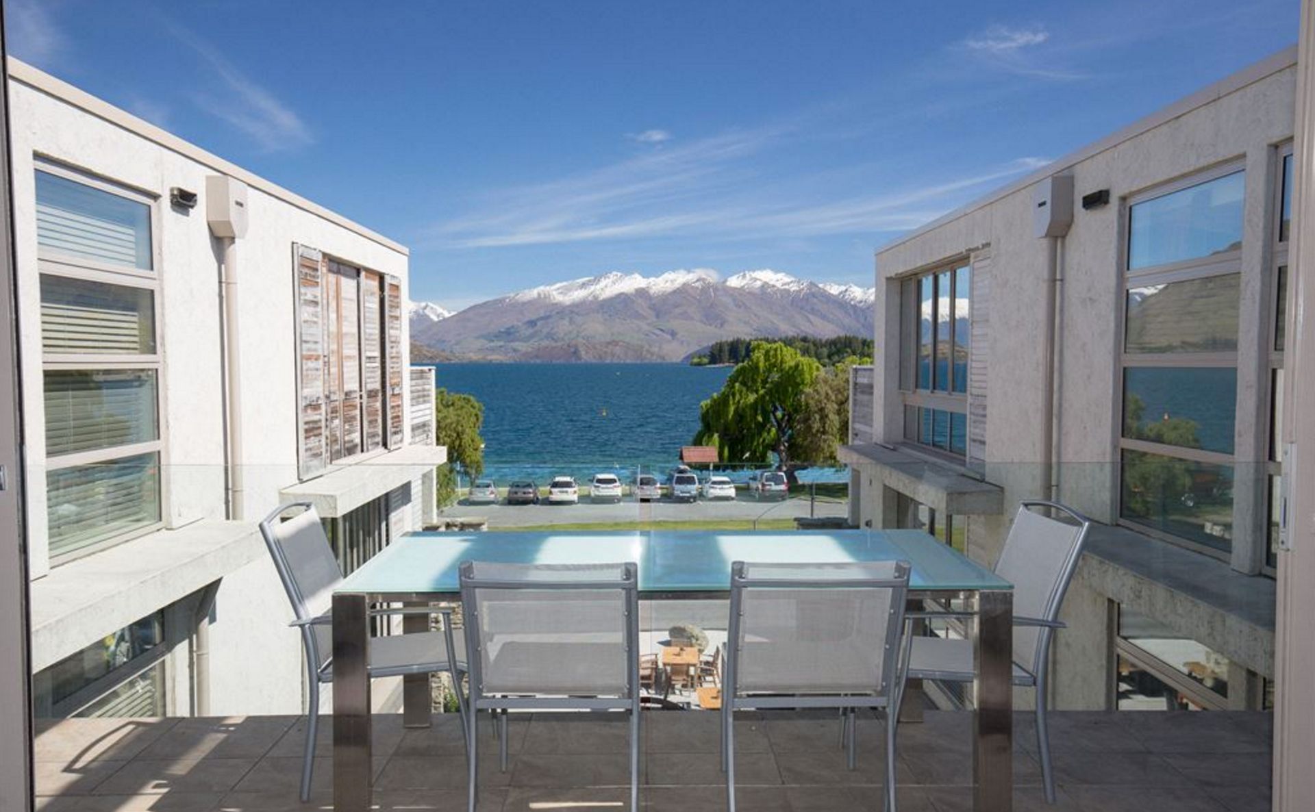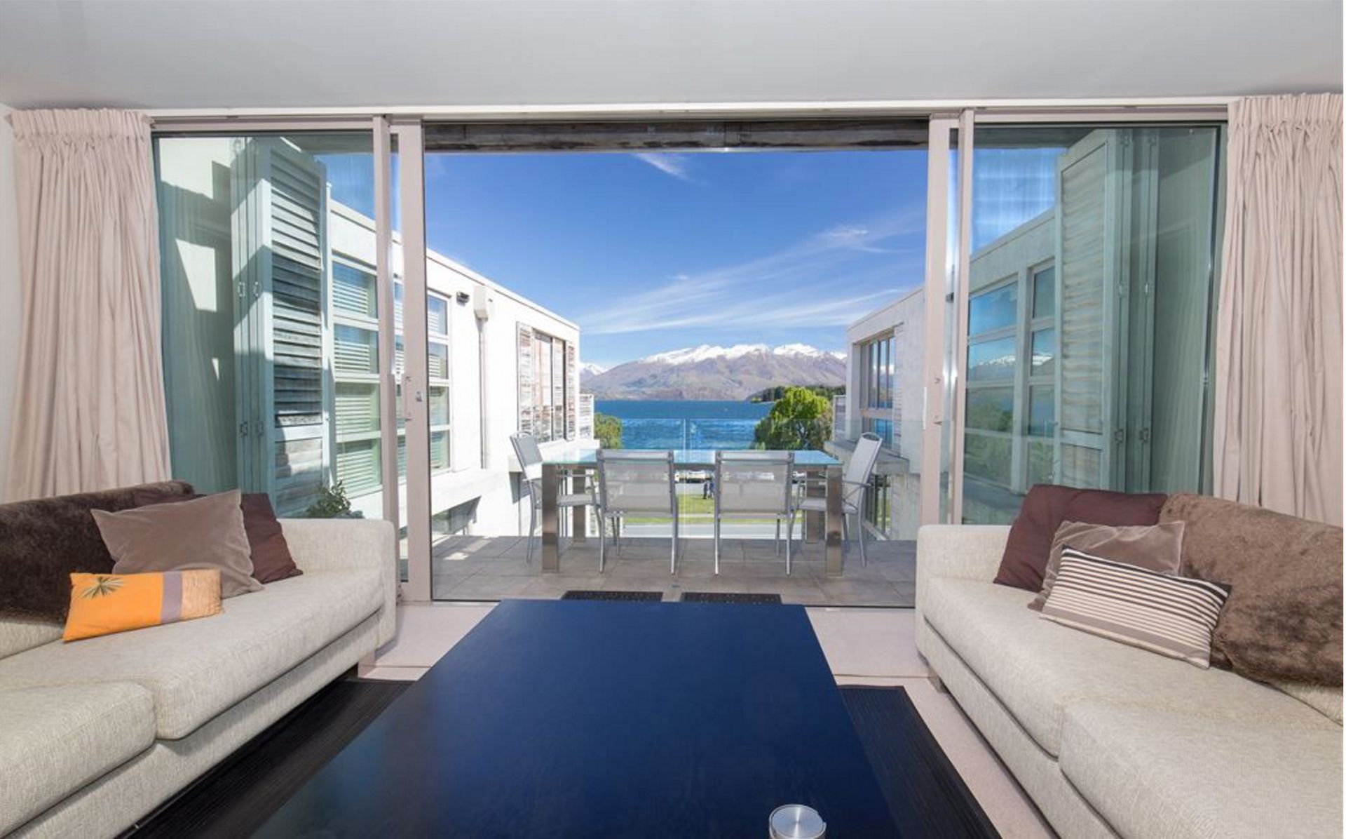 Two ensuited bedrooms flank the central living spaces with fire place setting and beautiful views straight up the lake.