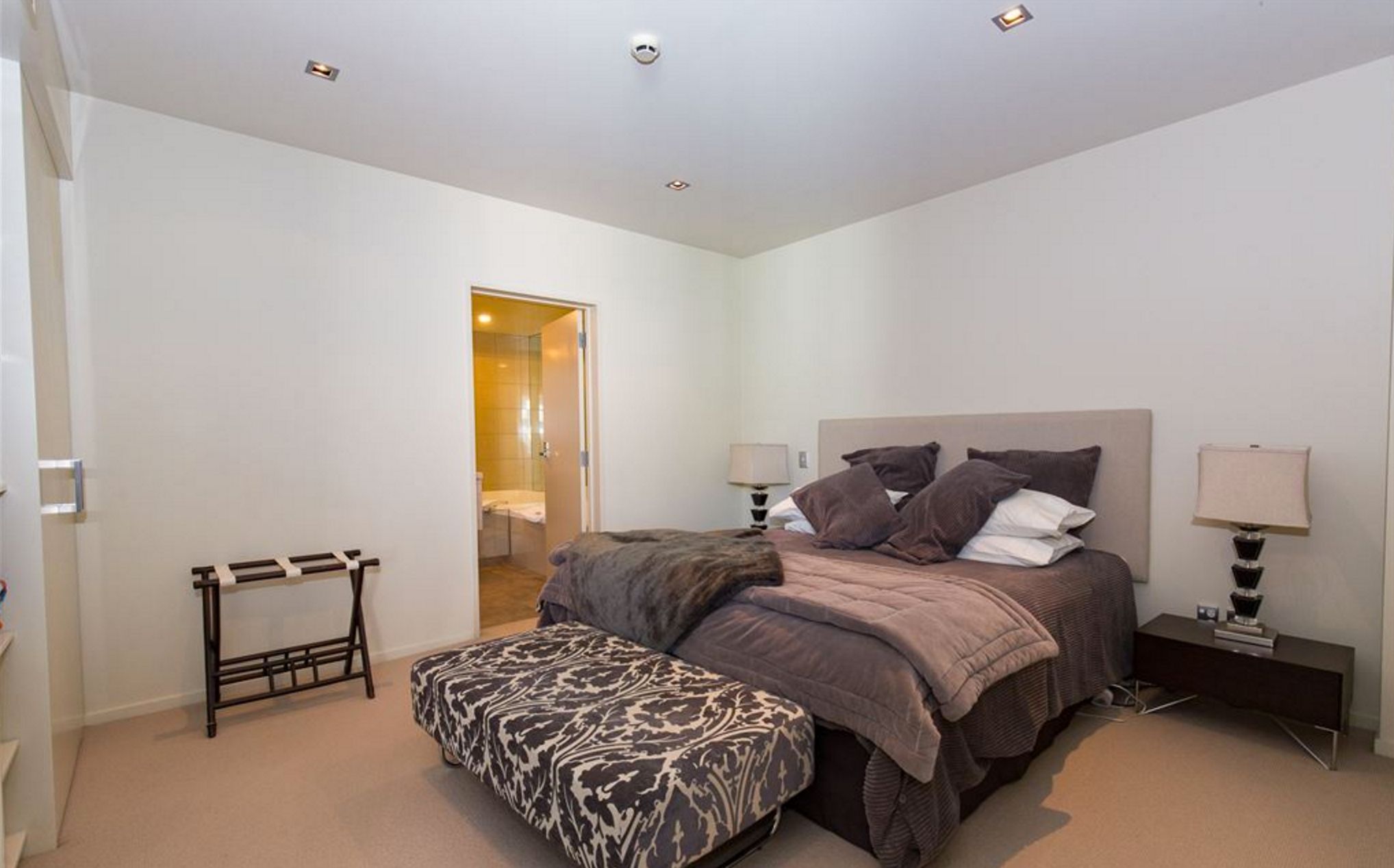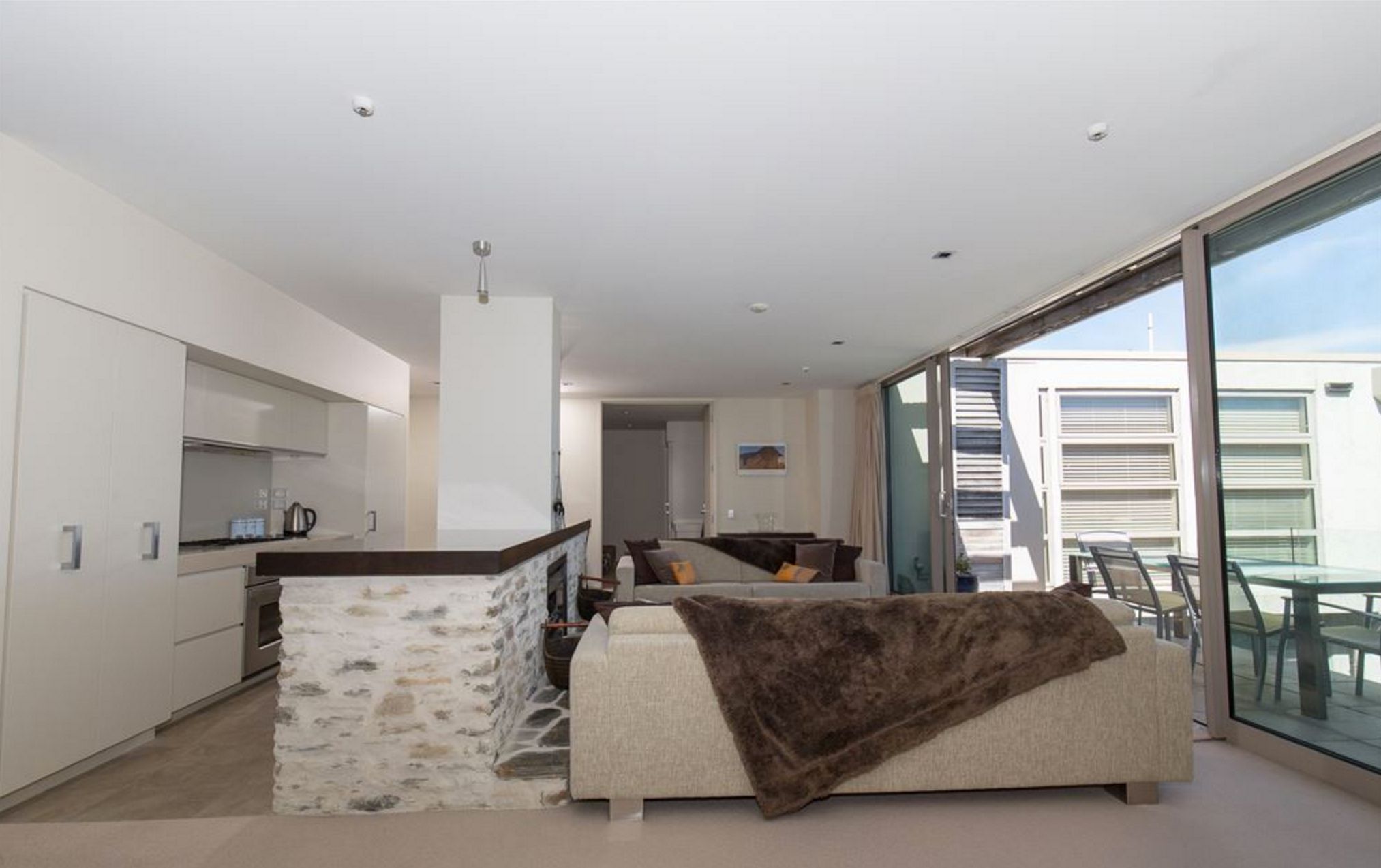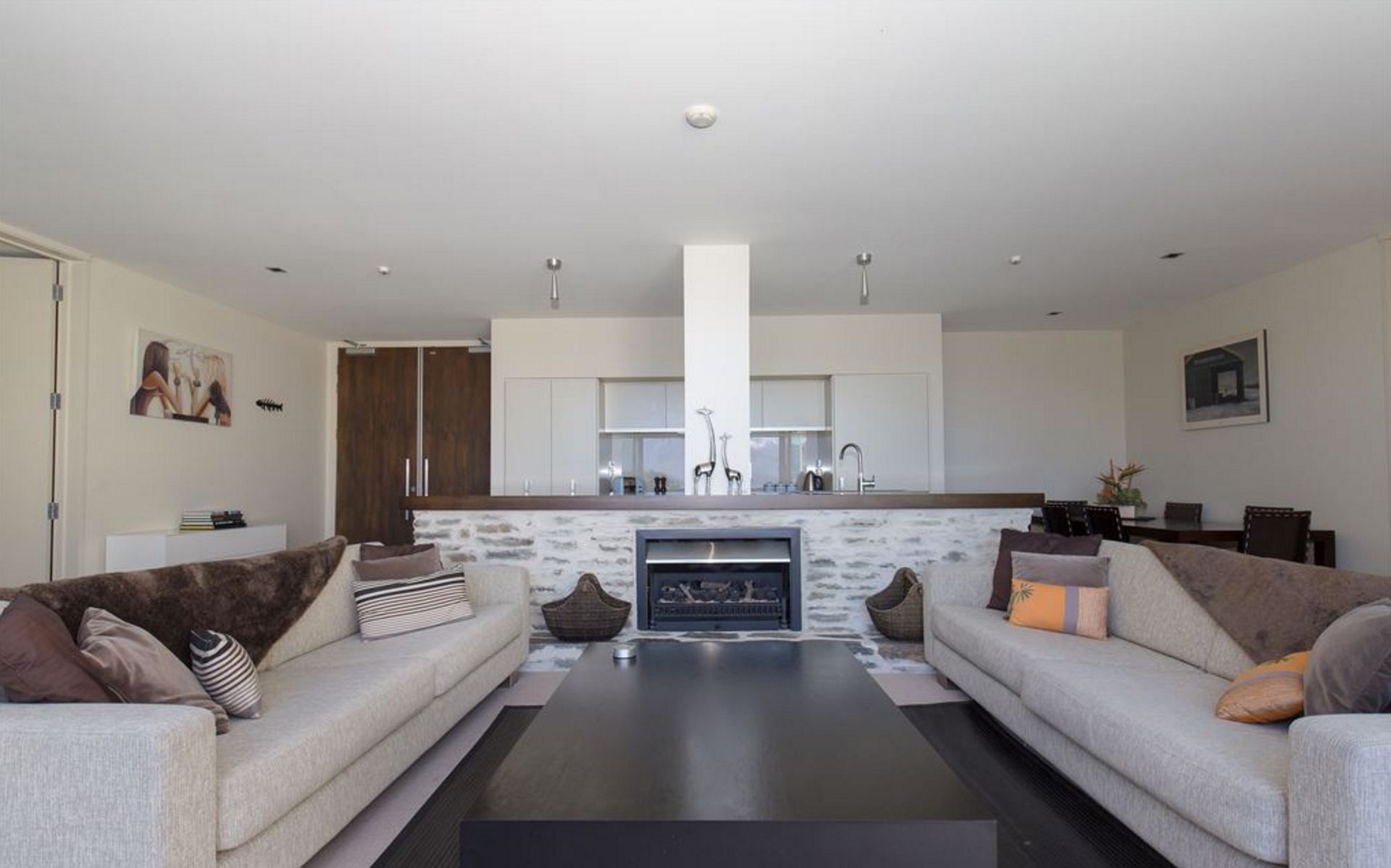 Two ensuited bedrooms flank the central living spaces with fire place setting and beautiful views straight up the lake.