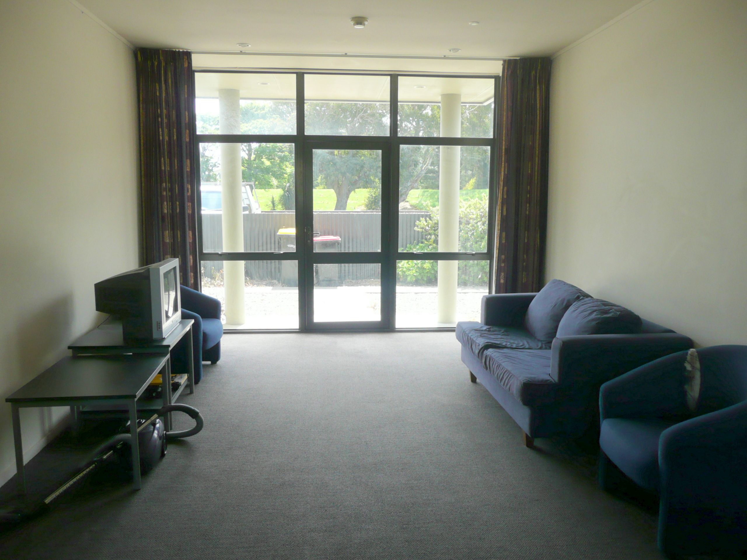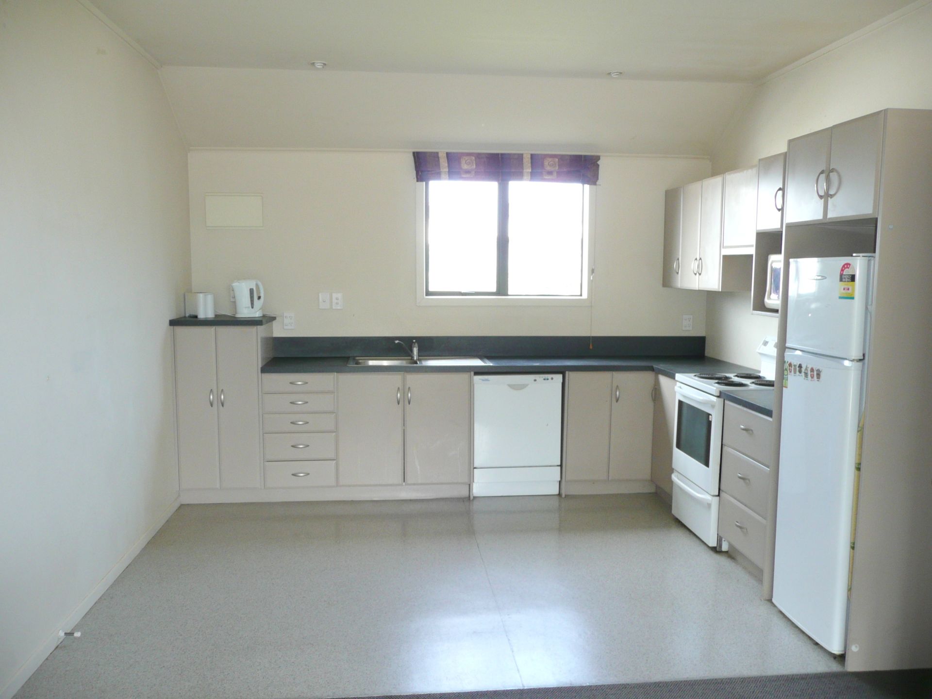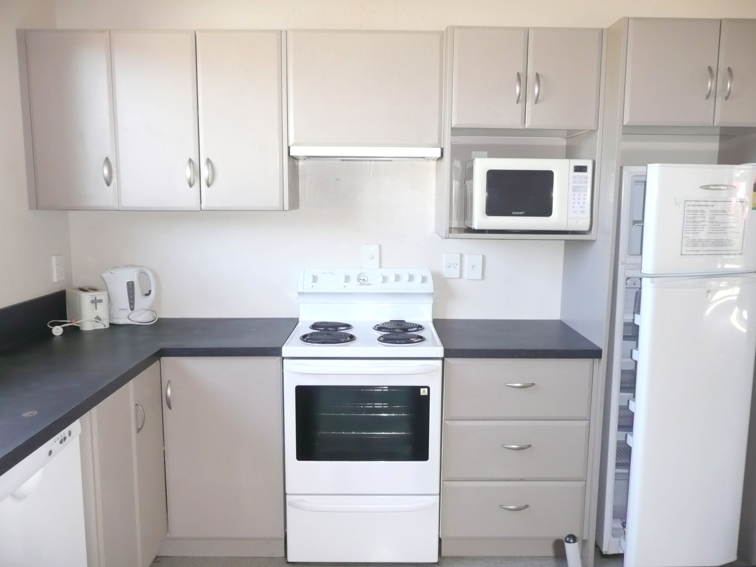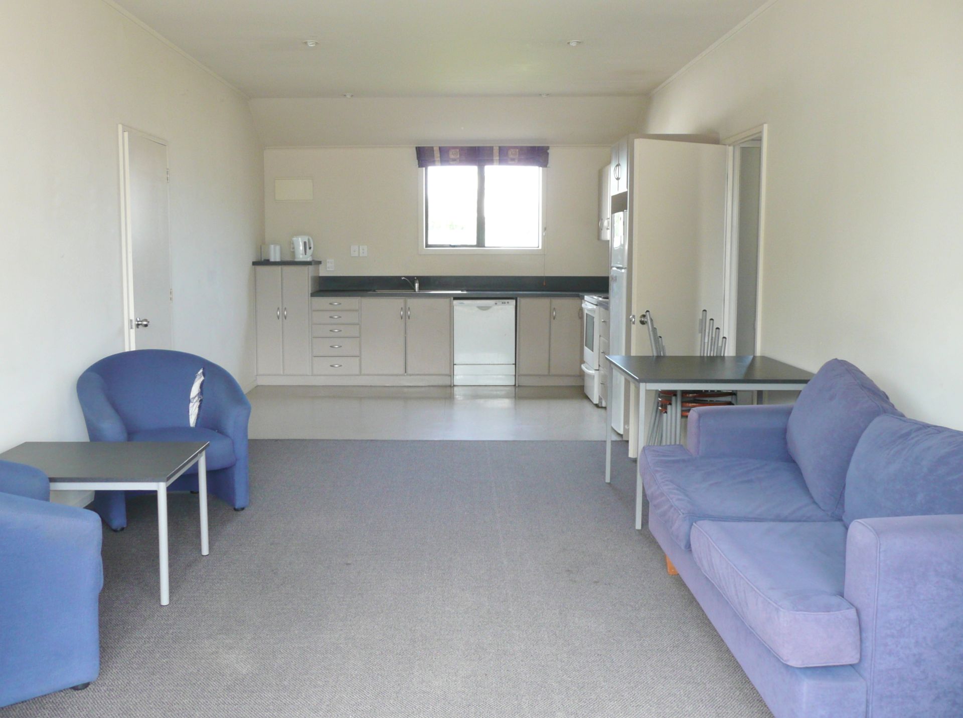 A small laundry includes washing machine, drier, ironing board & vacuum cleaner while the open plan lounge & kitchen includes lounge suite, kitchen table & chairs, fridge, microwave & dishwasher. Just fill the cupboards & you are ready to go!
