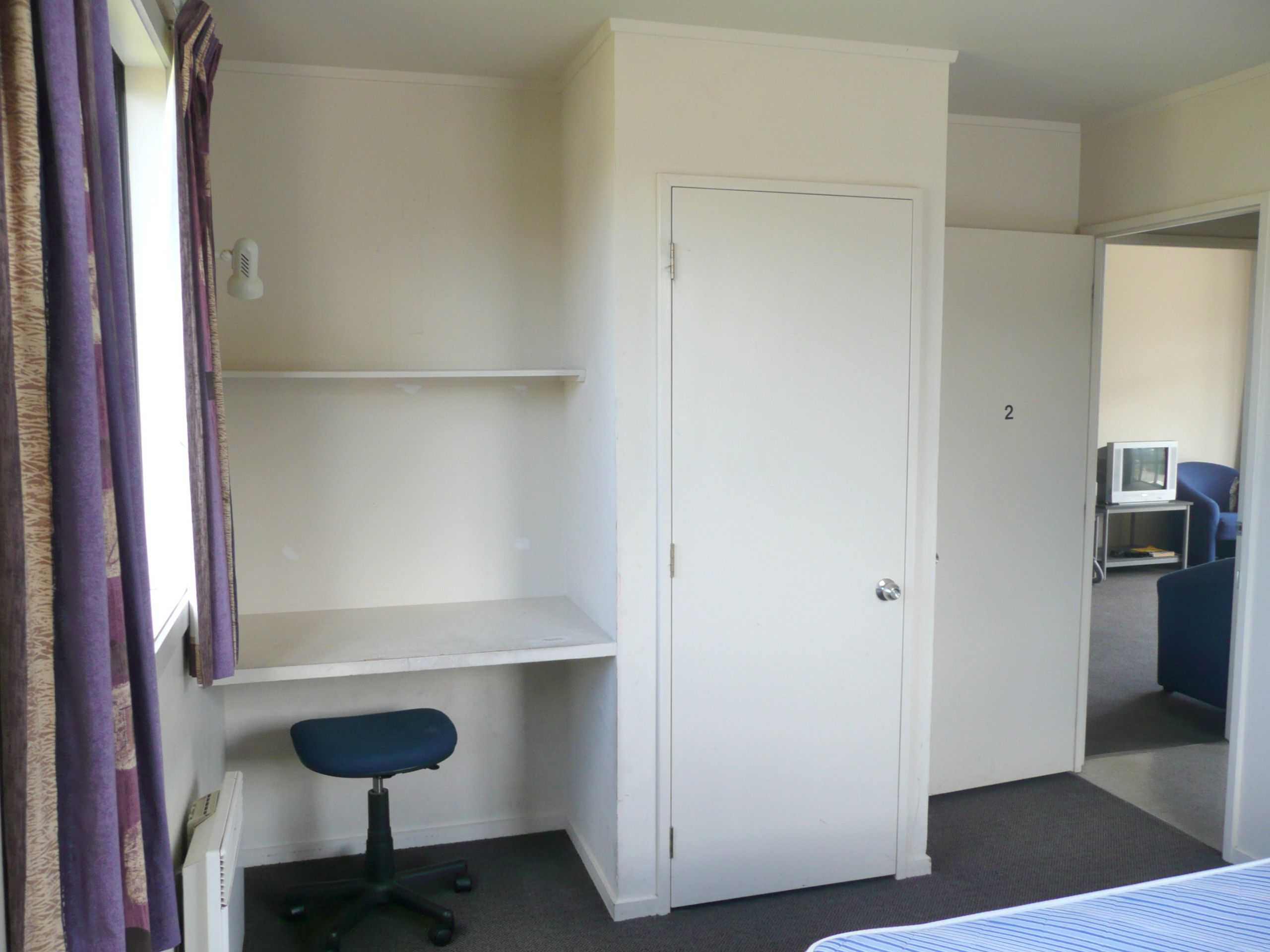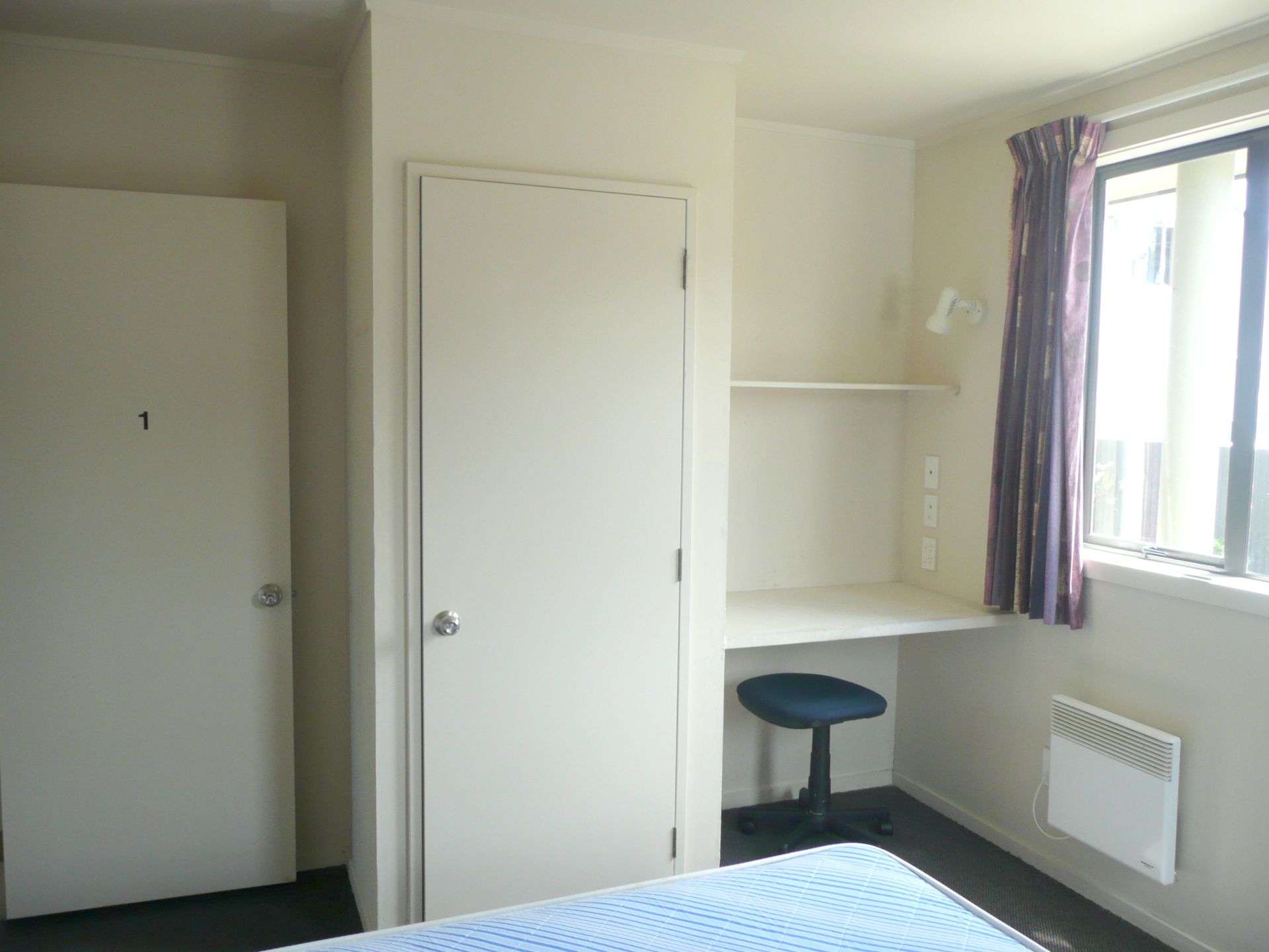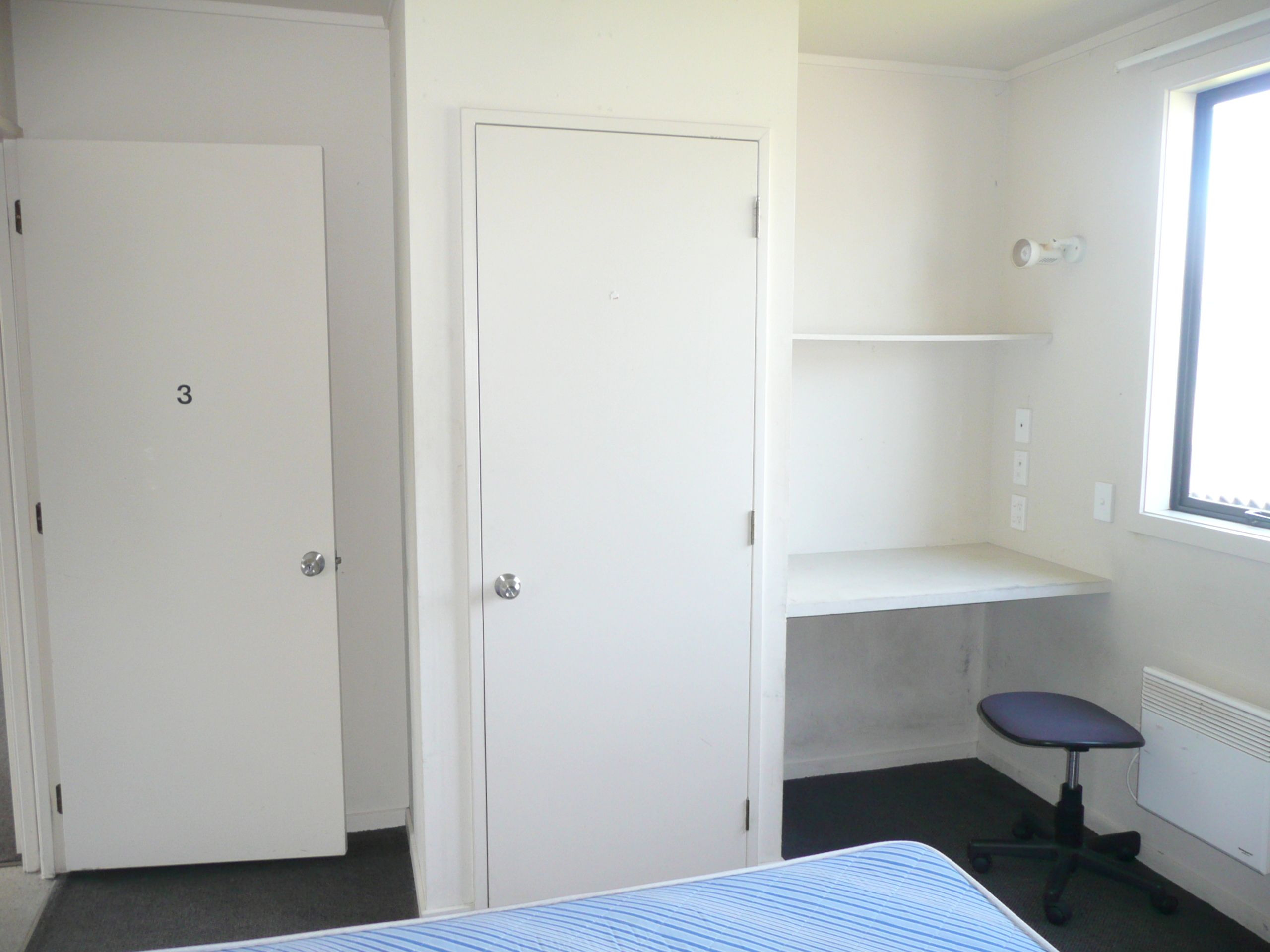 Each male bedroom includes a double bed, bedside table, built in desk & wardrobe as well as a panel heater. (Linen is not supplied) & the apartment is set up as a "mirror image" with 2 bedrooms & a bathroom coming off each hallway.