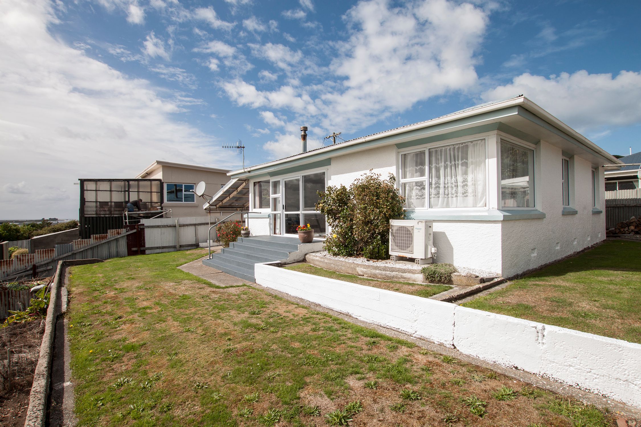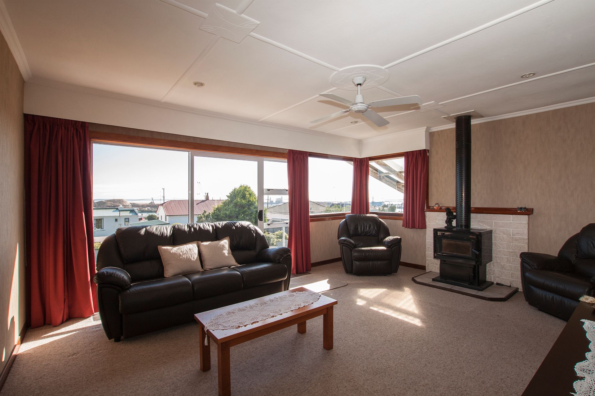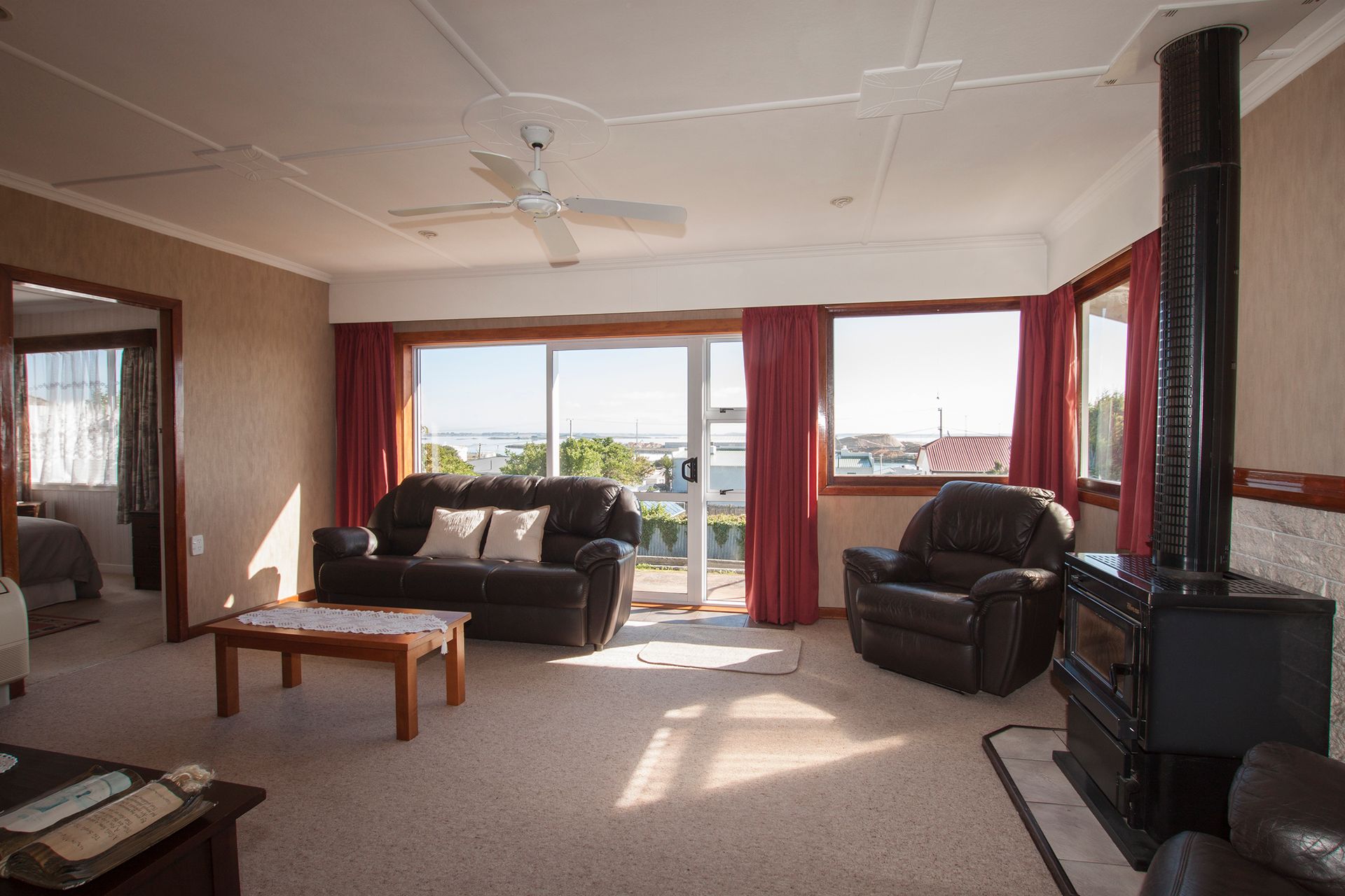 The three bedrooms are a good size all with wardrobes, the drapes and wallpaper are in great condition and they have new carpet. The lounge is a good size and faces North out over the harbour and the views are great, there is a heat pump and burner and also has a ceiling fan to circulate the heat.