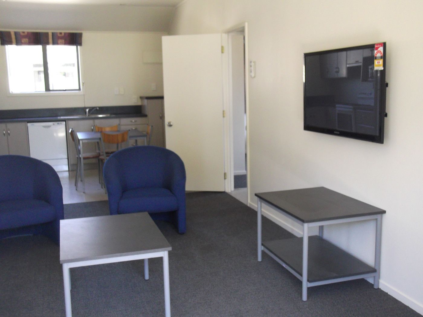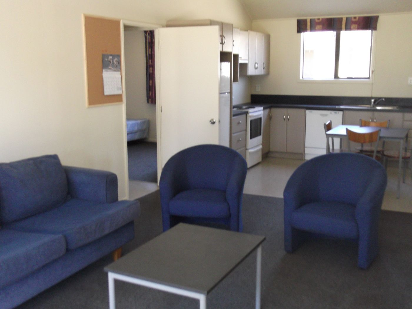 The kitchen and living area has a couch and chairs, coffee table, TV, fridge/freezer, dining table and chairs. Small appliances and cutlery are not provided.