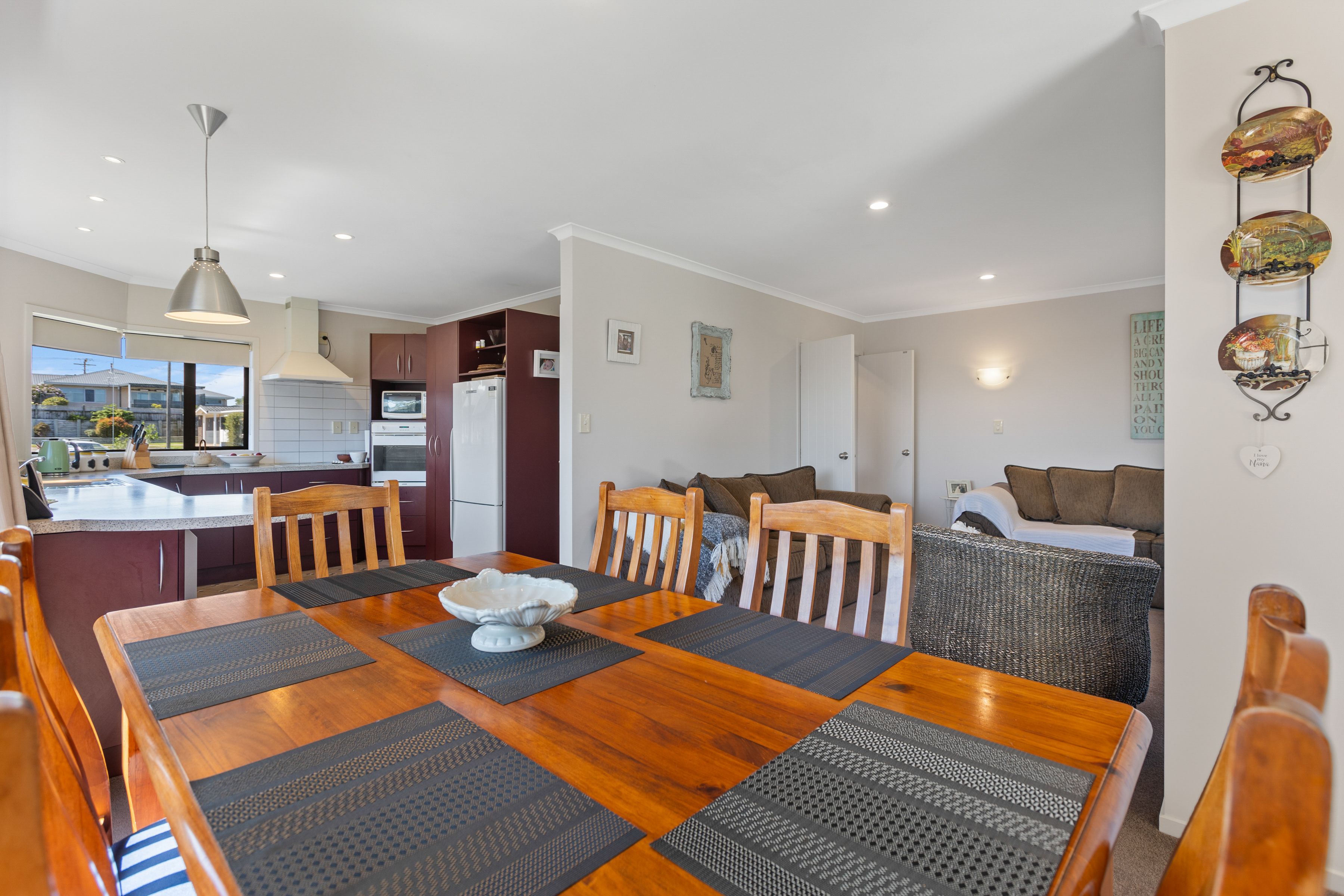 The dining area opens out onto a sheltered, north facing outdoor entertaining area. The living room has a gas fireplace for ambience and warmth in the cooler winter months.