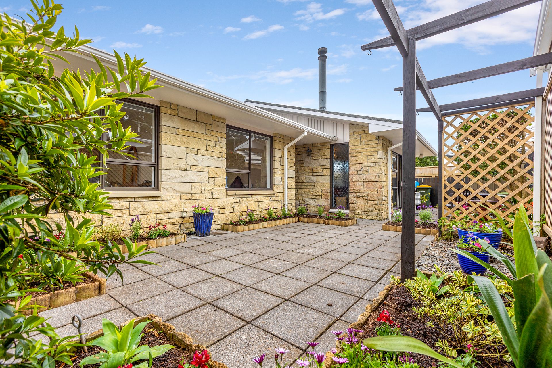 The fully fenced section has raised flower beds and an outdoor courtyard provides a private place to enjoy summer barbecues.