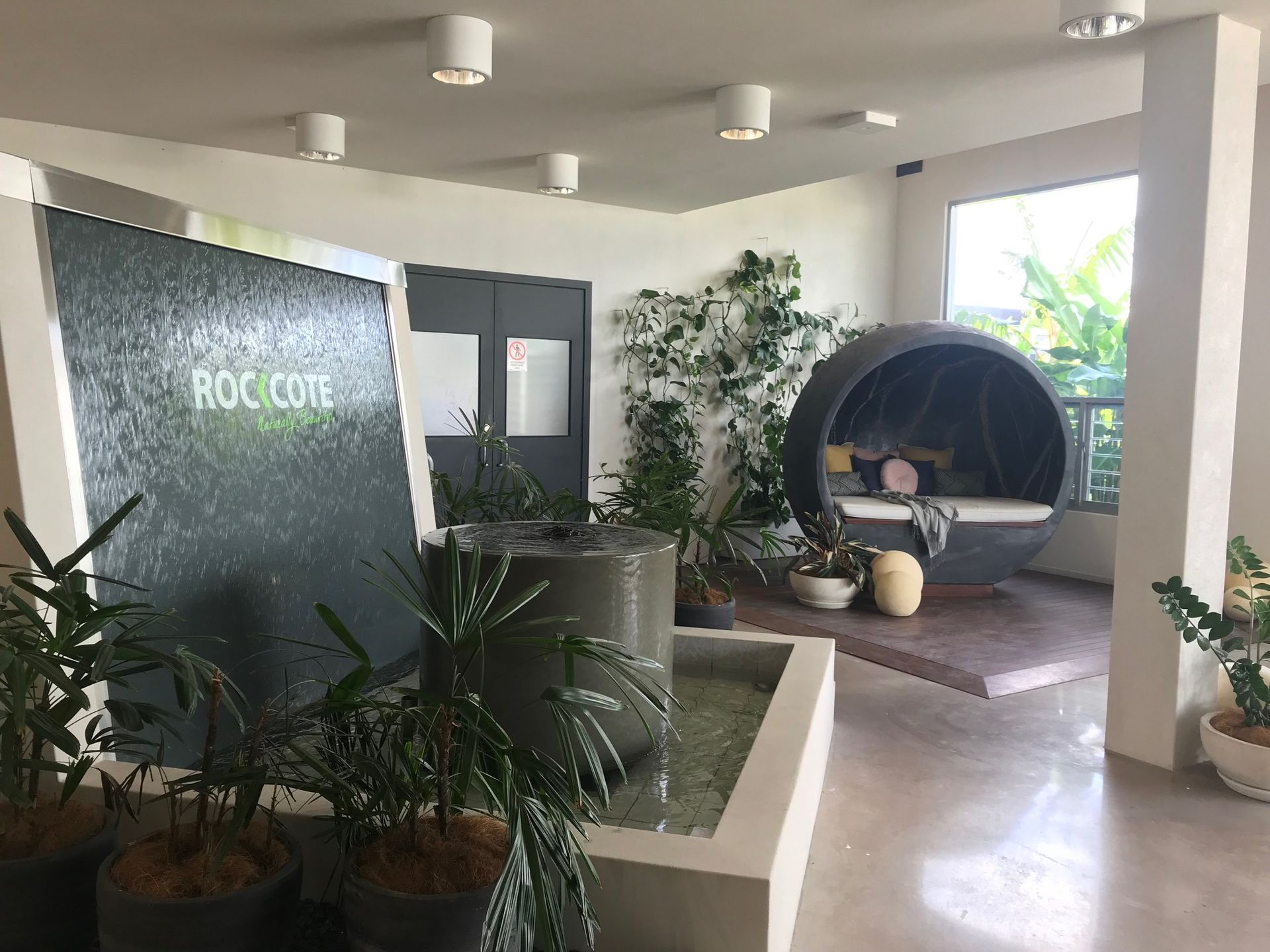 - Security building with lobby entrance and water feature