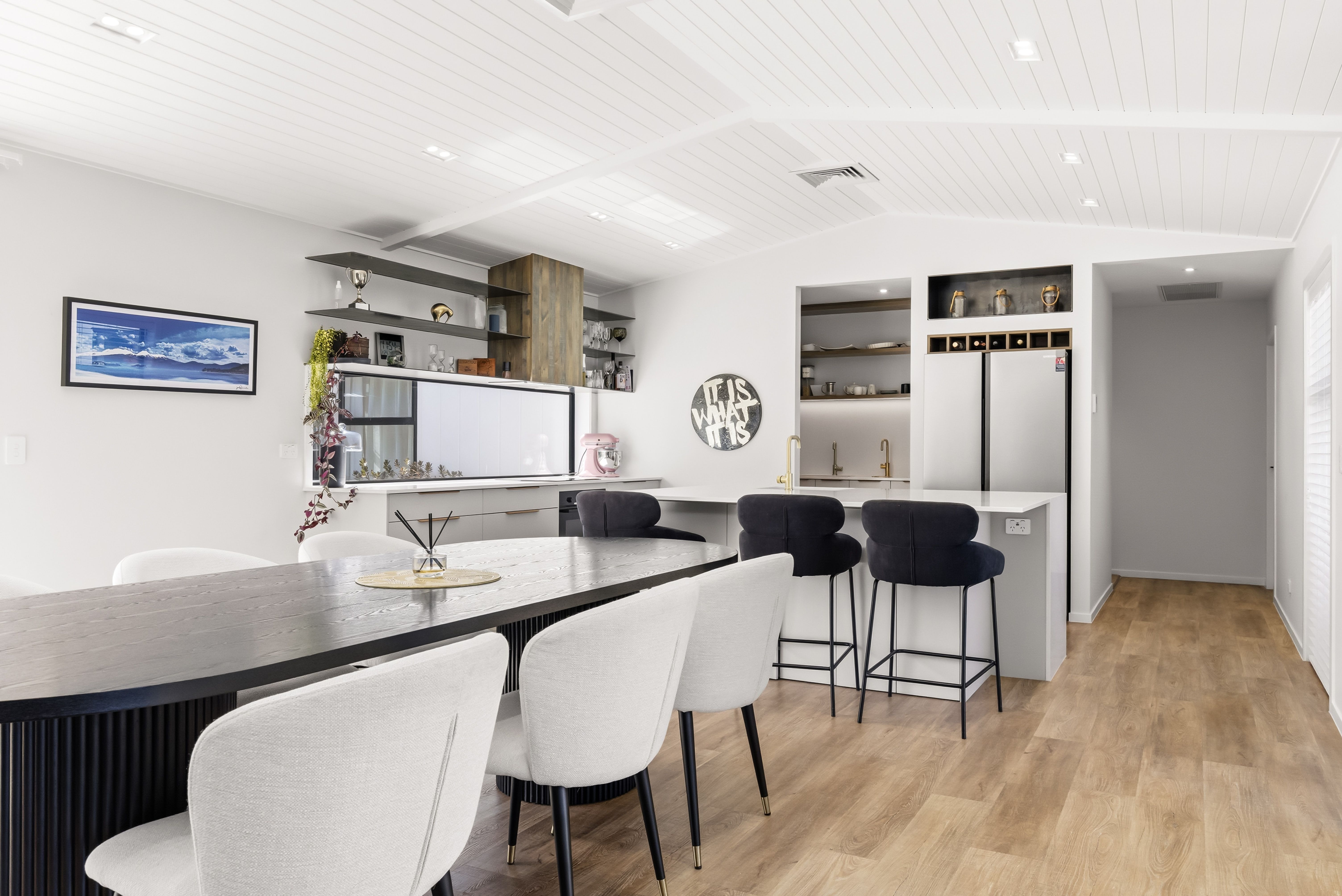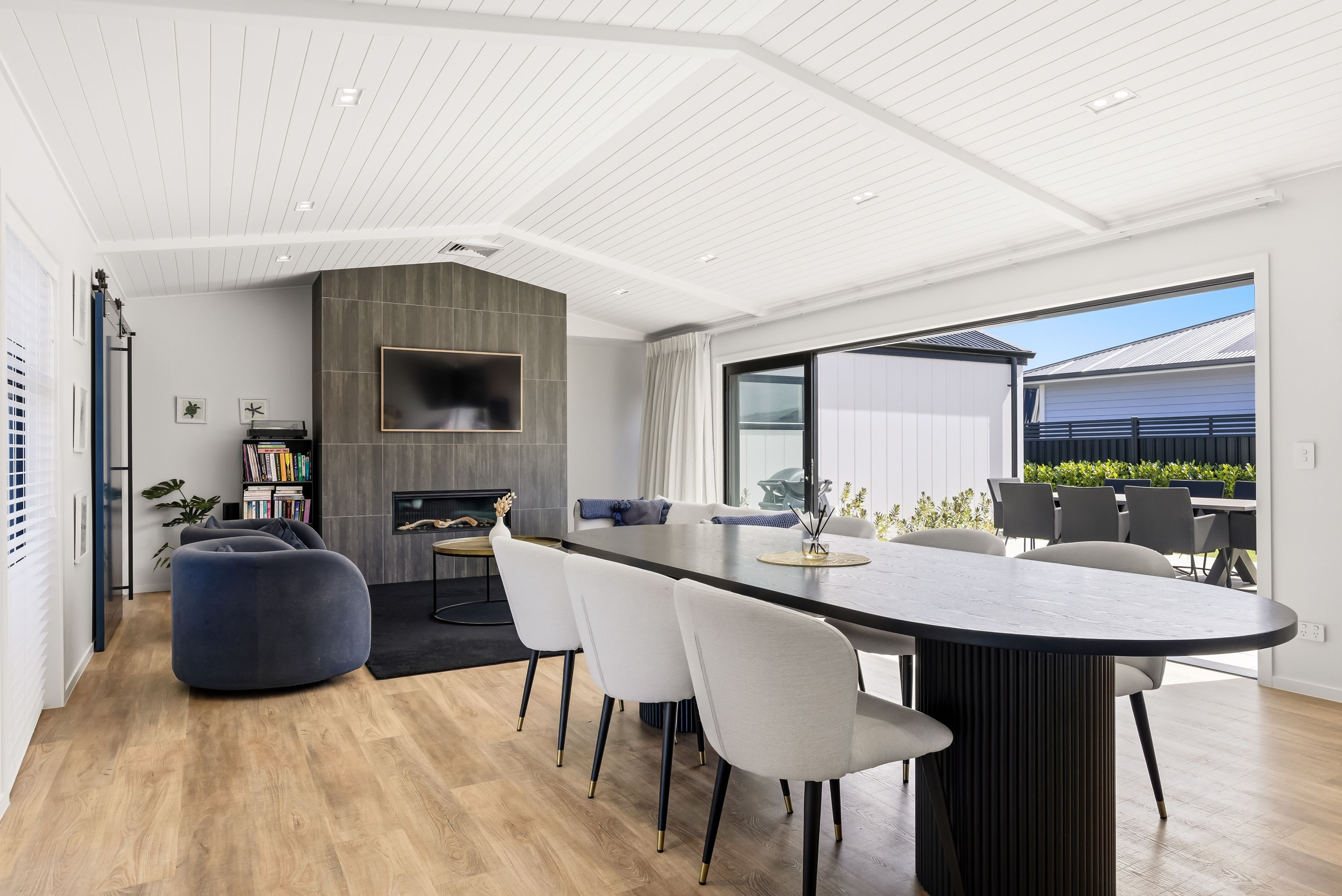 The kitchen anchors the home in style - premium appliances, sleek cabinetry, and an island built for entertaining. It flows seamlessly into expansive open-plan living, where oversized sliders open wide, blurring the line between inside and out.