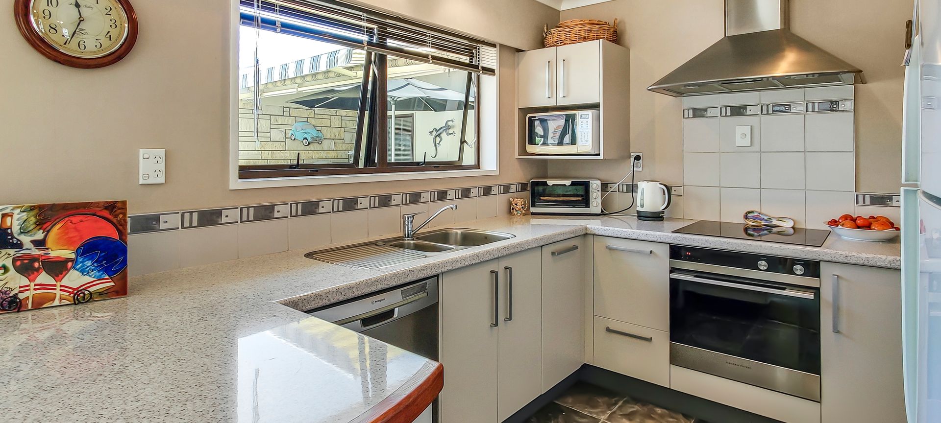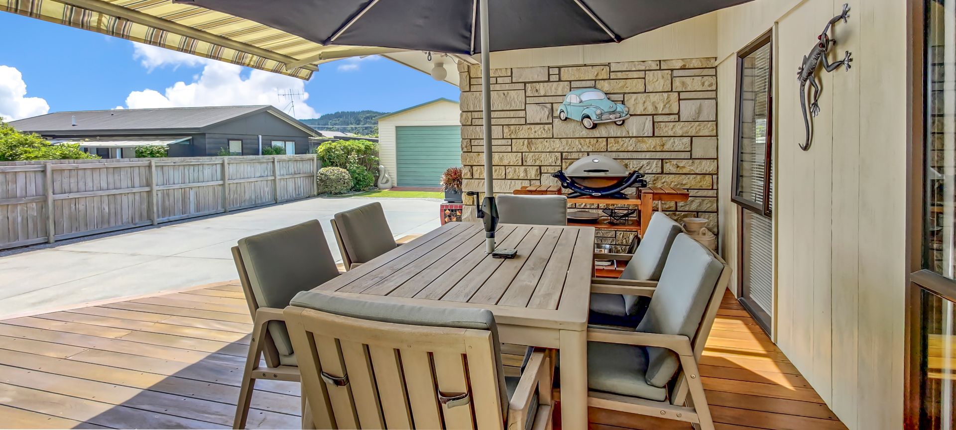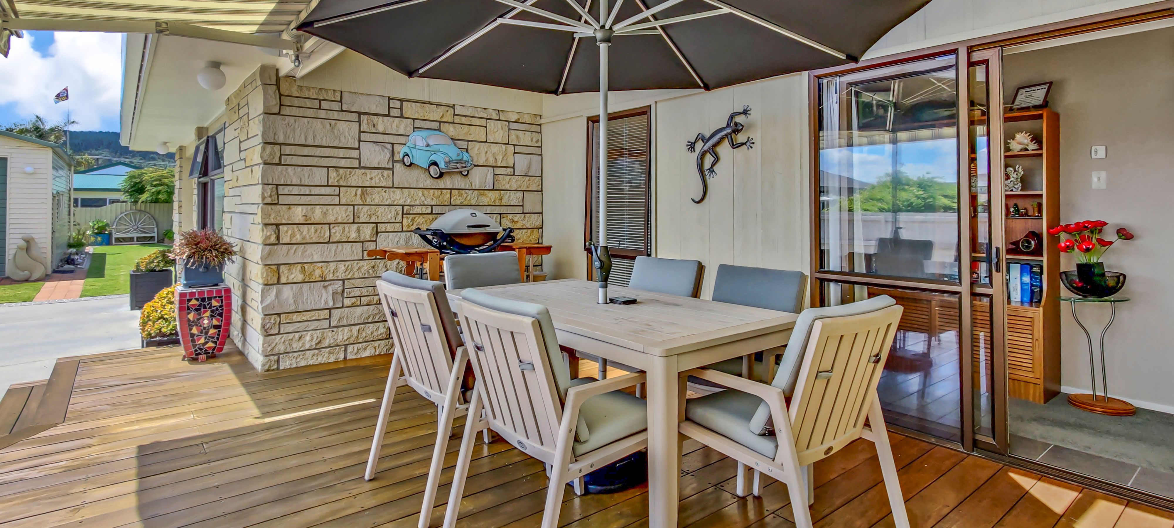 Living room opens to a covered terrace to watch the world go by, and is open plan to the dining area and kitchen, which again opens out to the private and sheltered covered outdoor entertaining areas. BBQ, enjoy the sun, or rest with a book in the shade - it is your choice made easier with the electric awning.
