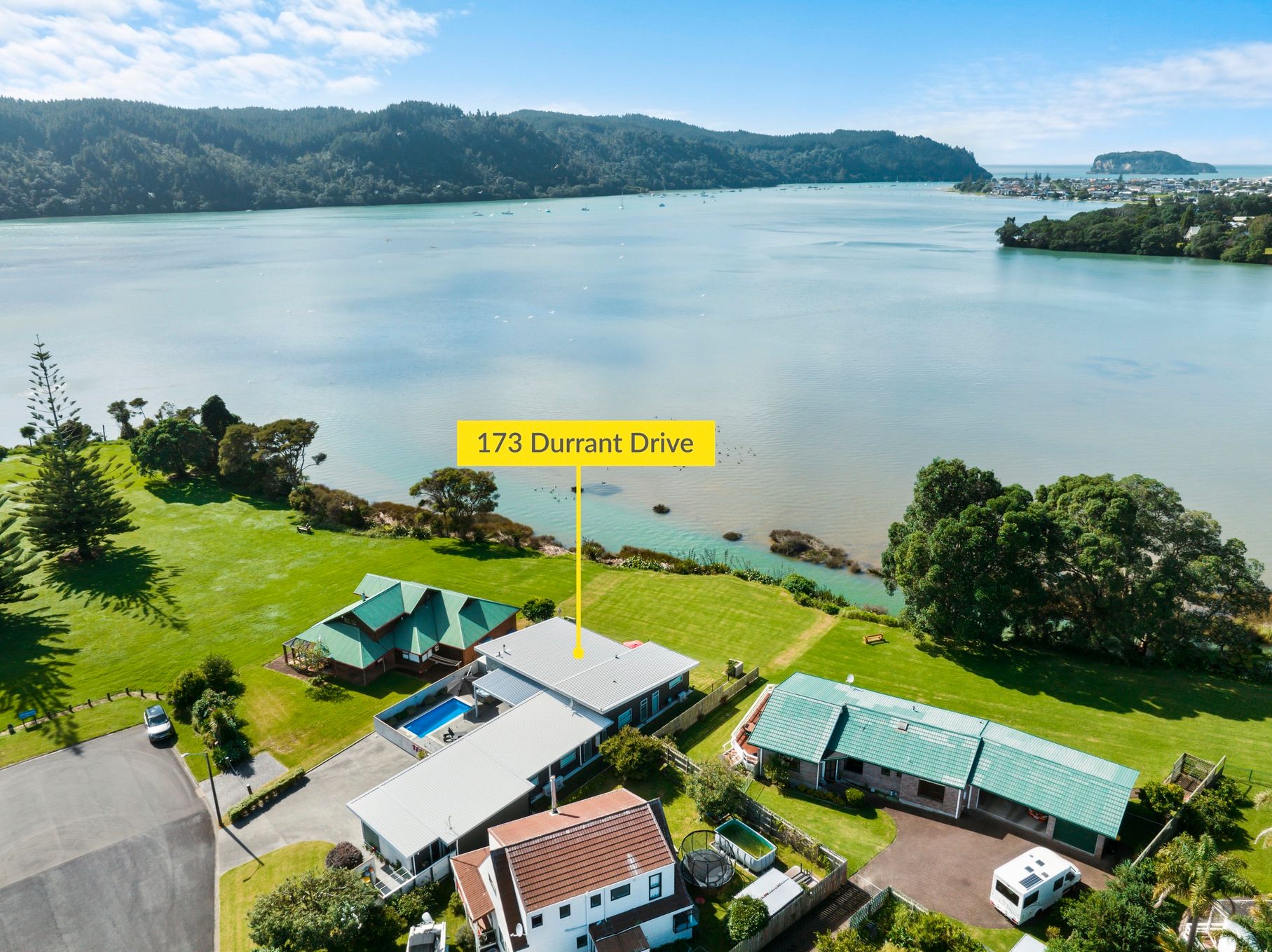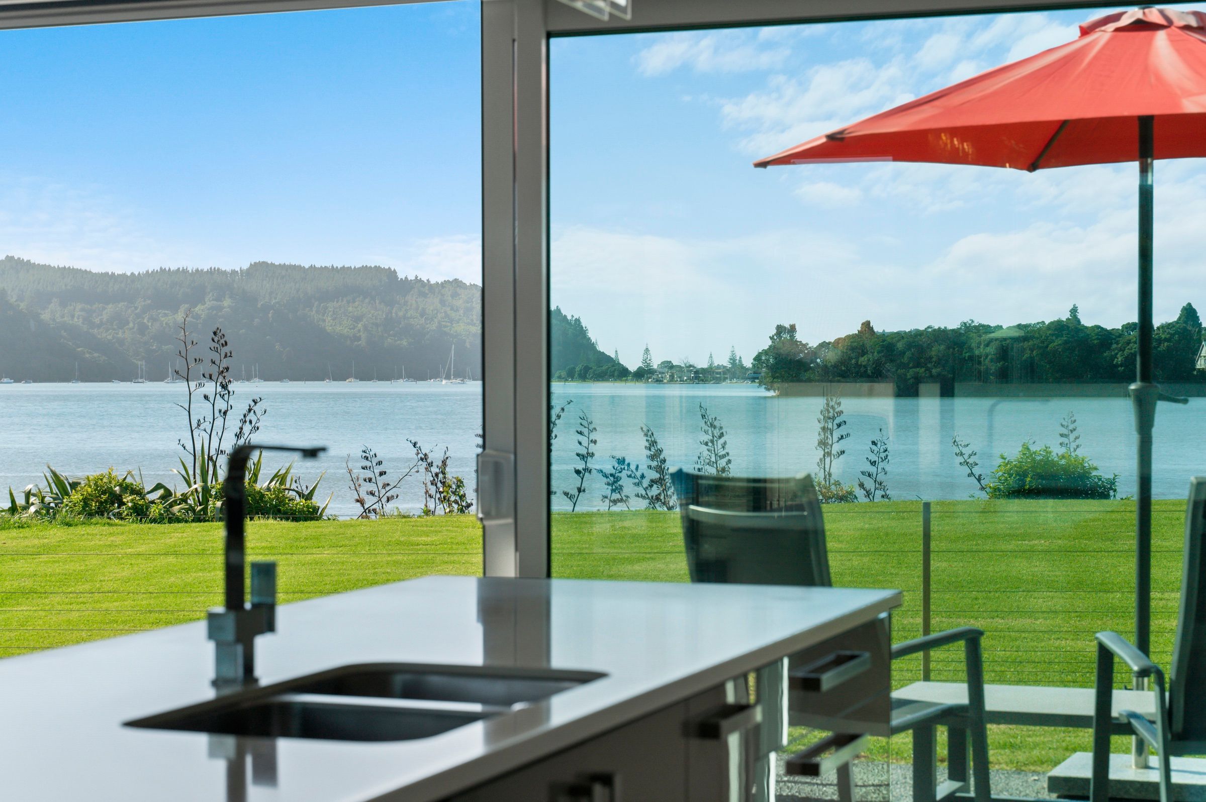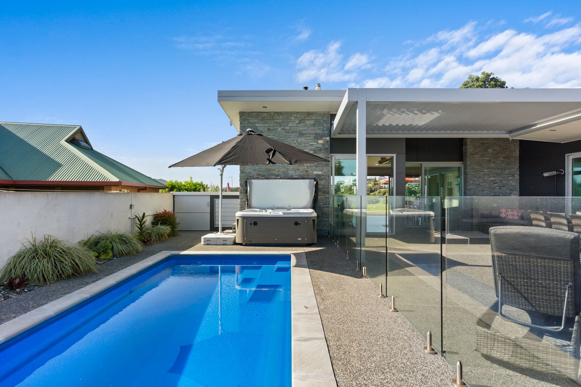 Soak in the unobstructed views of the Whangamata harbour from the comfort of this modern waterfront home. Located in a prime position on the reserve, the resort style courtyard is enclosed, private from passers-by for relaxation and entertaining. Featuring a heated in ground pool, spa pool, water feature and louvres for shade, the property is designed for all year round comfort and seamless indoor outdoor living. Glass sliders throughout flood the home with natural light for maximum views, fully fenced for security and landscaped for minimal maintenance.
