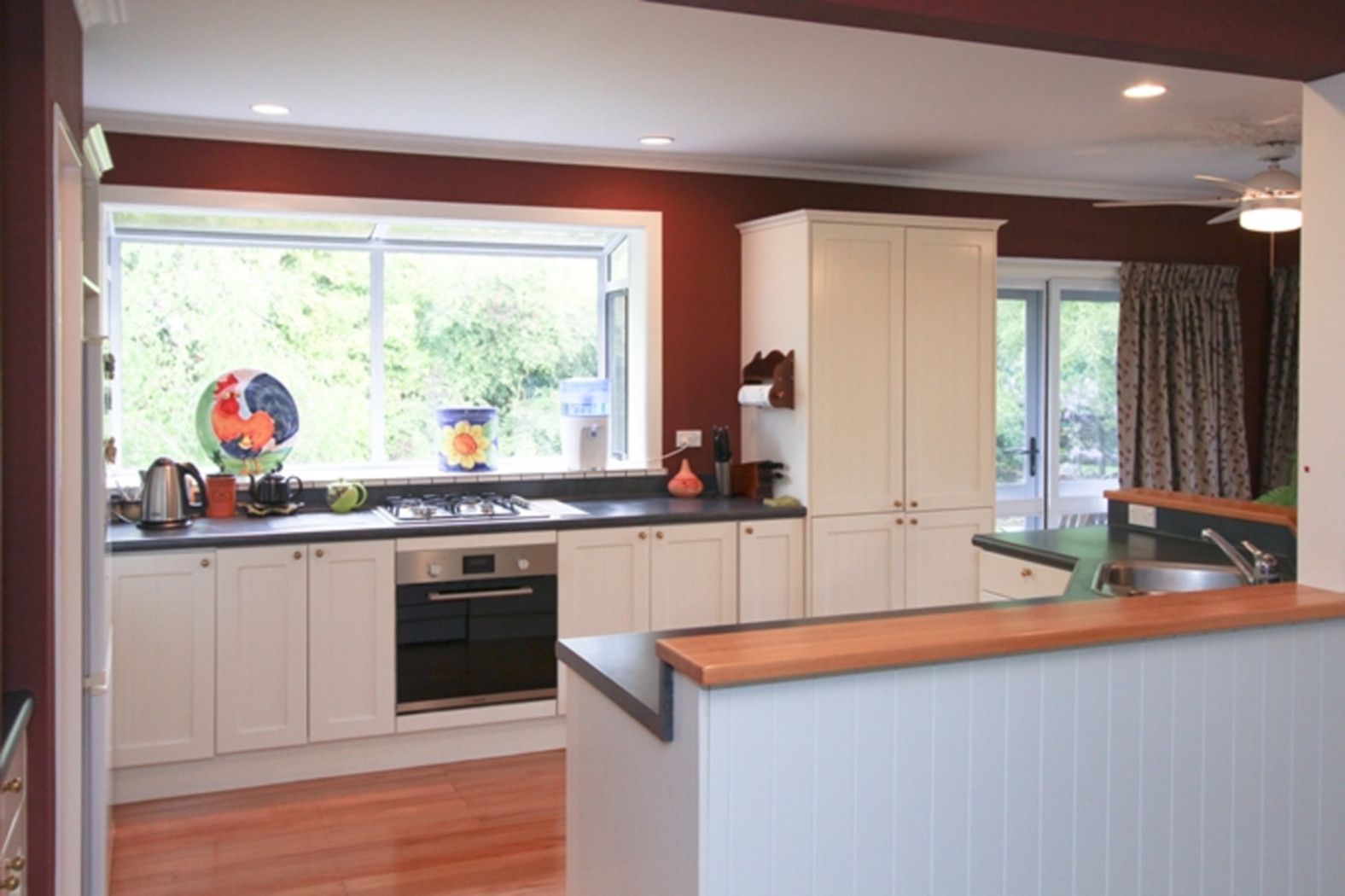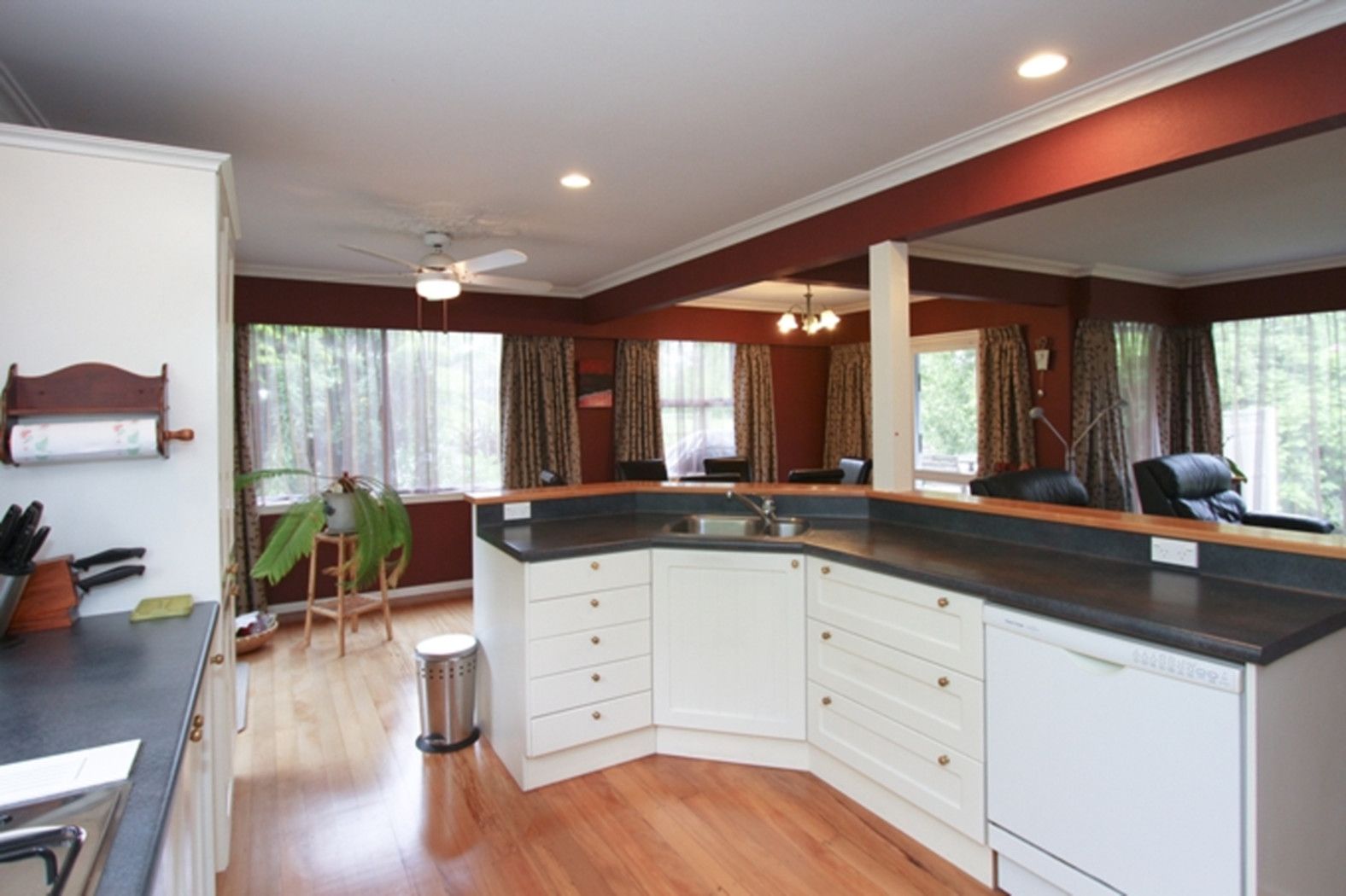 The tastefully renovated northfacing 230m2 1970s Home features 2 living areas and expansive decking for sundrenched private in/outdoor living which spills to the well established garden and views over the property.