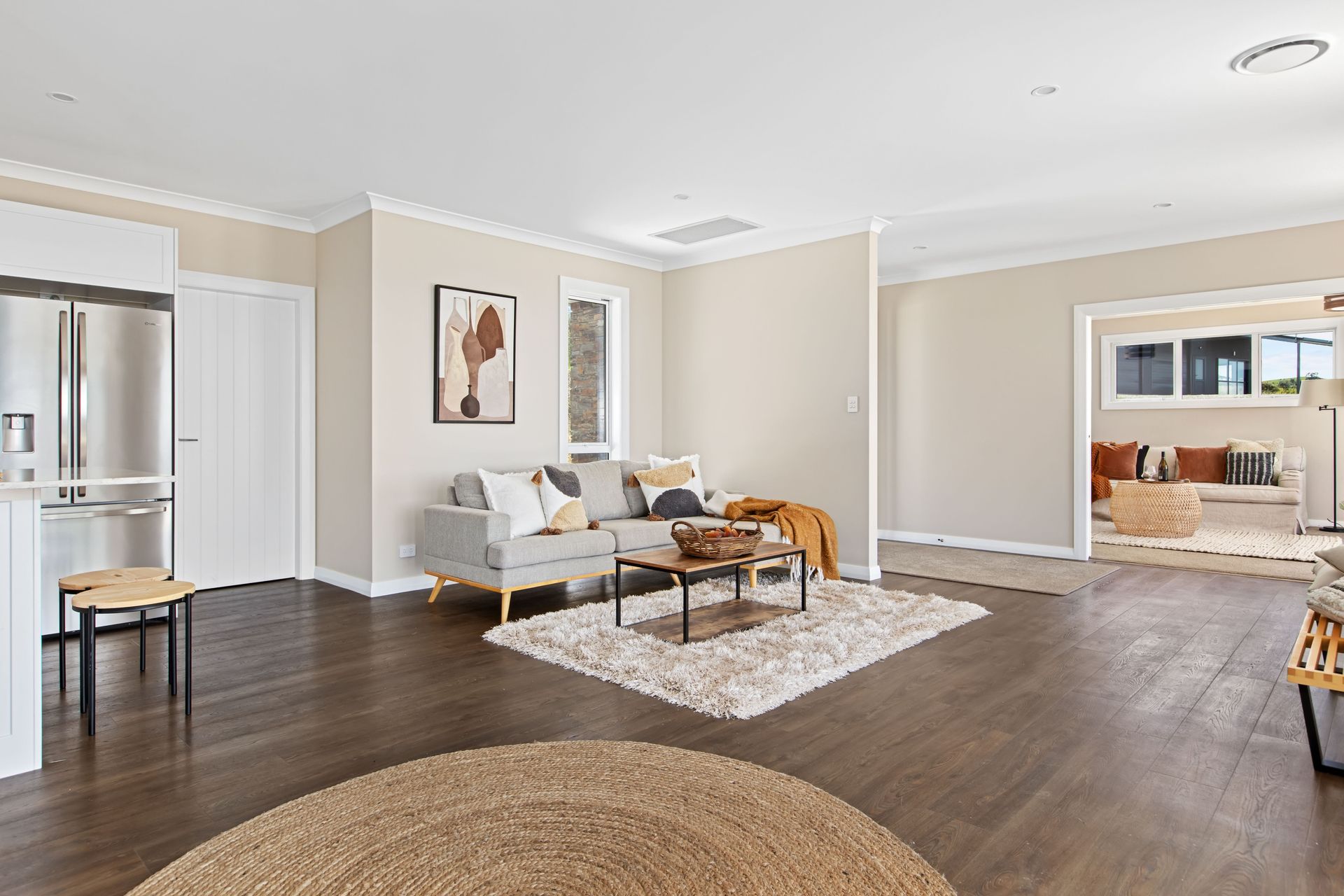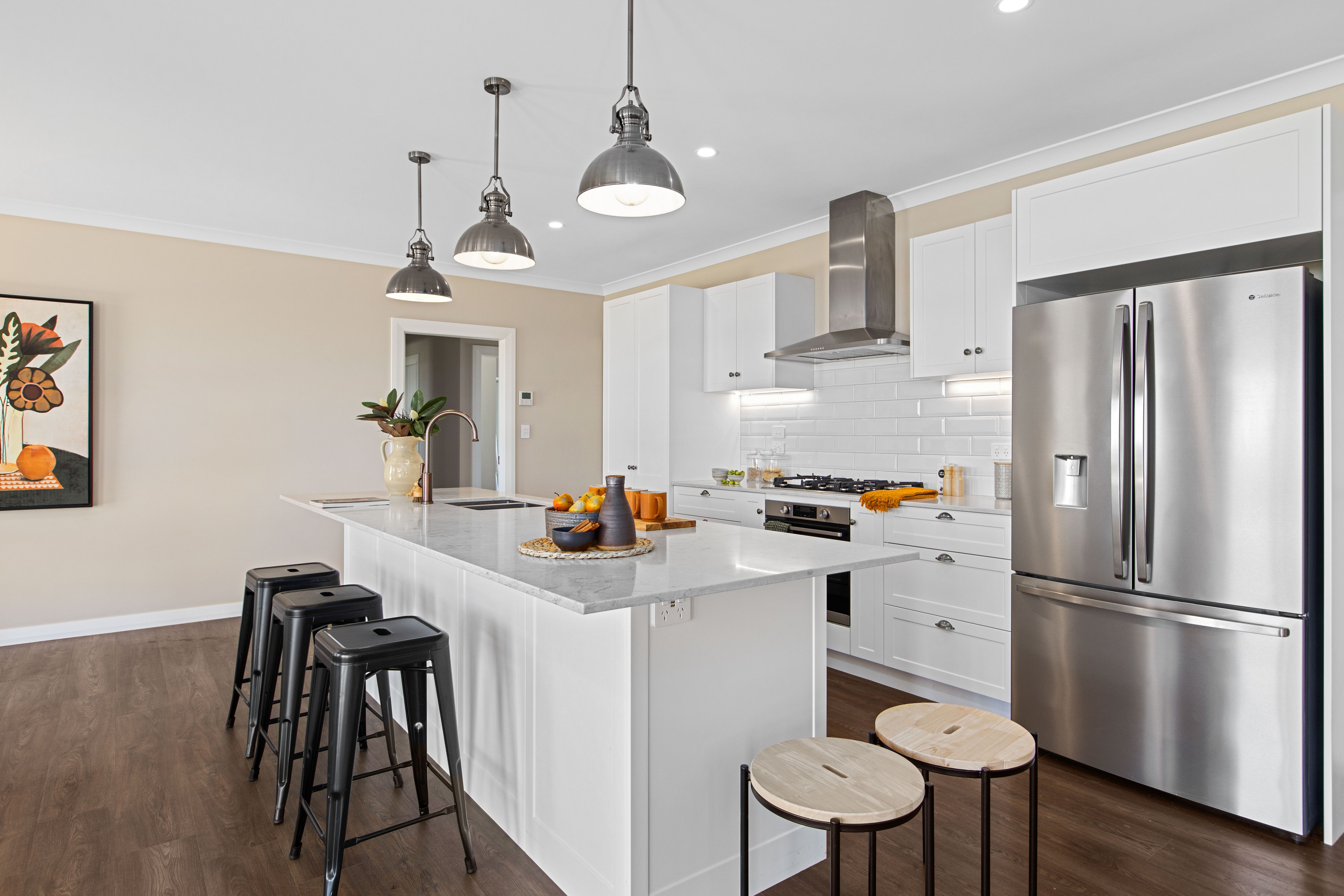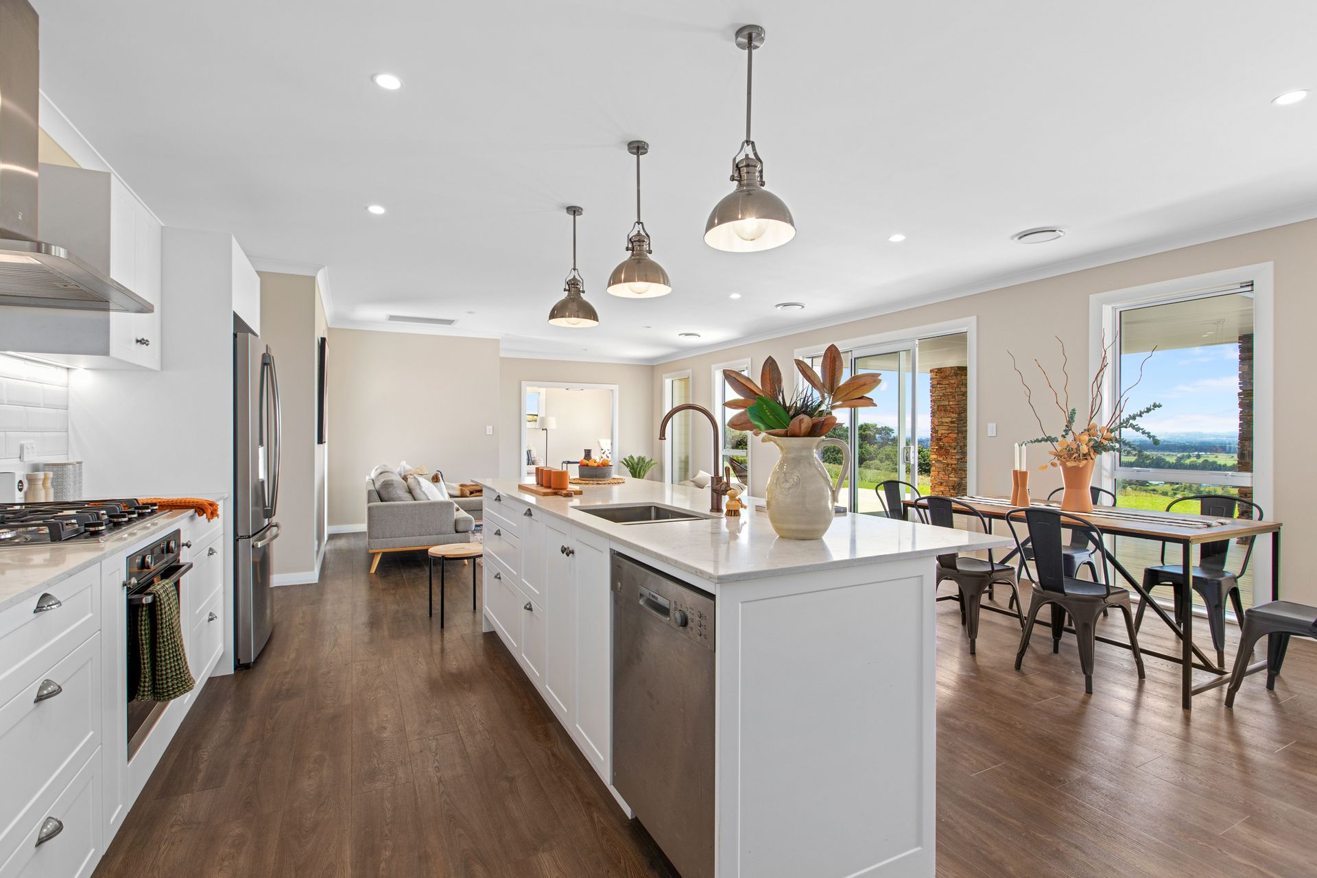 Central, well- appointed kitchen with quality Ceasarstone bench tops, shining white subway tile splash back, double door stainless fridge a chattel, gas hob cooking and scullery a dream for the keen cook. Integrated with dining to enjoy the total social and family interaction.