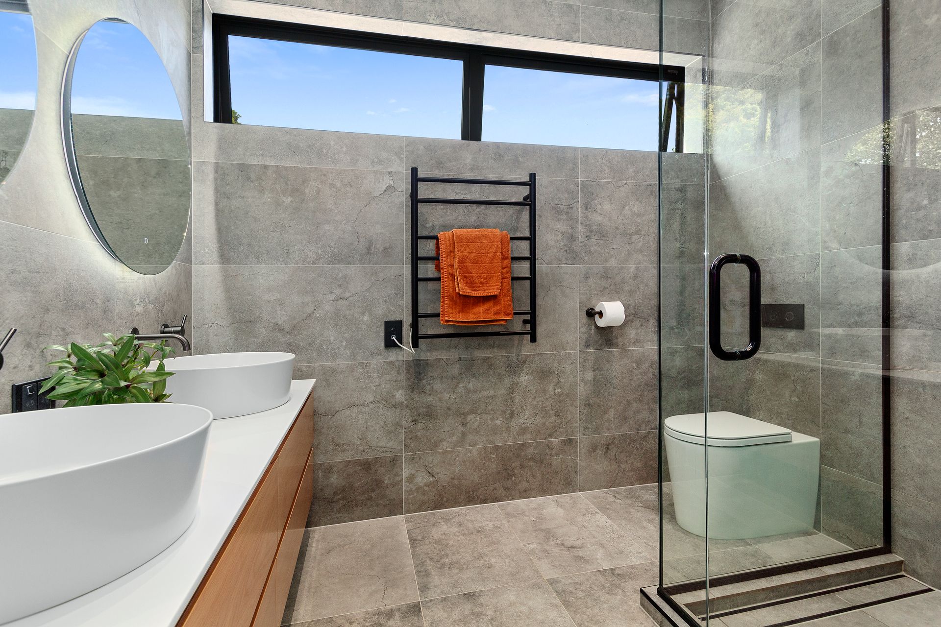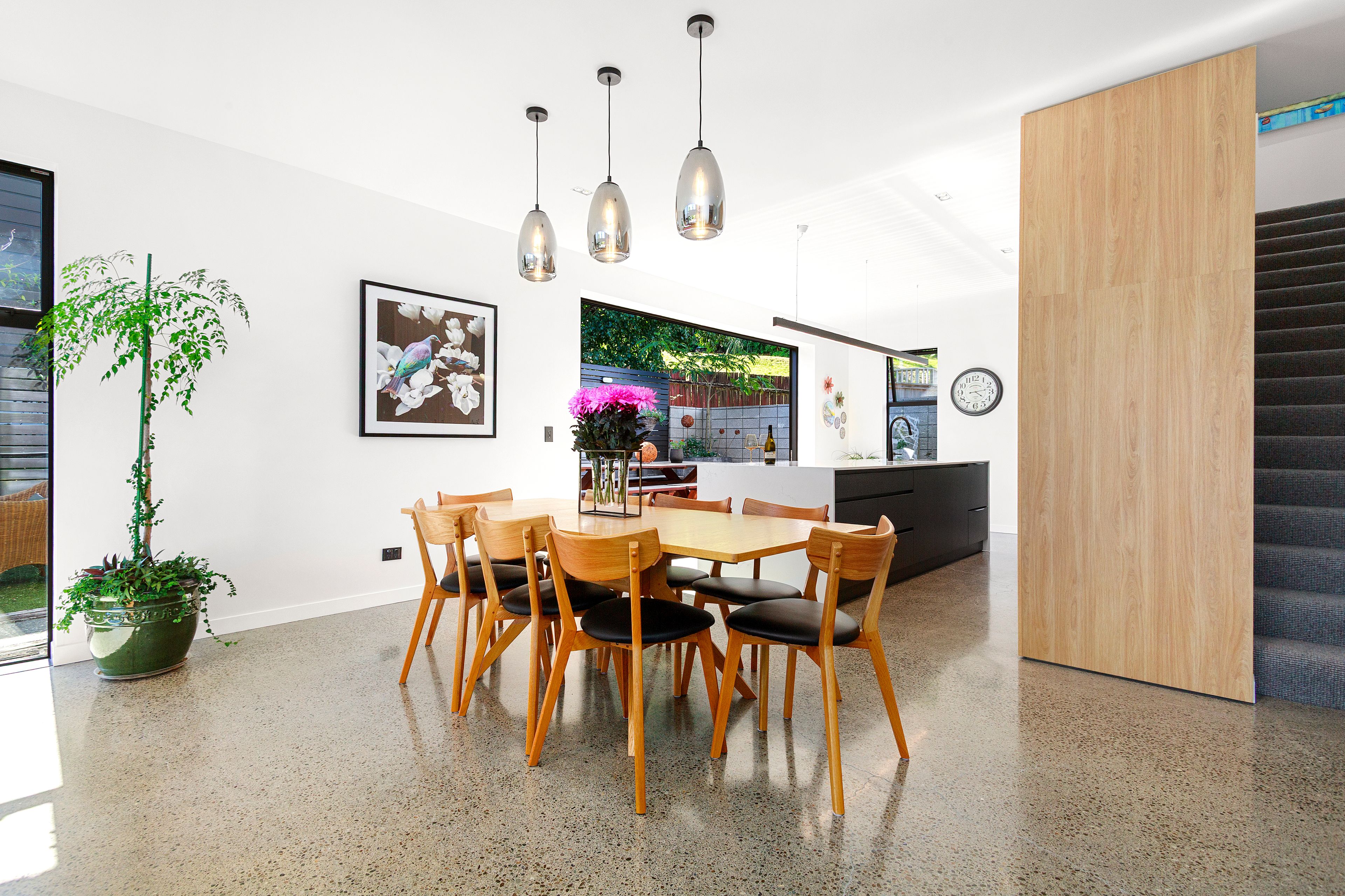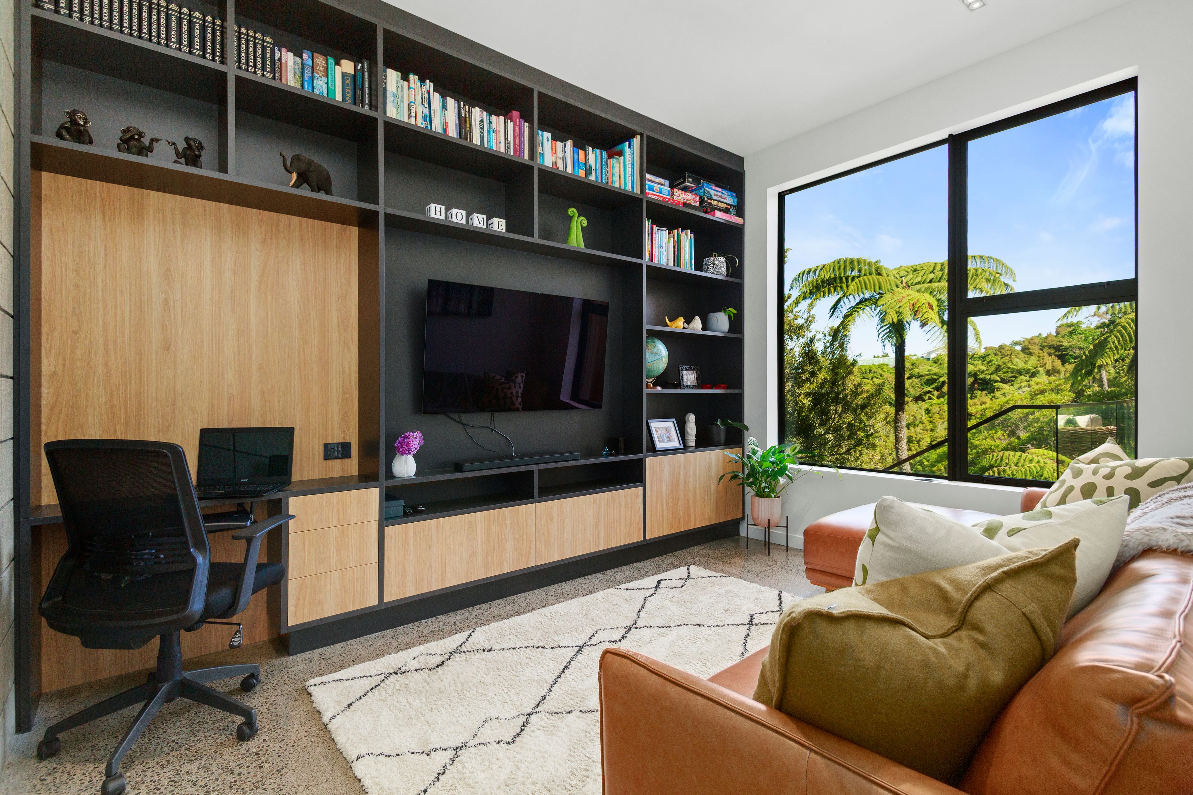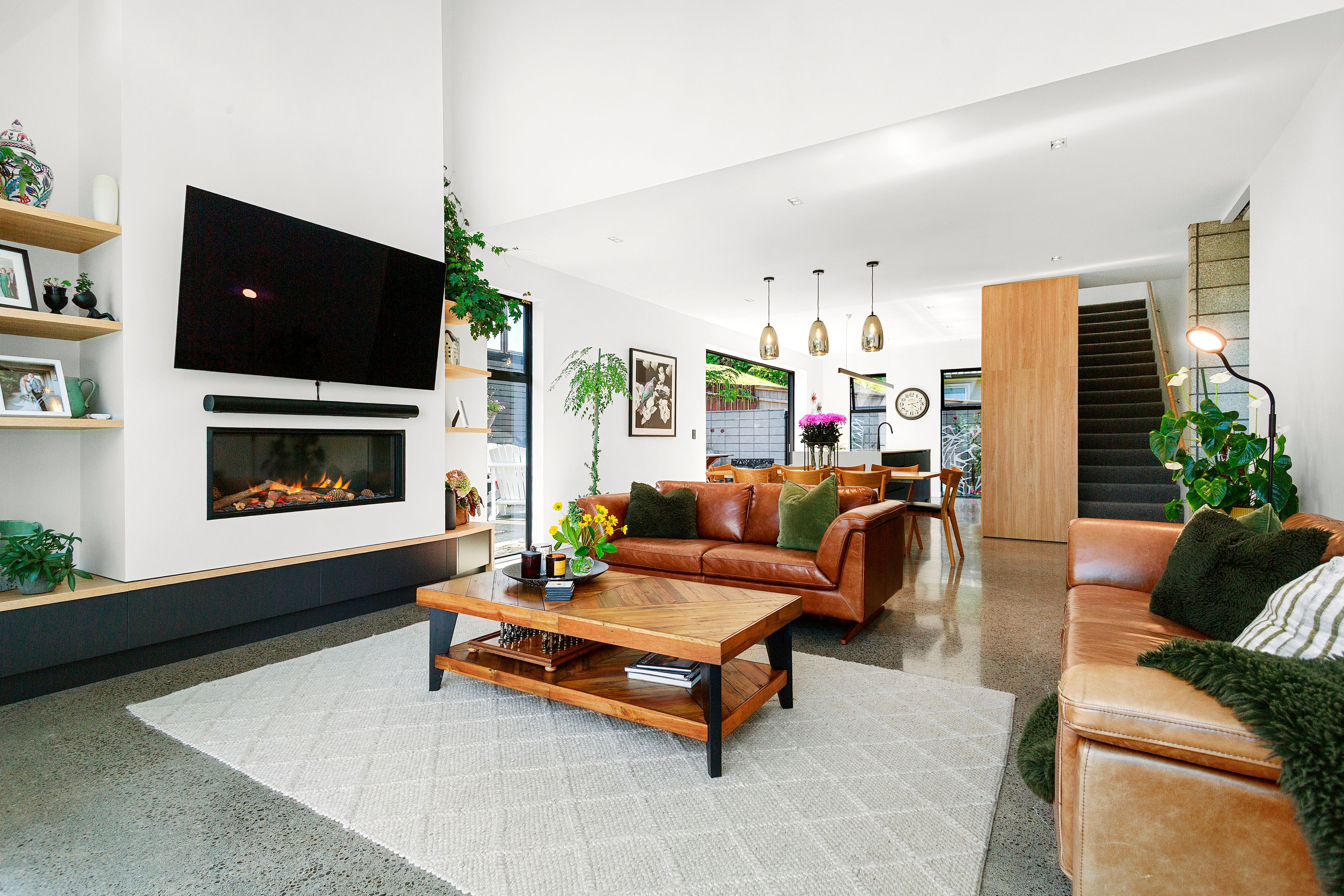 Constructed from solid concrete block and wrapped in rich cedar cladding, the home blends strength with warmth in a way few properties achieve. Polished concrete floors ground the interiors with a contemporary edge, while the impressive 2.7m stud height enhances light, volume, and architectural drama. Expansive, strategically positioned glazing captures the surrounding greenery from every angle, turning the landscape into a living backdrop. Double glazing and underfloor heating ensure effortless comfort all year round.