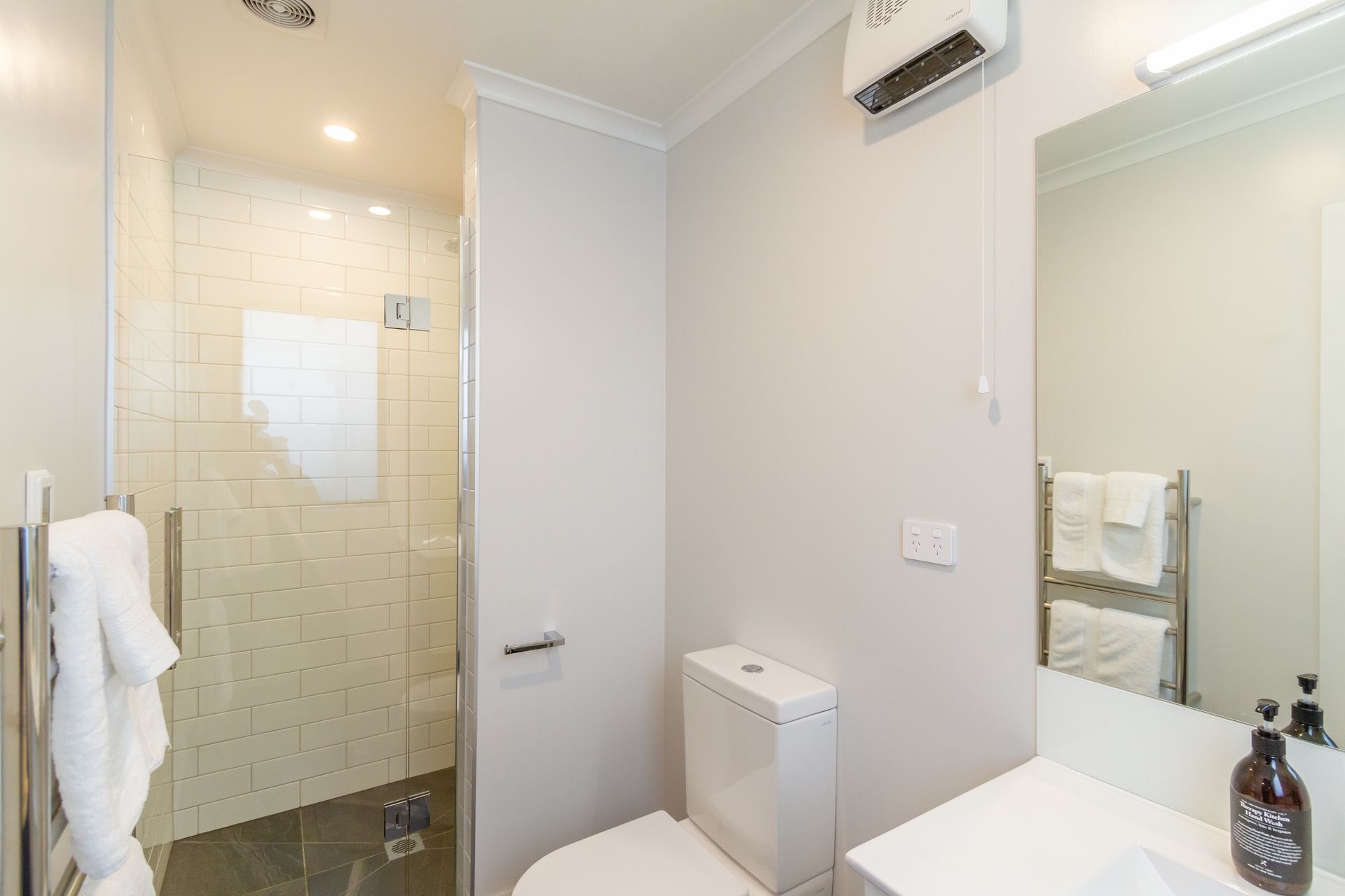 Master bathroom finished with Link White tiles, Kohler vanity, rain showerhead, heated towel rails and Indus Back-to-Wall bath.