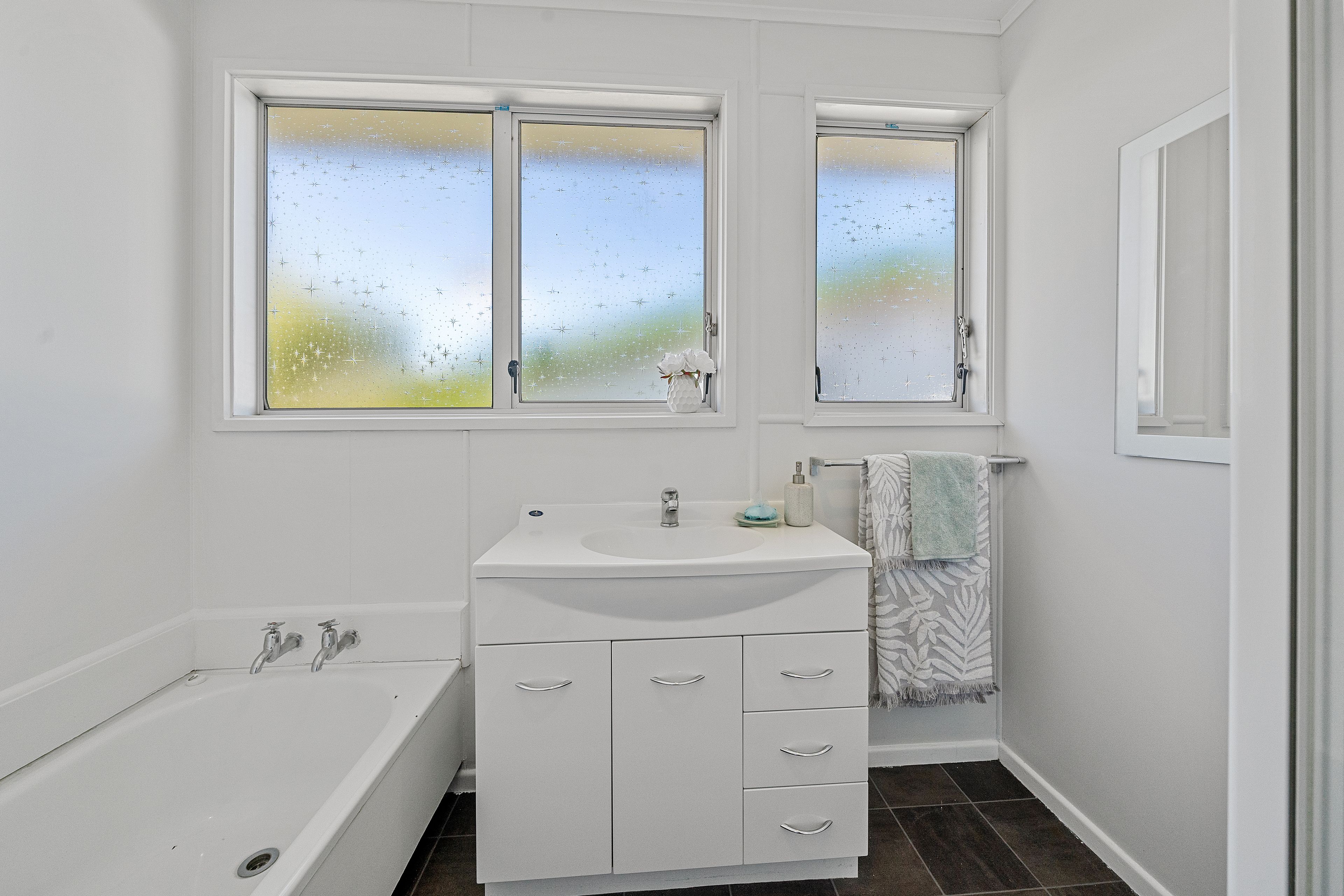 3 generous bedrooms are serviced by a sleek bathroom with bath, separate shower and vanity with a separate toilet for convenience and a designated laundry space.