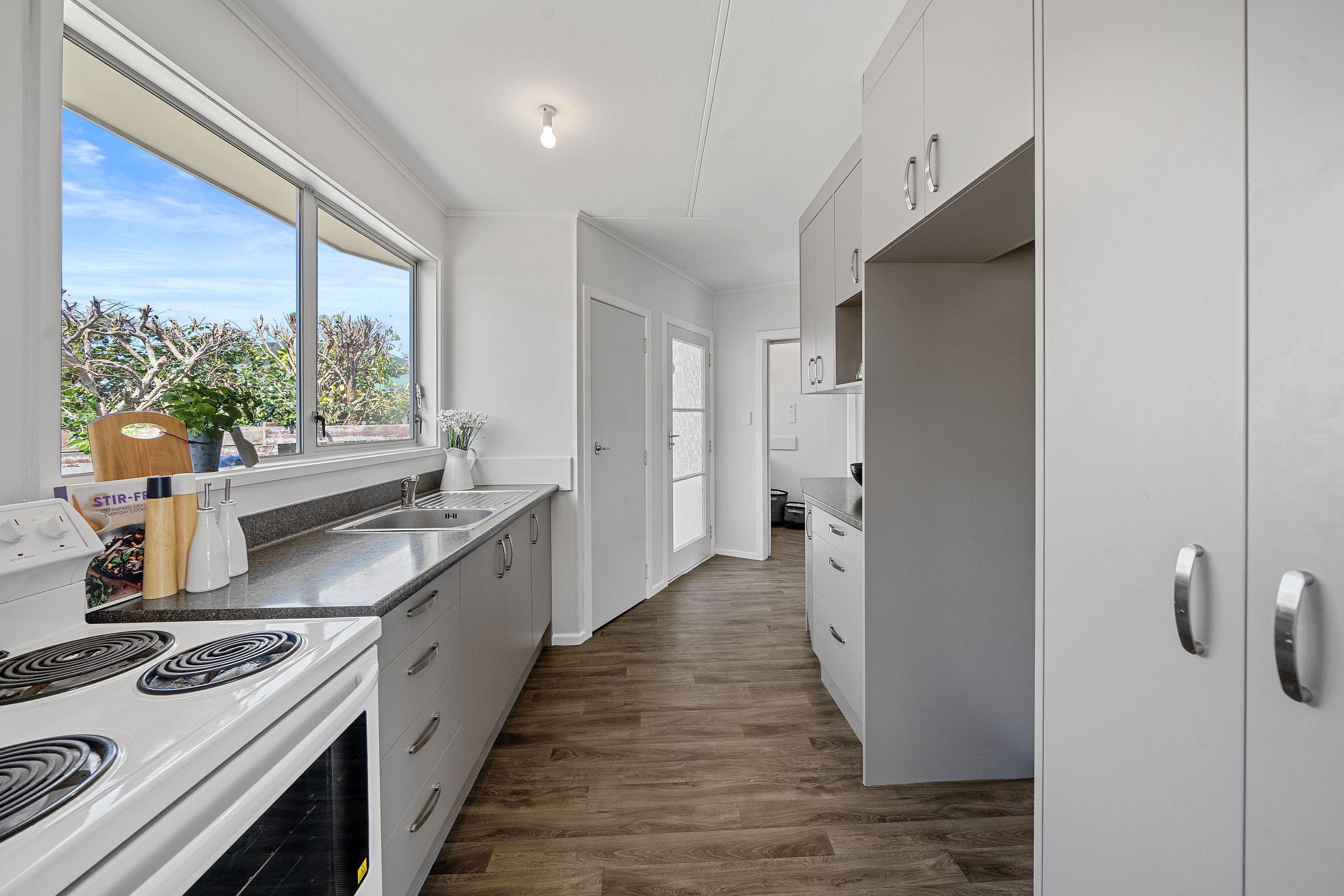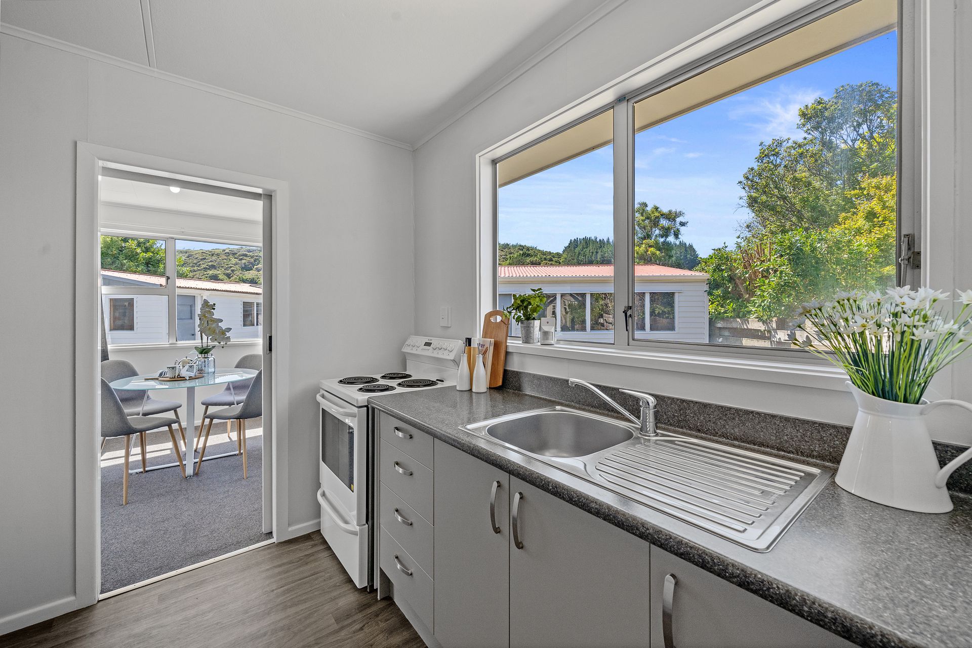 Making the most of the space, the kitchen boasts plenty of cabinetry with an open plan dining space that extends to a sizable living area and out to a front deck via a large ranch slider. Set up the outdoor table and chairs and slide open the door to enjoy an afternoon beverage or alfresco dinner.