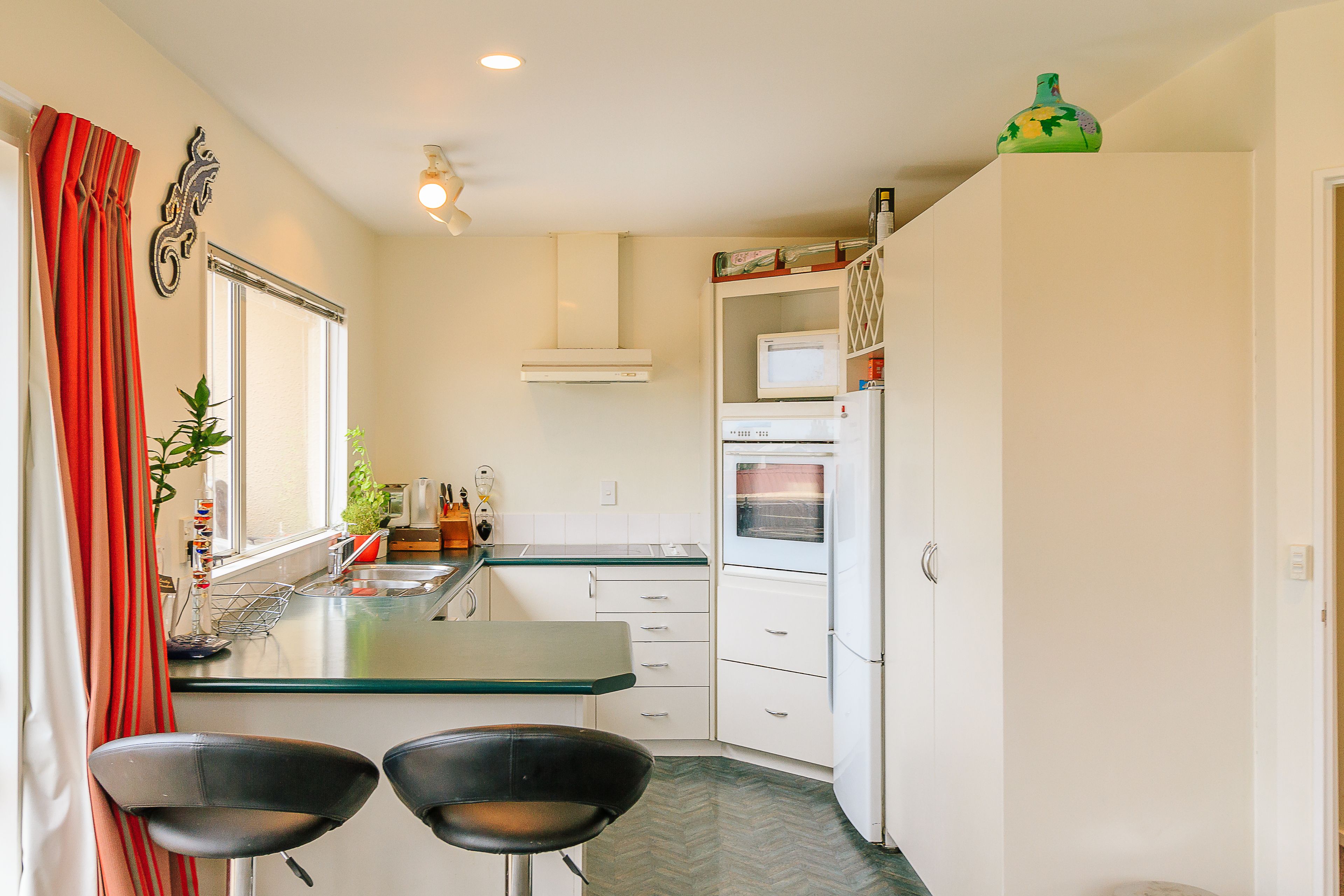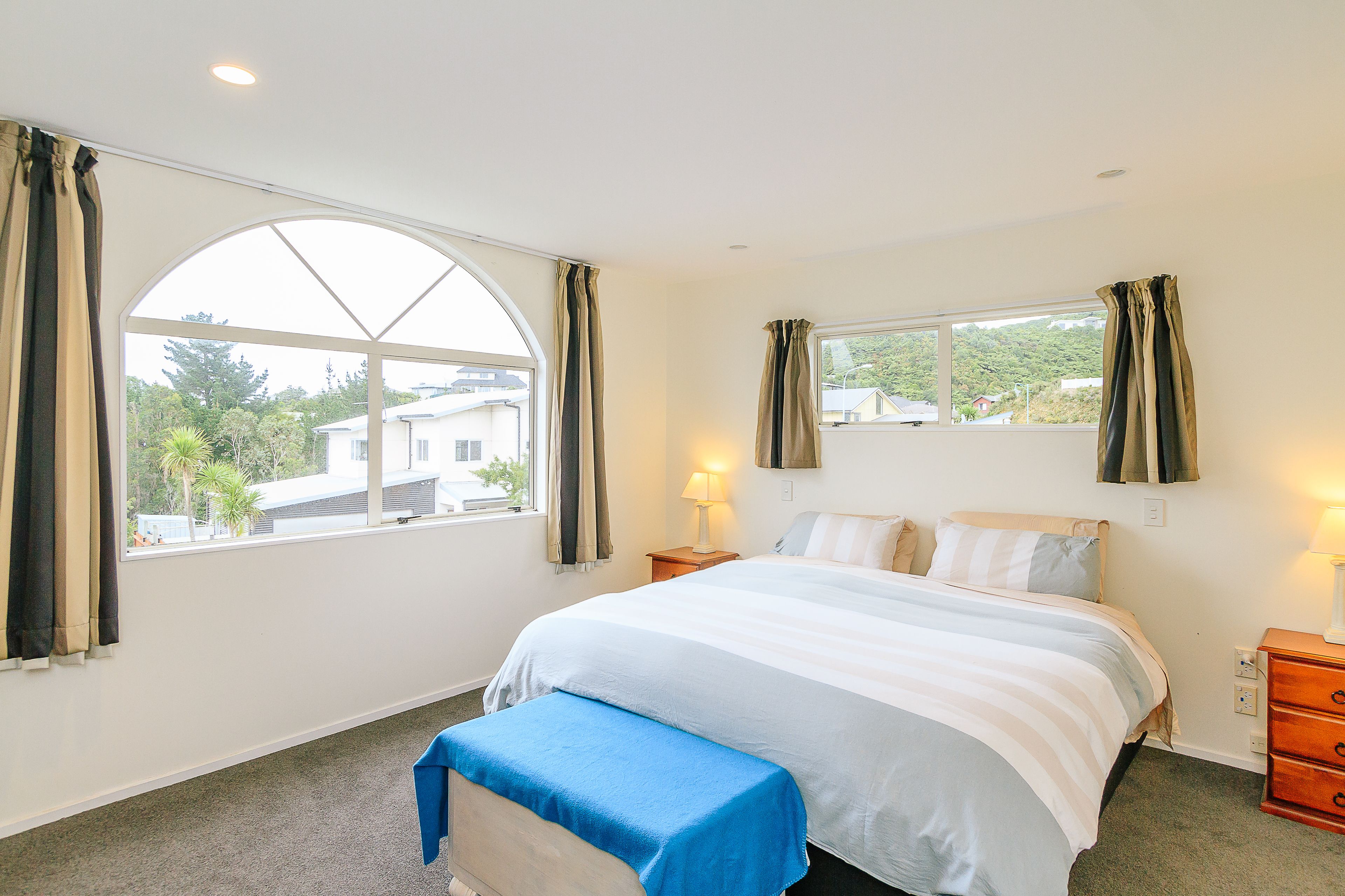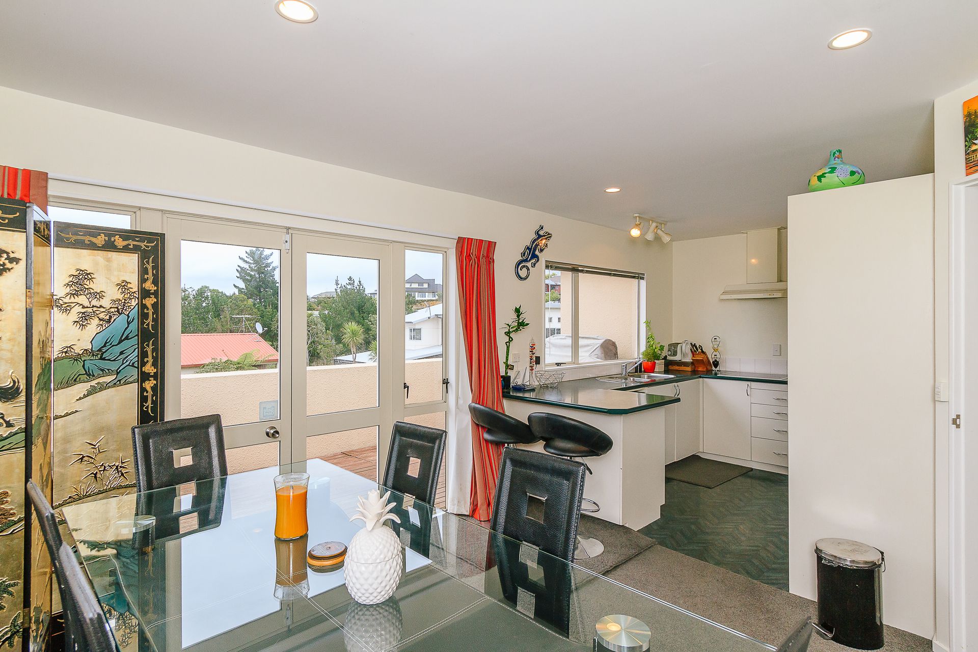 There is an open plan kitchen, with huge windows filling the room with natural sunlight, which flows into the dining room - through to the living room, with multiple French doors opening up to the fully fenced, landscaped garden which has been terraced to enjoy the stunning views, creating a wonderful indoor/outdoor entertaining area.