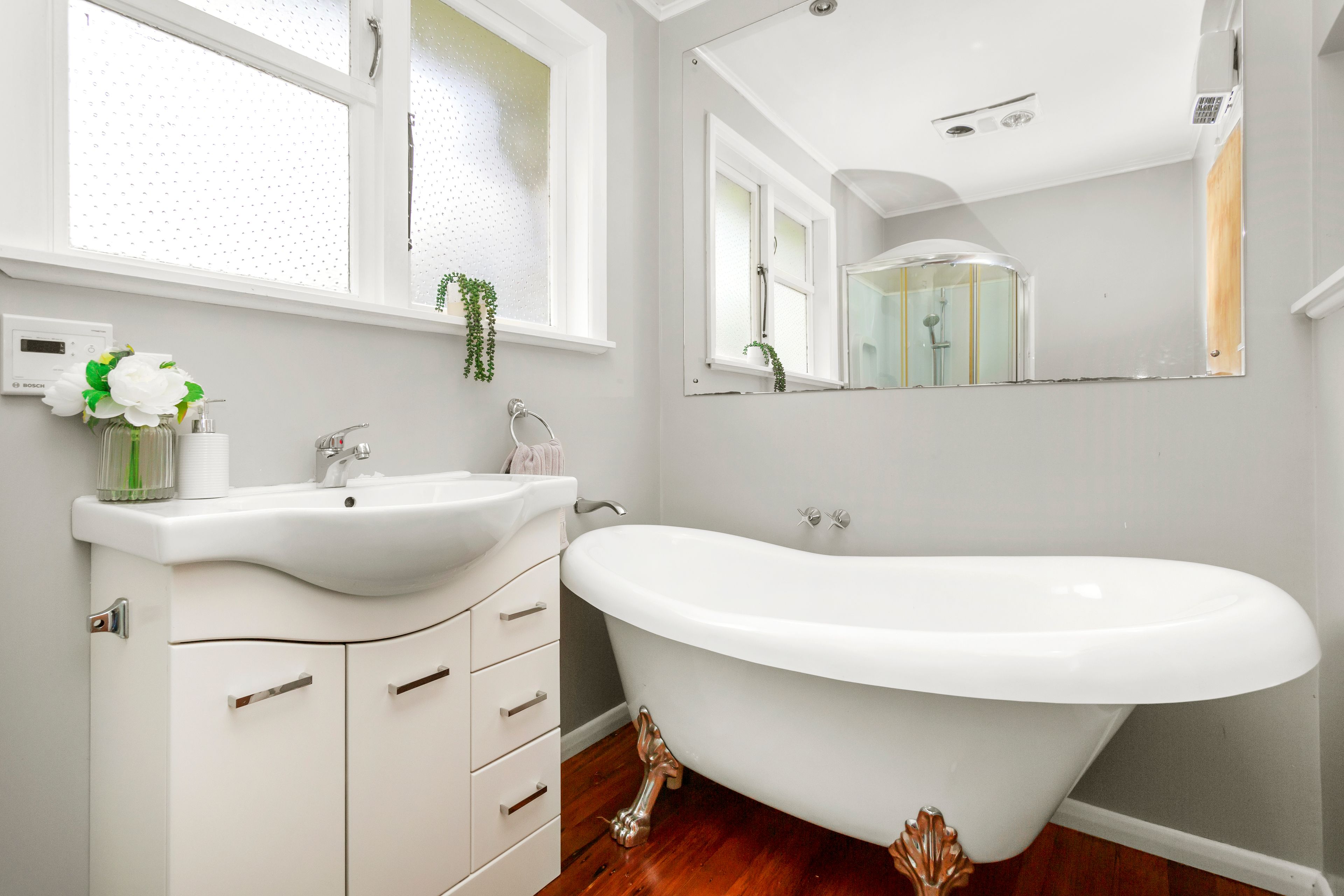 Three generously sized bedrooms offer plenty of space for family and guests. The functional bathroom features a charming claw foot bath, perfect for unwinding after a long day.