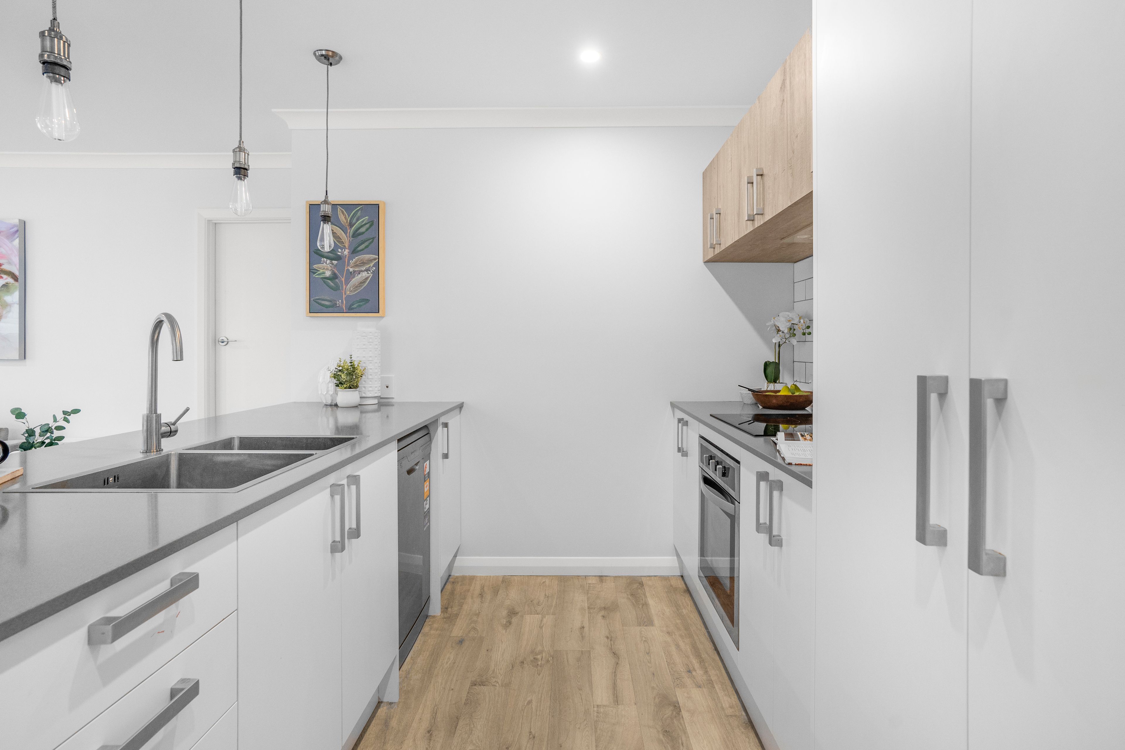Stylish open plan living, dining and meal preparation area perfect for entertaining. The kitchen features contrasting cabinetry with pendulum lighting over the central island with a double sink and includes an underbench oven, ceramic hob, concealed extractor, tiled splash back and dishwasher.