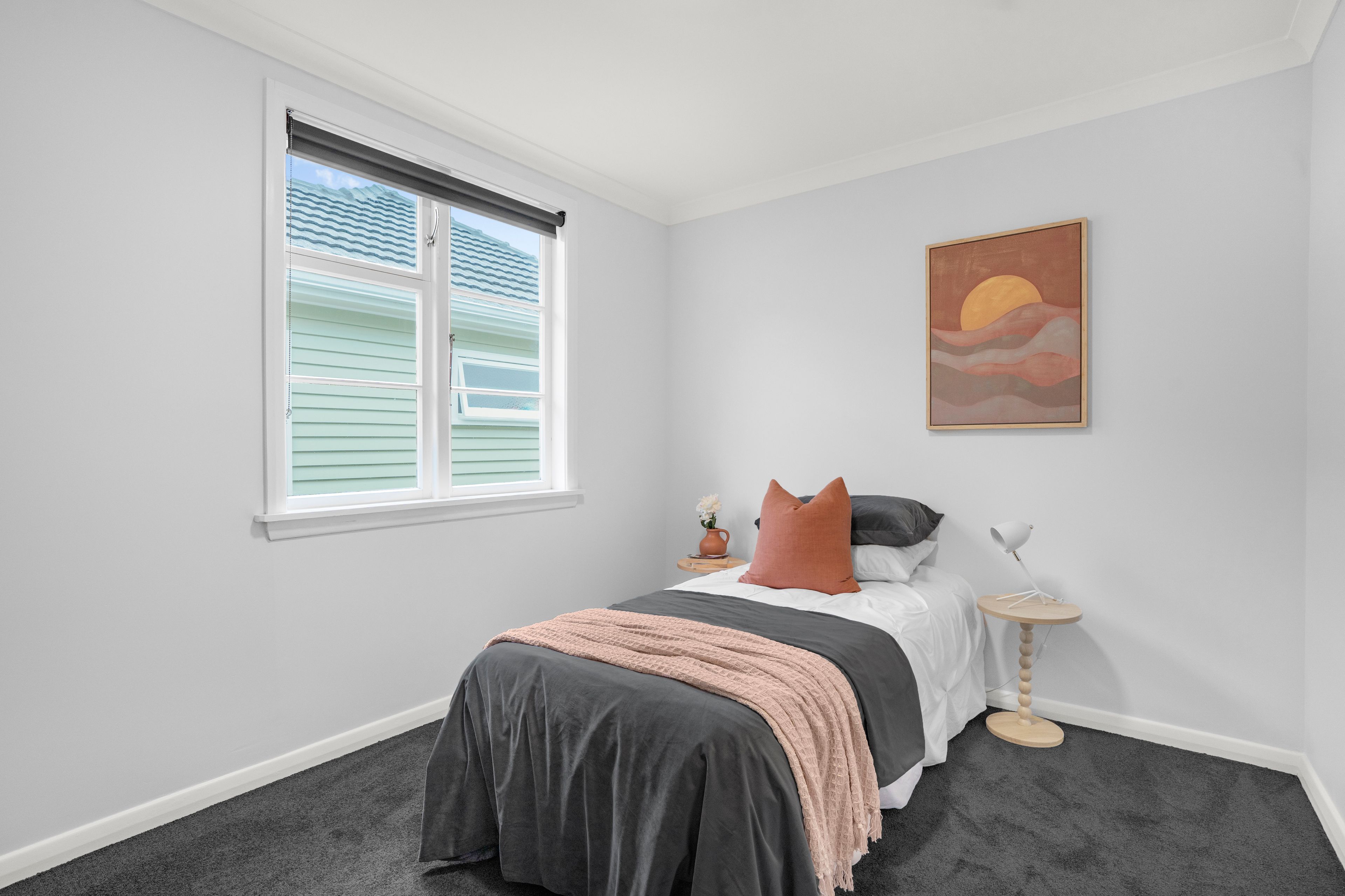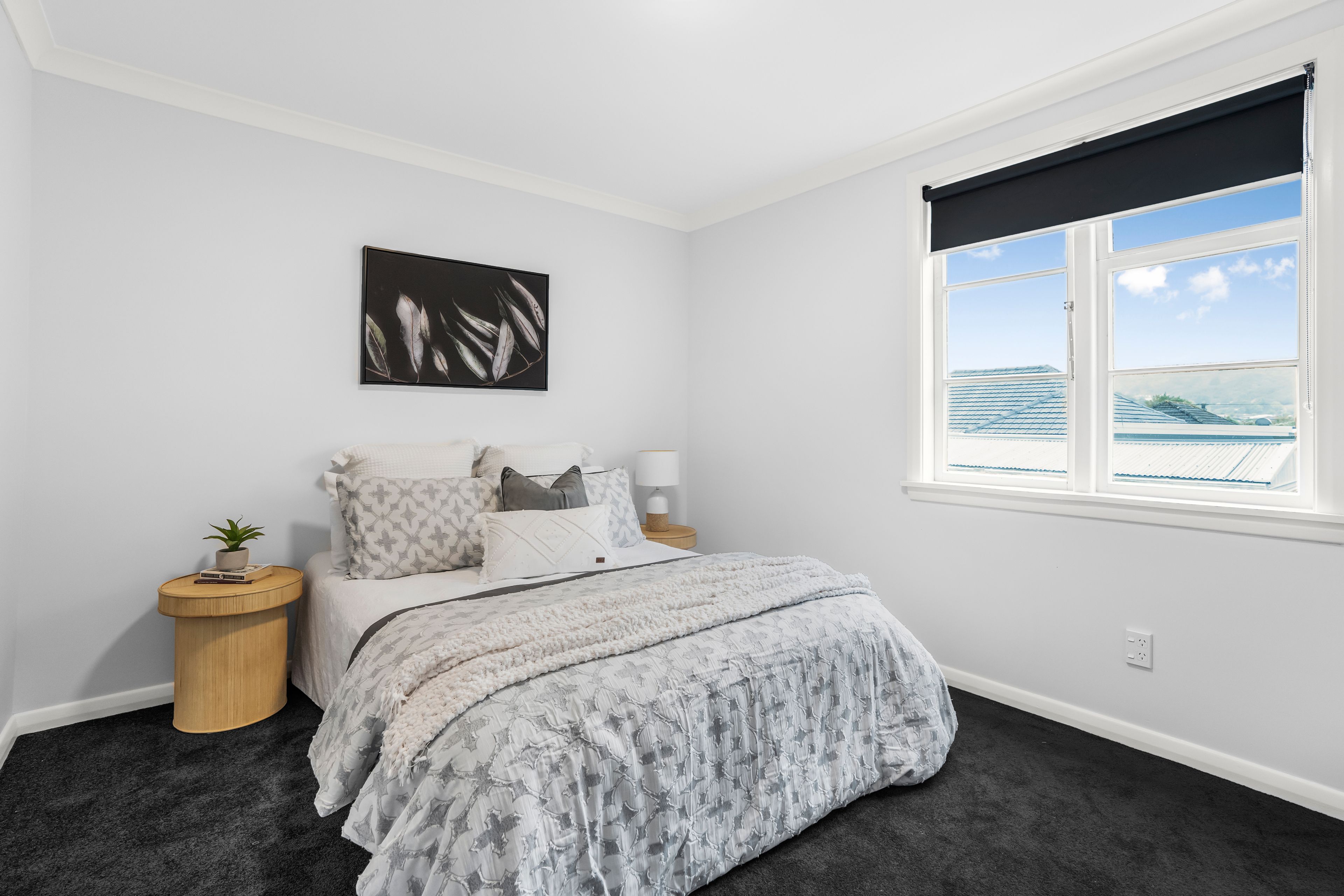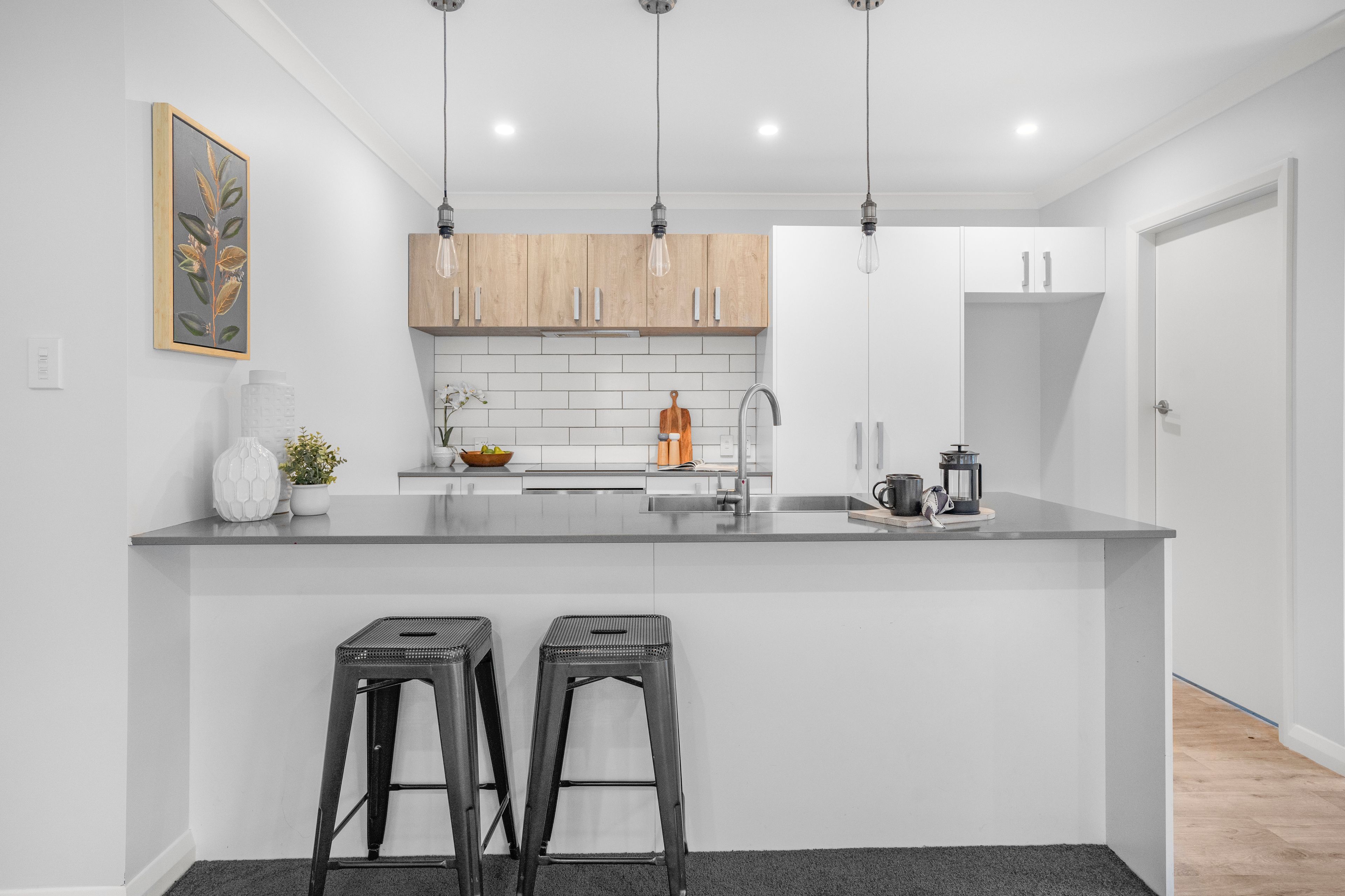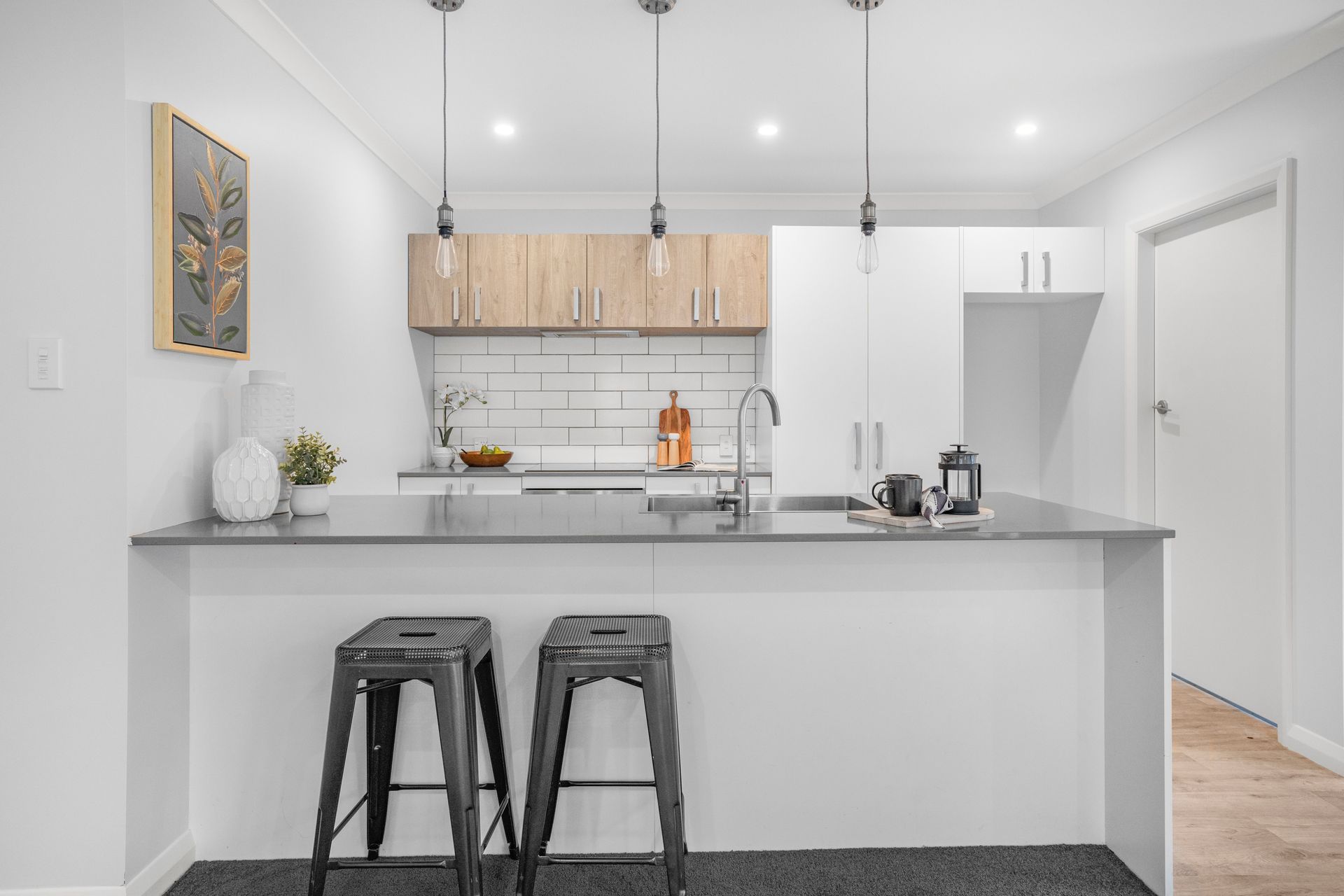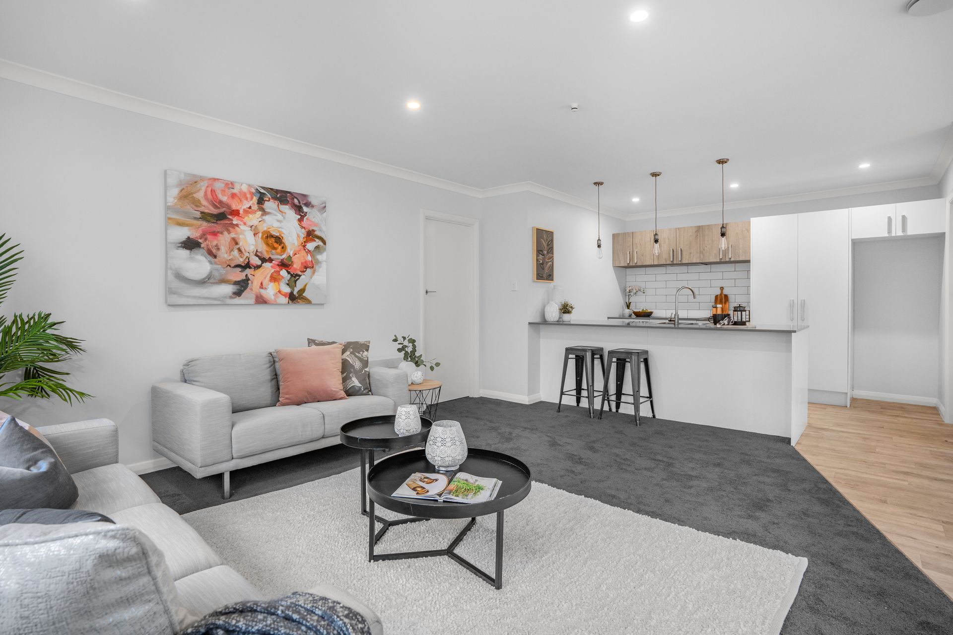 Neutral contemporary interior with light walls, plush carpet and timber-look flooring creating a welcoming atmosphere.