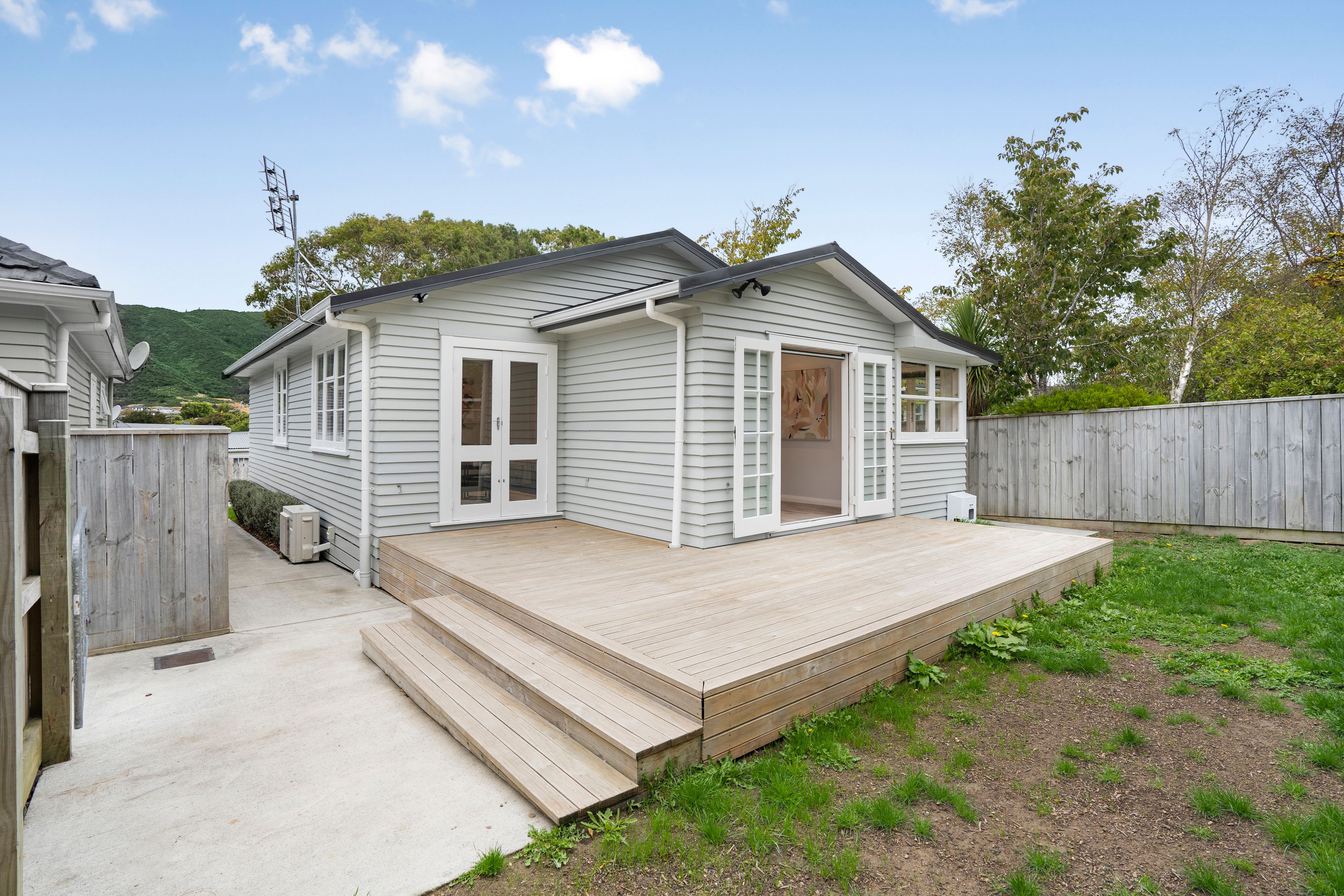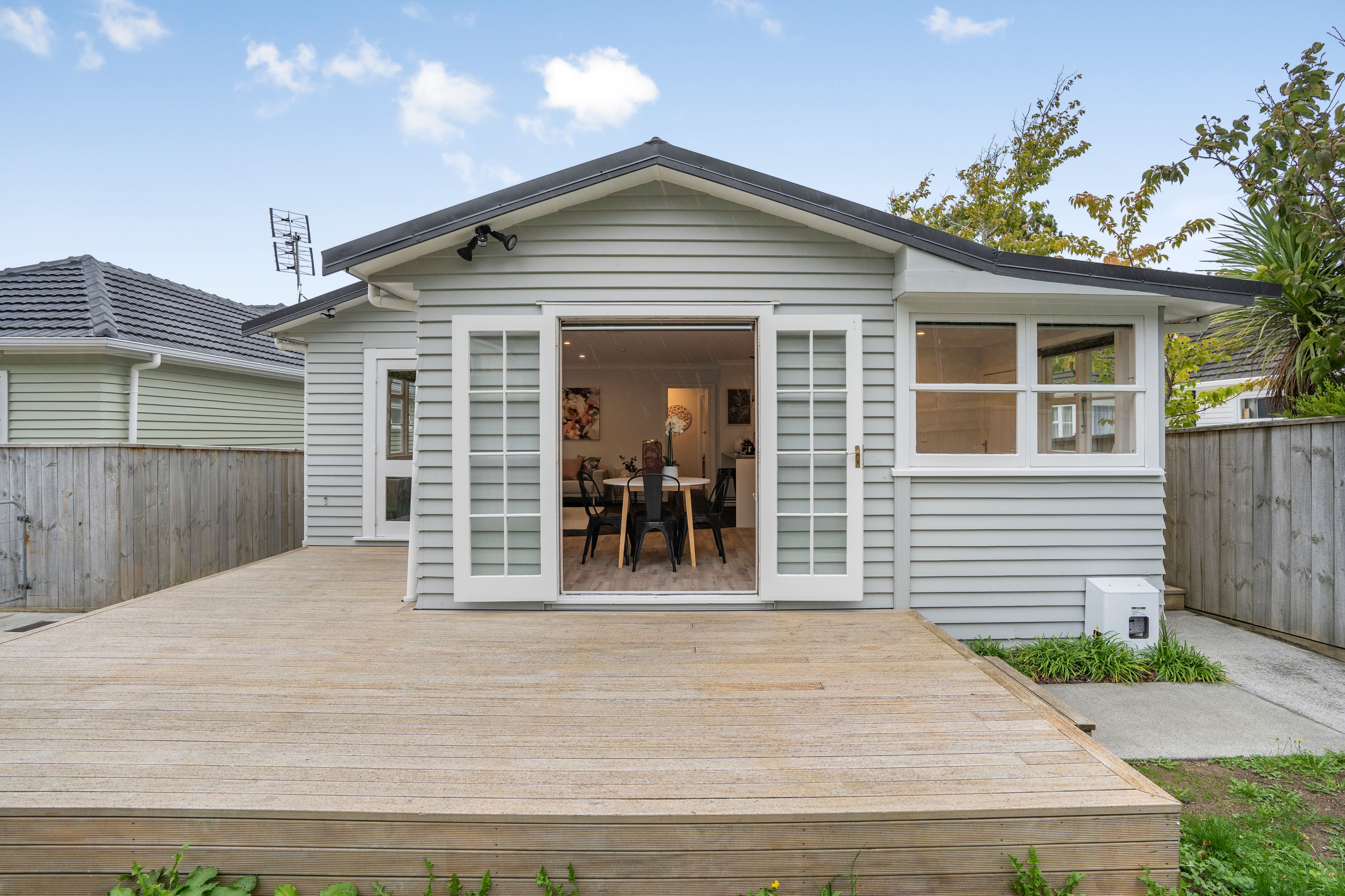 Off-Street parking to the fully fenced entry with borders of planting. Choose from side access or step up to the deck with 2 sets of French doors.