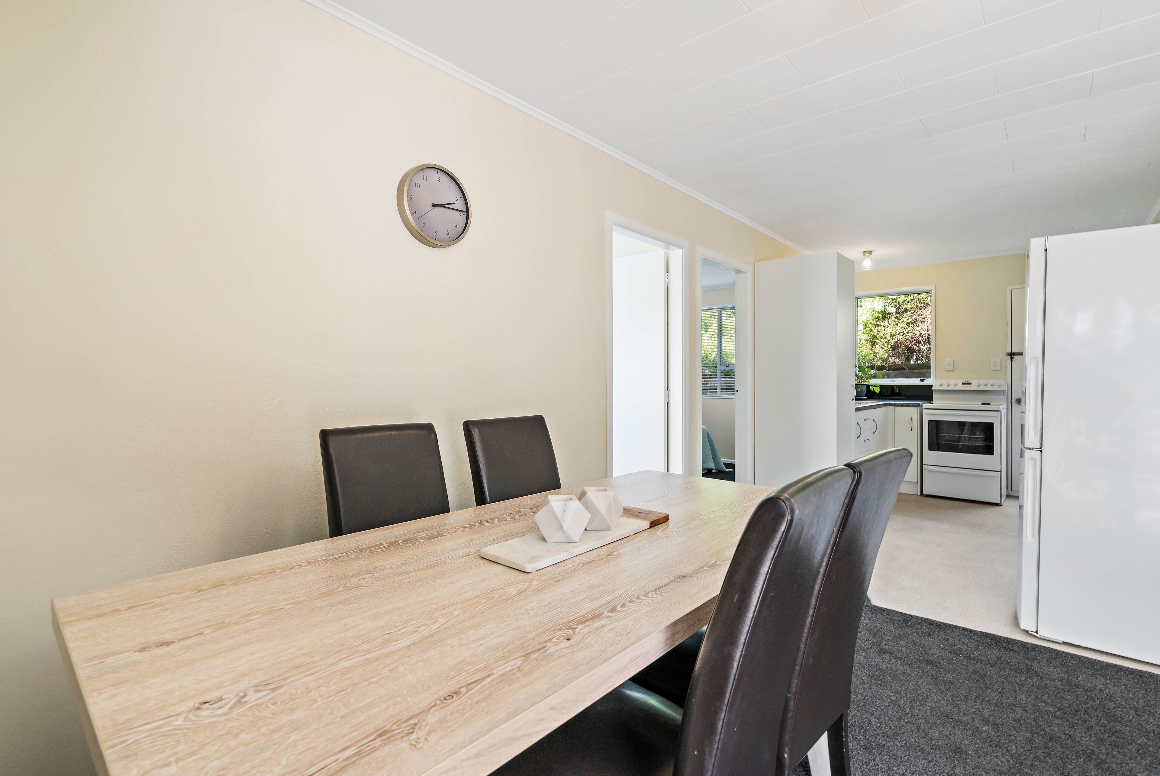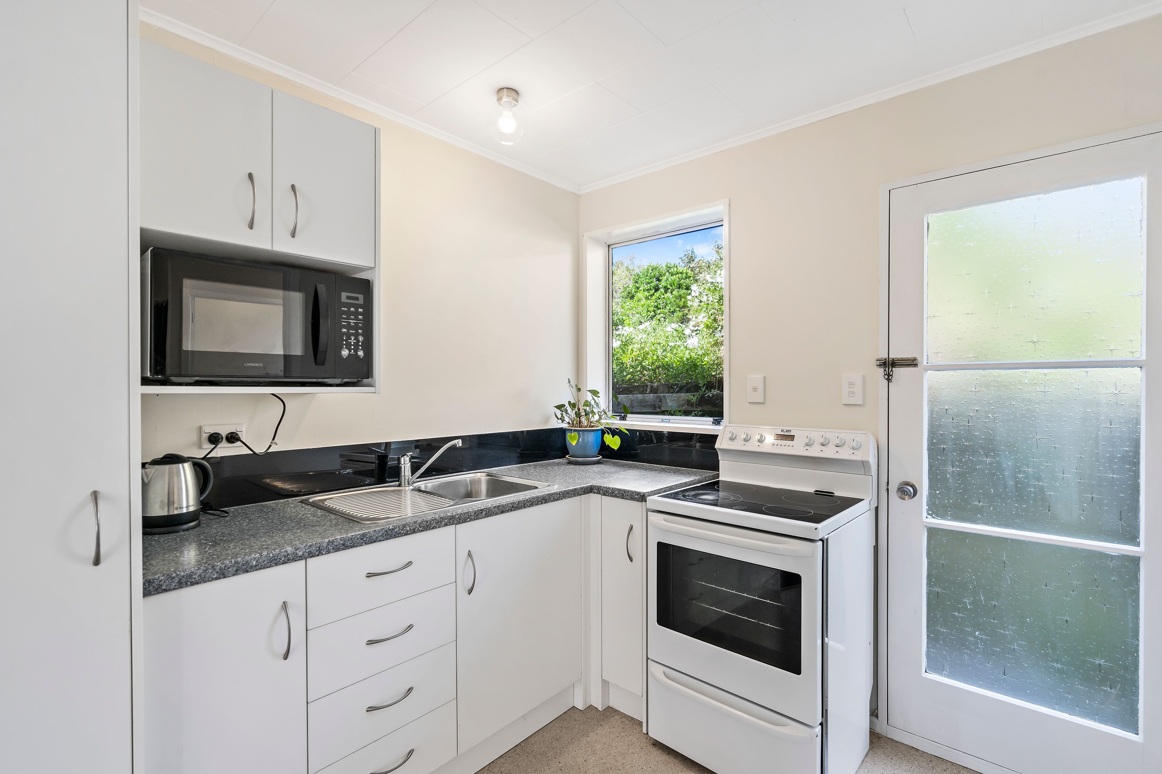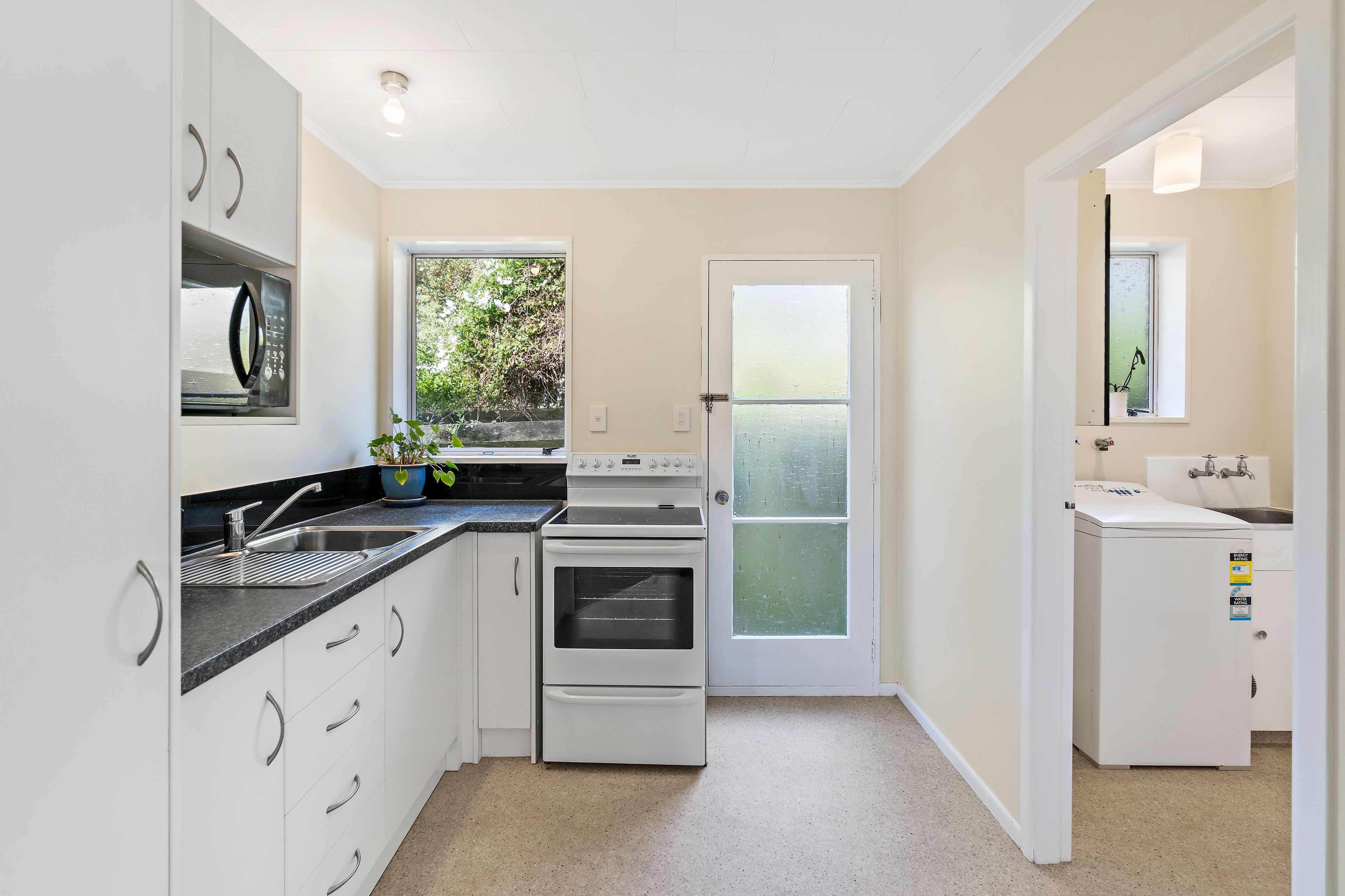 Visually connected, the kitchen includes a freestanding oven with ceramic hob, L-shaped bench, pantry and a door to the yard.
