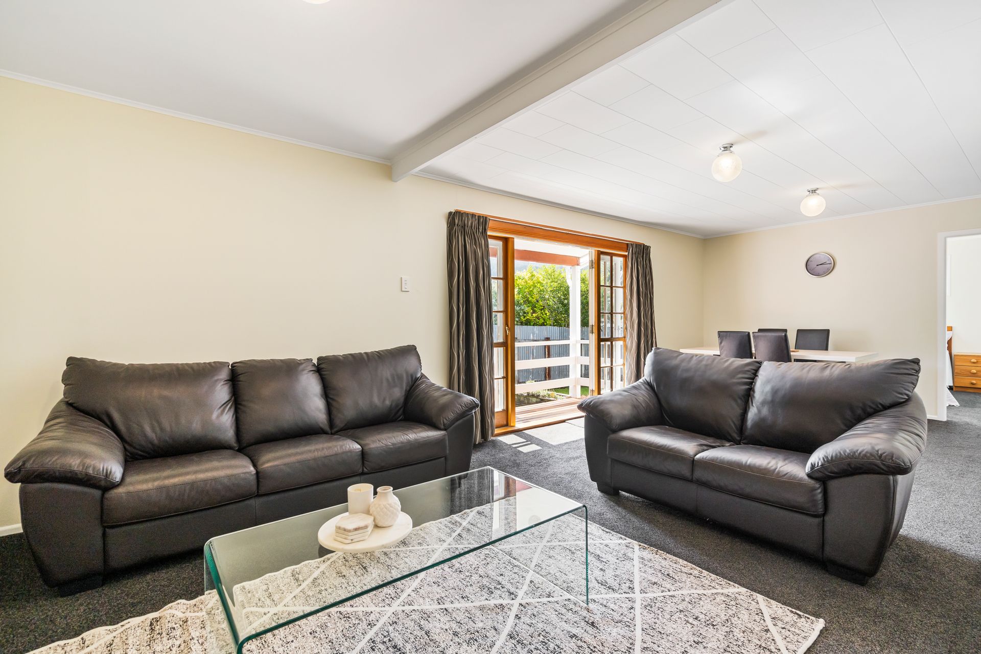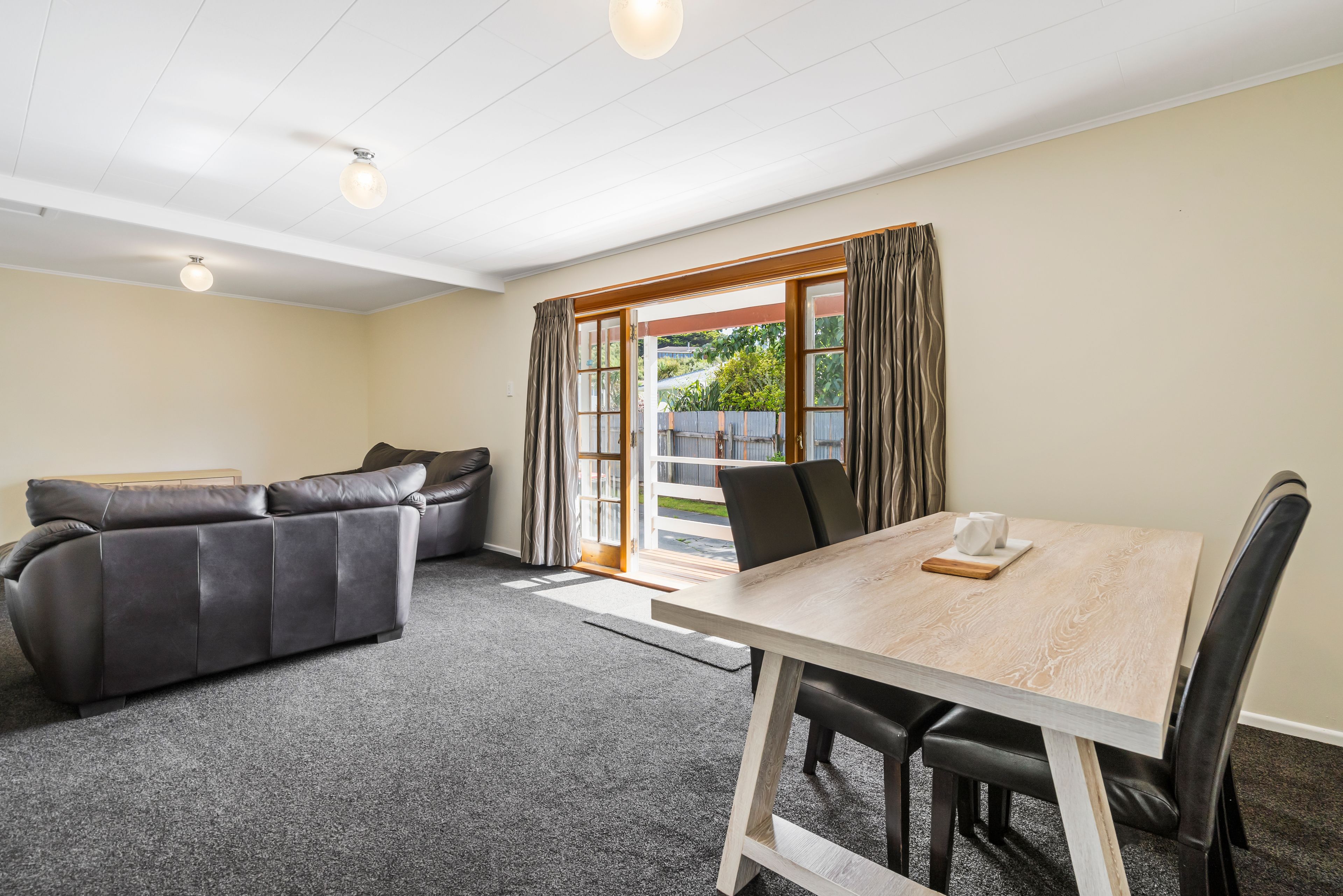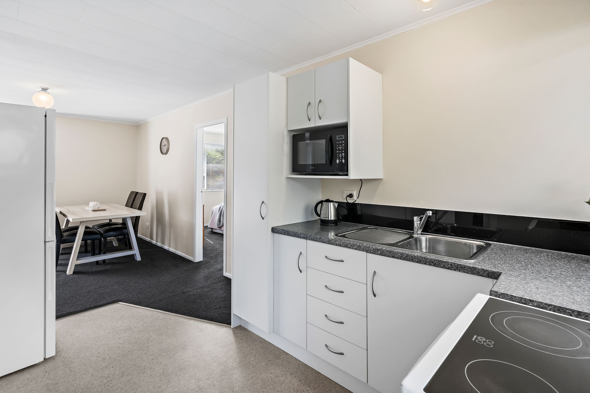 Visually connected, the kitchen includes a freestanding oven with ceramic hob, L-shaped bench, pantry and a door to the yard.