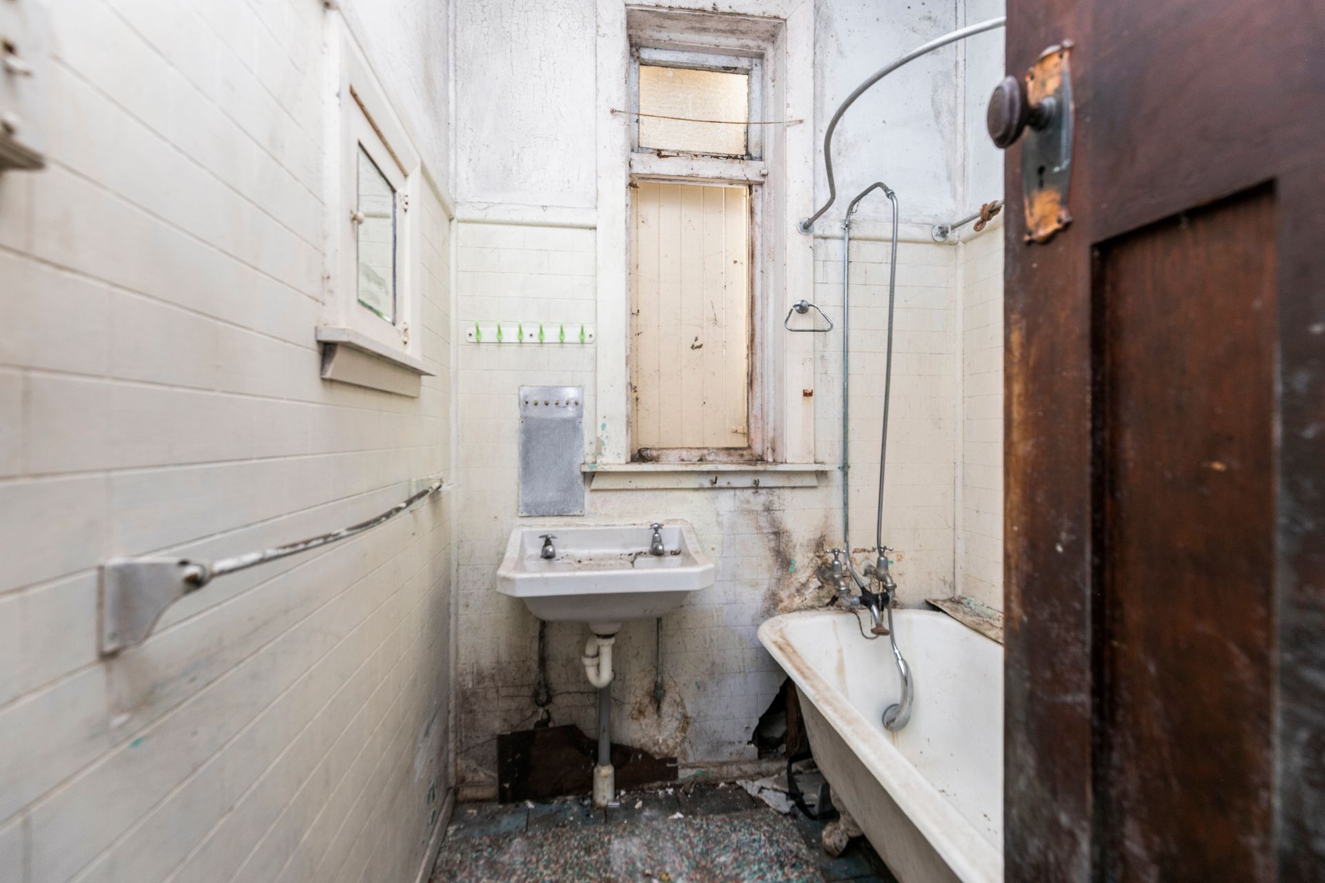 - Tiled bathroom, with claw foot roll top bath