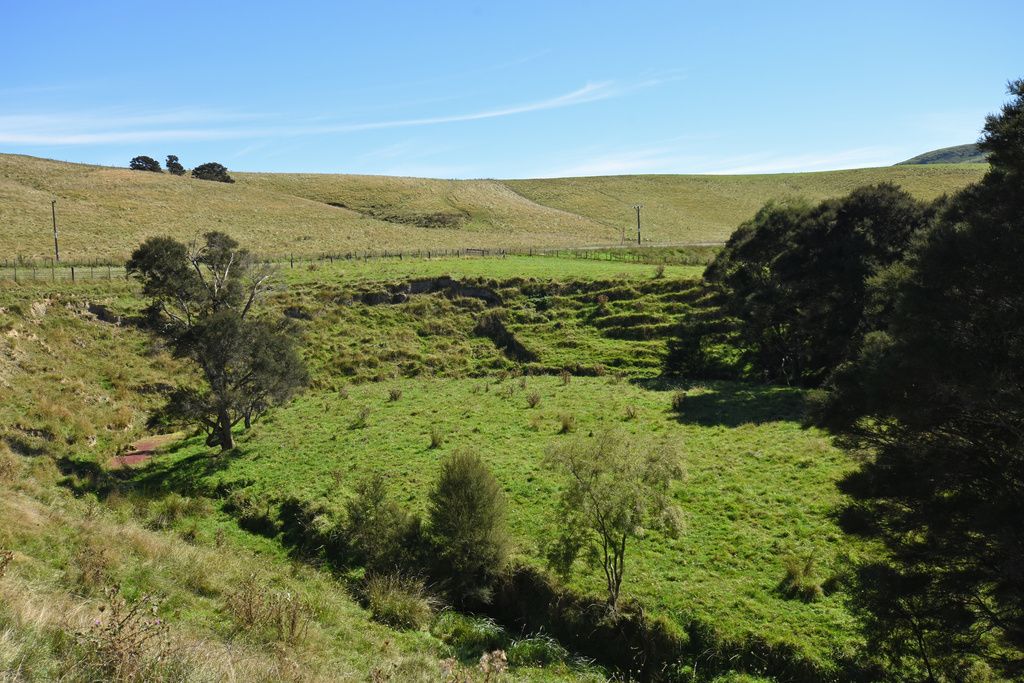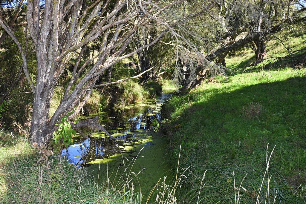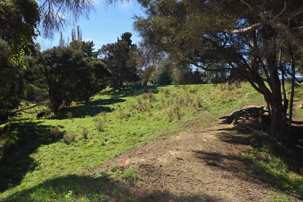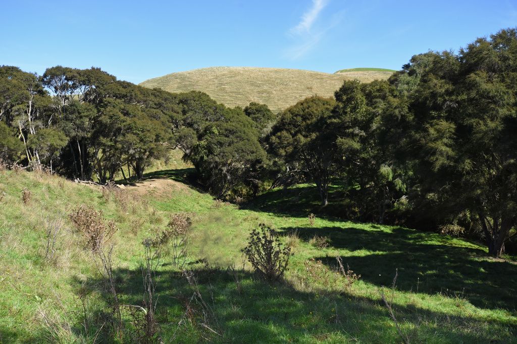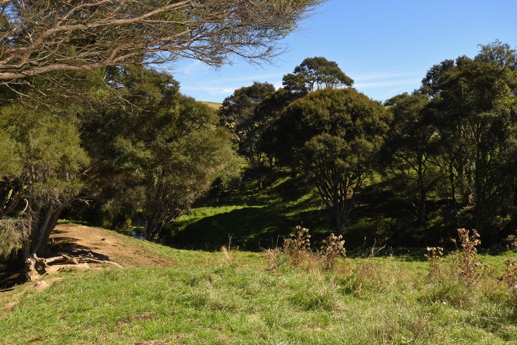 As you wander down the slope to the stream and through the Manuka trees, an opening appears and you are in your own natural amphitheatre. Further along bordering a paddock is a long row of mature gum tress which may provide firewood for you in the future.