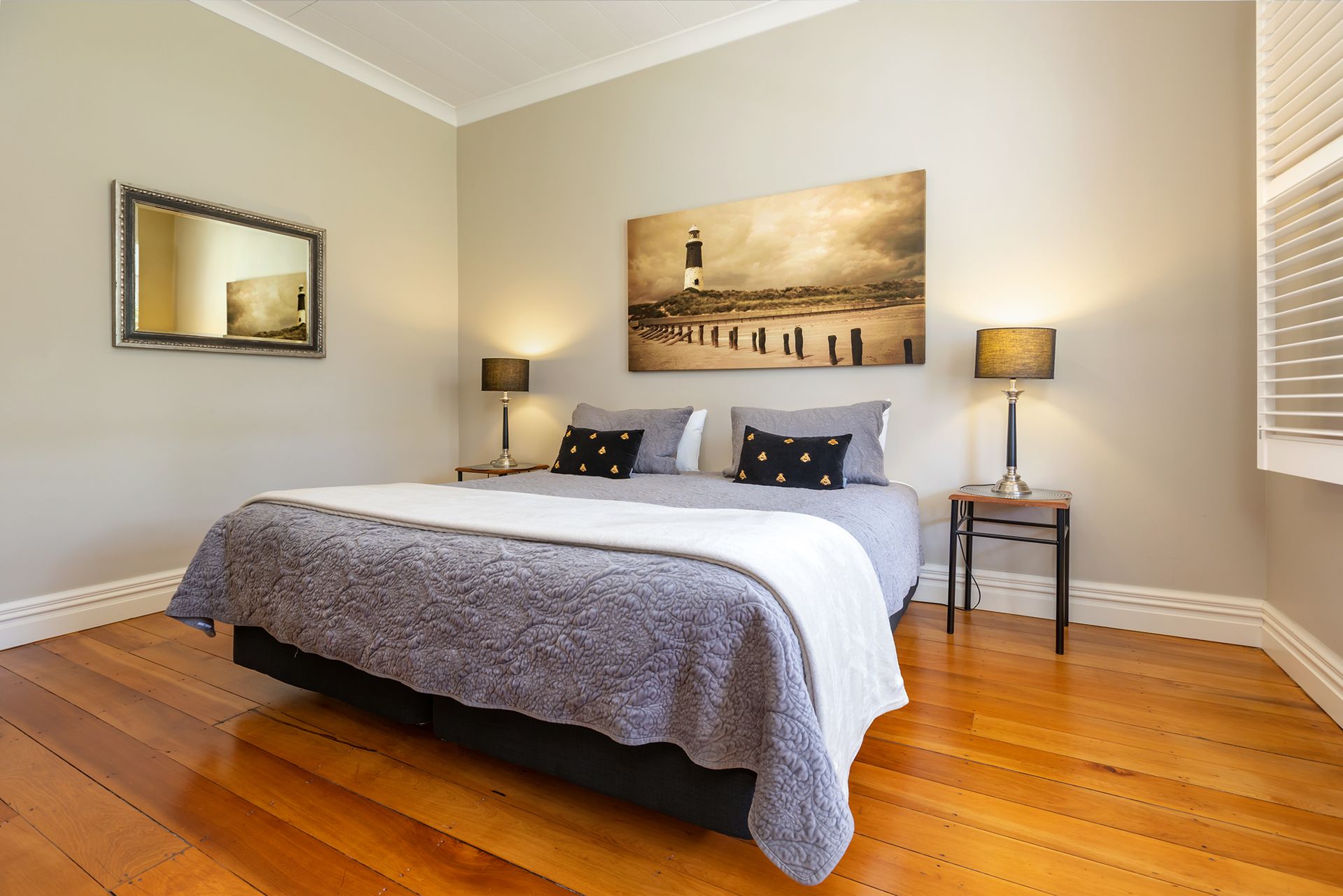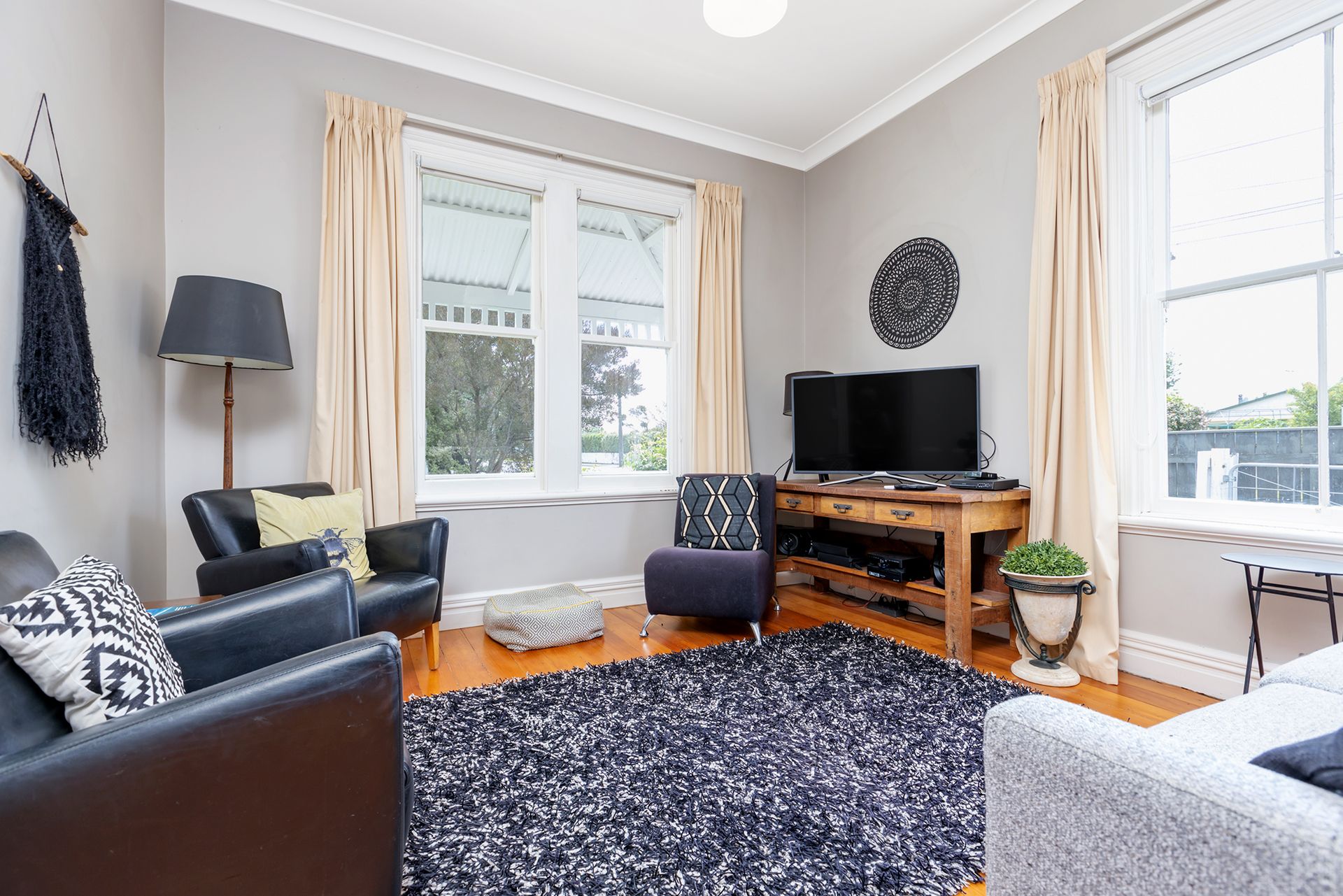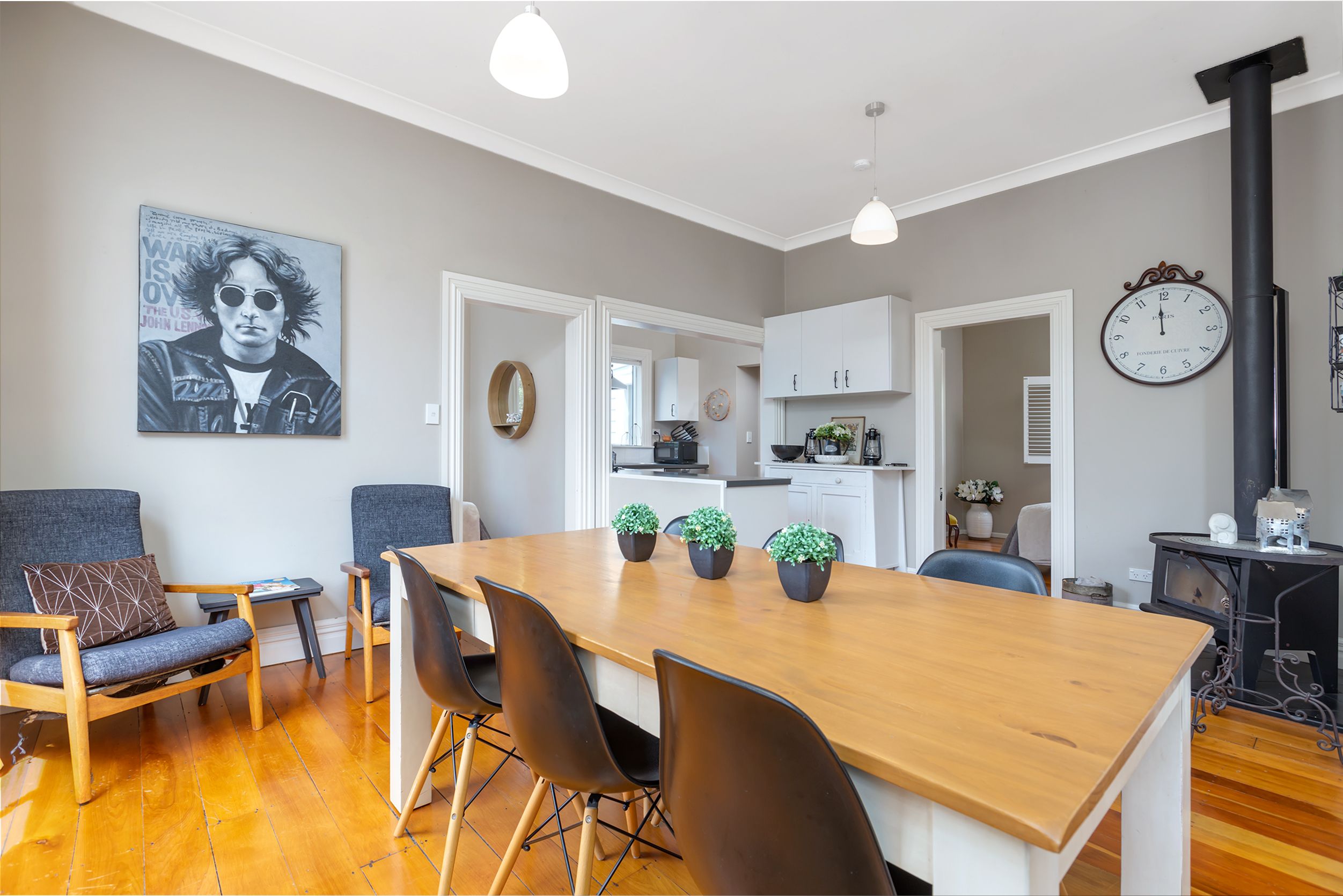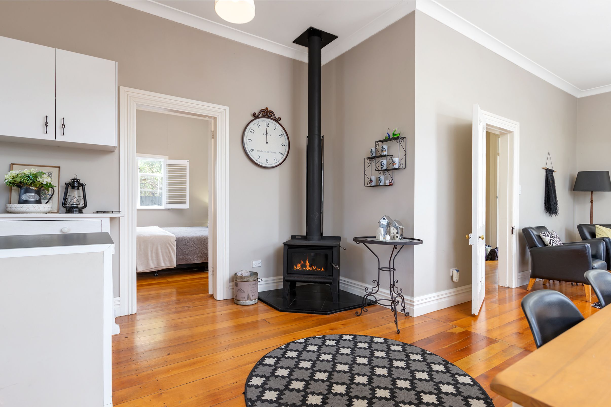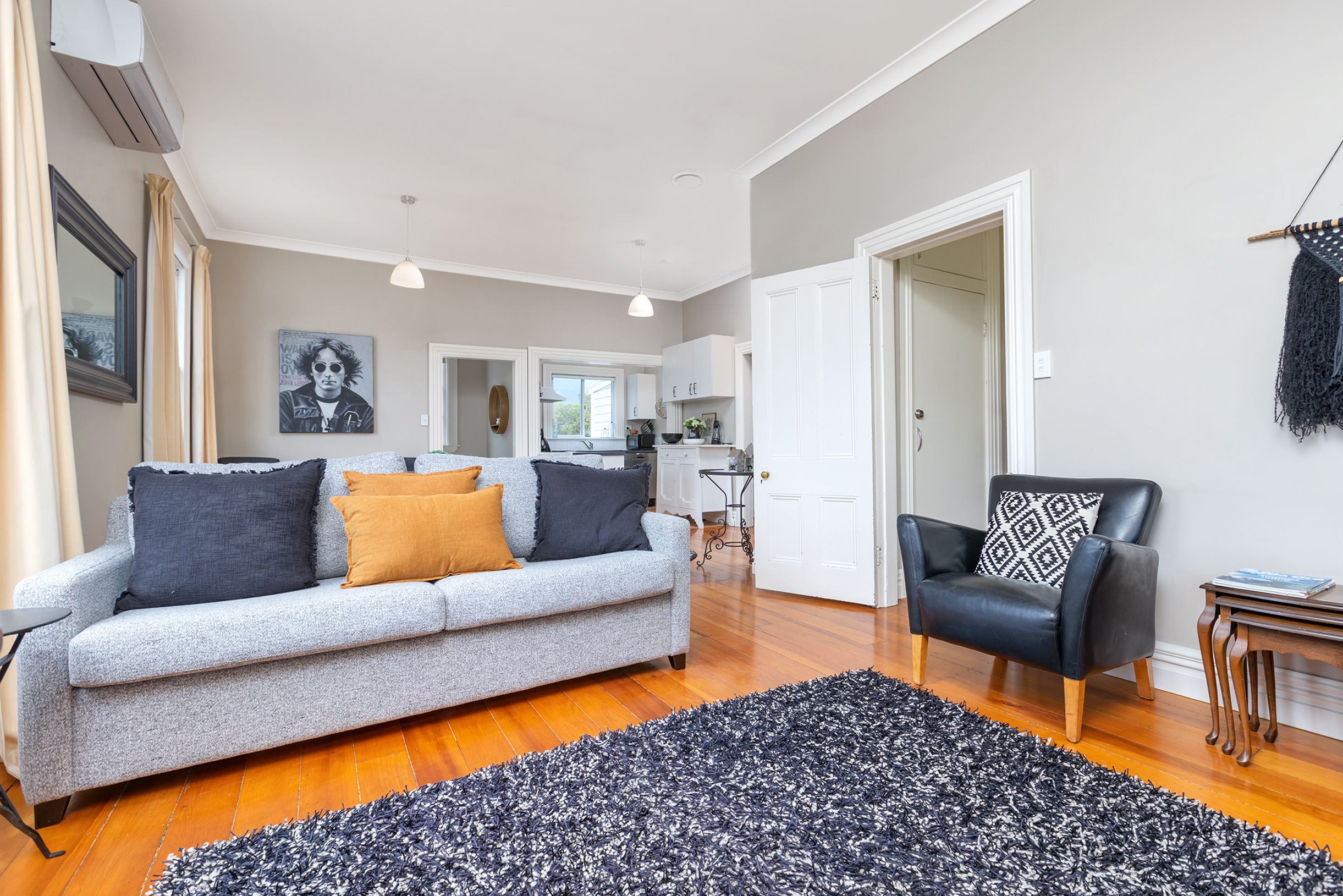 This cottage offers a modern kitchen and spacious open plan living with a woodburner. There are two large bedrooms and a single/study, roomy bathroom & separate laundry. Refurbished throughout with high stud ceilings, which gives a light and airy feel, stunning polished floorboards, and sunny veranda.